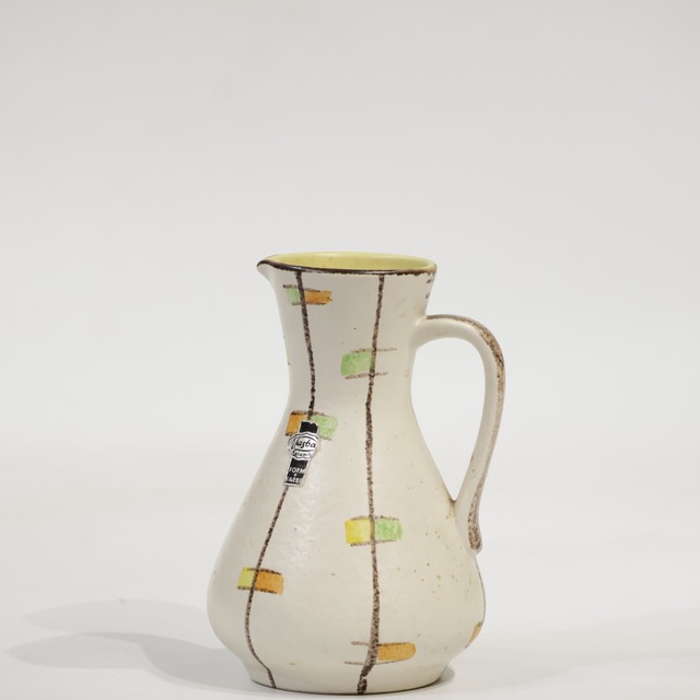 Jasba製。1960年代に発表されたForm+Farbeシリーズより。 白釉をベースに、縦に走るブラウンのラインと、その上に配された小さな色面がリズムをつくる構成になっています。 グリーンやイエロー、オレンジの彩色は、刷毛やスタンプのようなタッチで重ねられ、均一ではない揺らぎが残されています。 Form+Farbeの特徴である「形と色の分離と再構成」がそのまま現れており、釉薬の厚みや流れではなく、線と面の関係で視線を誘導するタイプの作品。いわゆるFat Lavaのひとつ前の時代の、装飾と構成によるモダンデザインの一例です。 サイズ:H;17.5cm, Top;W7.4cm×D6.9cm, Body;φ11.8cm, Bottom;φ7.8cm --Jasbaについて--- 1926年設立。 創始者であるJacob Schwaderlappのクリスチャンネームの最初の二文字Jaと姓の一文字、それに設立していたBAumbachの頭文字を合わせたものを名前にしています。 Jasbaはより複雑な形状のものや明るい色を使用していることが有名でした。 花器の生産は1971年まで。 その後1980年代までその他装飾用の陶器を生産していました。 そして現在はセラミックキッチンやバスルームのタイルを生産しています。 Jasbaは白い土を用いていました。 ロゴマークが楕円形のものは60年代~70年代生産と推察されます。 モデル番号とサイズは、大文字のNの後に配置されることがしばしば。 最も重要なデザイナーは、CilliWörsdorferとChristine Reuterでした。 ~~~~~購入の前に以下お読みください~~~~~ ※Bodyの寸法はハンドル部を含めない最大径で採寸しています。 ※ヴィンテージ品のため汚れや小さな擦り傷などがある場合があります。 ※弊社では総じて鑑賞用としてのご利用をオススメしています。取扱詳細は以下のURLをご参照下さい。 https://www.fatlava.net/p/00001 ※ご覧になられているメディア(スマートフォン・パソコン・タブレットなど)の環境や設定により、色調が実際とは多少異なる可能性がございます。 ※システム上【再入荷についてお問合せをする】というボタンが存在してしまいますが、基本的にお受けしておりません。ヴィンテージ品ということと、型違い・色違いなど相当数のバリエーションがあるので、全く同じものに出会う可能性が高くないことが理由です(もちろん、メーカーによって生産数が多いものについては、ほぼ同じ、というものが存在することもありますが、それも一つ一つで異なるため皆様に平等な対応ができないのです。。。。ごめんなさい。) その分、また新たに「これだ!」と思えるものをたくさん探していきますので、一期一会の出会いをお楽しみいただけたら幸いです。 ※資源の無駄を省くため梱包材の再利用にご協力ください。(ギフトなどの場合は仰せ下さい。) ※商業用でのテキストの無断転載・商品の無断転売はお控え下さい。 ※お客様都合での返品はお受けしておりません。 ※出荷まで約1週間頂戴しています。規定外出荷日のご希望やご相談はご購入の前に仰せ下さい。 ※佐川急便の荷物の保管期間は初回配達日を含む7日間ですのでお受け取りにはどうぞご留意くださいませ。なお、この期間を過ぎると荷物は着払いで弊社に返却されることになります。そういった場合には別途往復分(弊社戻り分+再度お送りする分)の送料をお支払いいただいた上で出荷させて頂きます。 ※発送手続き完了後のキャンセルにつきましては上記諸経費を差し引いた金額をご返金させていただきます。 ※複数購入の際、できる限り梱包をおまとめして配送致します。 その際送料に差分が生じた場合、クレジットでのお支払いの場合はこちらで減額させて頂きます。その他のお支払い方法をご選択の場合には、次回ご利用頂けるクーポンを発行しています。ご不明な点などございましたらご購入前にお問合せ下さい。 上記ご理解頂きました上でのご購入をお願いします。