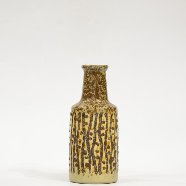 Scheurich製。 厚みのあるベージュ系釉が上部から流れ落ち、縁に沿って丸みを帯びた滴りとして定着した構成。 中央には深いグリーンの帯を配し、その上に円形の黄釉が規則的に並び、レリーフによって一つ一つが縁取られています。 下部は細かな斑点を含むブラウンのグラデーションで、焼成中の釉薬の沈降と流動がそのまま表面に現れた質感。 帯状の装飾と滴りのリズムが重なり、水平と垂直の動きが交差する設計の一点です。 サイズ:H;20.7cm, Top;φ6.8cm, Body;φ11.9cm, Bottom;φ8.3cm ————Scheurichについて———— 当時のドイツの窯業の黄金期を支えた最もメジャーなレーベルの一つです。(現在は園芸用品の生産にシフトチェンジ)。Scheurich(シューリッヒ)は、元々1927年 にAlois Scheurich(アロイス・シューリッヒ)に よって創 設され 、手頃な価格の陶器やガラス製の装飾品 、家 庭用品などを幅広販売していた。共同運営者が参画してからはScheurich&Greulich( シューリッヒ &グロイリッヒ 、Greulichは独語で“凄まじい”の意)という社名 で知られ、この頃の作品には「S&G」のラベルが 貼られたものが多く見られます。 事業が拡大すると、Scheurichは自身で陶器を製造することを 決心し、1954年にクラインホイバッハに工場を設立しました。 同社は急速に成長し、1950~80年代には陶 器製造の分野でドイツ最大のメーカーとなり、今日も確固たる地位を維持しています。形状に加えて釉薬でも、当時は最も幅広い品揃えを誇った他、輸出量も最大だったため、現在でも同社の製品はよく見られます。特に円筒形を基調にし たシンプルな形状で、型押し模様のある床置き 花瓶が代表的。色彩については当時主流だっ た赤やオレンジから、クリーム、ベージュ、茶色 などが多くを占めています。 1955年からの主要デザイナーはHeinz Siery (ハインツ・ジーリー)で、スタイリッシュに角度 をつけた持ち手のある先細り型「271」の水差し をデザインした。後継者や同僚には、1970~80 年代にデザインを手掛けたA. Seide(A・ザイド)、1955年から釉薬の装飾を制作したOswald Kleudgen(オスヴァルト・クロイジェン)などが 在籍していました。その他のデザイナーについては、会社の記録が保存されておらず分かっておりません。 Scheurichの製品には白い粘土が使われて おり、マークは型押しされています。マークには3 ~4桁の型番、その後ハイフンに続いてセンチ メートル単位でのサイズと「W.GERMANY」の表 記があり、底の縁に沿って半円形にマークが型 押しされている場合が多い。その他のマークが 型押しされているのは後期の作品である。品質 は高水準で安定しており、多くの型が同じフォ ルムでさまざまな装飾パターンを展開しているため、同一の型で数多くの作品を揃えるコレク ターも少なくないです。 ~~~~~購入の前に以下お読みください~~~~~ ※Bodyの寸法はハンドル部を含めない最大径で採寸しています。 ※ヴィンテージ品のため汚れや小さな擦り傷などがある場合があります。 ※弊社では総じて鑑賞用としてのご利用をオススメしています。取扱詳細は以下のURLをご参照下さい。 https://www.fatlava.net/p/00001 ※ご覧になられているメディア(スマートフォン・パソコン・タブレットなど)の環境や設定により、色調が実際とは多少異なる可能性がございます。 ※システム上【再入荷についてお問合せをする】というボタンが存在してしまいますが、基本的にお受けしておりません。ヴィンテージ品ということと、型違い・色違いなど相当数のバリエーションがあるので、全く同じものに出会う可能性が高くないことが理由です(もちろん、メーカーによって生産数が多いものについては、ほぼ同じ、というものが存在することもありますが、それも一つ一つで異なるため皆様に平等な対応ができないのです。。。。ごめんなさい。) その分、また新たに「これだ!」と思えるものをたくさん探していきますので、一期一会の出会いをお楽しみいただけたら幸いです。 ※資源の無駄を省くため梱包材の再利用にご協力ください。(ギフトなどの場合は仰せ下さい。) ※商業用でのテキストの無断転載・商品の無断転売はお控え下さい。 ※お客様都合での返品はお受けしておりません。 ※出荷まで約1週間頂戴しています。規定外出荷日のご希望やご相談はご購入の前に仰せ下さい。 ※佐川急便の荷物の保管期間は初回配達日を含む7日間ですのでお受け取りにはどうぞご留意くださいませ。なお、この期間を過ぎると荷物は着払いで弊社に返却されることになります。そういった場合には別途往復分(弊社戻り分+再度お送りする分)の送料をお支払いいただいた上で出荷させて頂きます。 ※発送手続き完了後のキャンセルにつきましては上記諸経費を差し引いた金額をご返金させていただきます。 ※複数購入の際、できる限り梱包をおまとめして配送致します。 その際送料に差分が生じた場合、クレジットでのお支払いの場合はこちらで減額させて頂きます。その他のお支払い方法