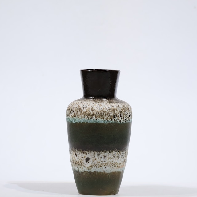 Scheurich製。 縦にすっと伸びる端正なフォルムに、層状に重なる釉薬表現が印象的な一点です。 上部の深いブラックから、クリーム色の発泡感ある層、落ち着いたグリーンへと移ろう色調は、焼成時の釉薬の反応がそのまま表情として定着したもの。粒状感とにじみが混ざり合い、奥行きのある景色をつくっています。 サイズ:H;20.9cm, Top;φ6.5cm, Body;φ11.3cm, Bottom;φ6.5cm ————Scheurichについて———— 当時のドイツの窯業の黄金期を支えた最もメジャーなレーベルの一つです。(現在は園芸用品の生産にシフトチェンジ)。Scheurich(シューリッヒ)は、元々1927年 にAlois Scheurich(アロイス・シューリッヒ)に よって創 設され 、手頃な価格の陶器やガラス製の装飾品 、家 庭用品などを幅広販売していた。共同運営者が参画してからはScheurich&Greulich( シューリッヒ &グロイリッヒ 、Greulichは独語で“凄まじい”の意)という社名 で知られ、この頃の作品には「S&G」のラベルが 貼られたものが多く見られます。 事業が拡大すると、Scheurichは自身で陶器を製造することを 決心し、1954年にクラインホイバッハに工場を設立しました。 同社は急速に成長し、1950~80年代には陶 器製造の分野でドイツ最大のメーカーとなり、今日も確固たる地位を維持しています。形状に加えて釉薬でも、当時は最も幅広い品揃えを誇った他、輸出量も最大だったため、現在でも同社の製品はよく見られます。特に円筒形を基調にし たシンプルな形状で、型押し模様のある床置き 花瓶が代表的。色彩については当時主流だっ た赤やオレンジから、クリーム、ベージュ、茶色 などが多くを占めています。 1955年からの主要デザイナーはHeinz Siery (ハインツ・ジーリー)で、スタイリッシュに角度 をつけた持ち手のある先細り型「271」の水差し をデザインした。後継者や同僚には、1970~80 年代にデザインを手掛けたA. Seide(A・ザイド)、1955年から釉薬の装飾を制作したOswald Kleudgen(オスヴァルト・クロイジェン)などが 在籍していました。その他のデザイナーについては、会社の記録が保存されておらず分かっておりません。 Scheurichの製品には白い粘土が使われて おり、マークは型押しされています。マークには3 ~4桁の型番、その後ハイフンに続いてセンチ メートル単位でのサイズと「W.GERMANY」の表 記があり、底の縁に沿って半円形にマークが型 押しされている場合が多い。その他のマークが 型押しされているのは後期の作品である。品質 は高水準で安定しており、多くの型が同じフォ ルムでさまざまな装飾パターンを展開しているため、同一の型で数多くの作品を揃えるコレク ターも少なくないです。 ~~~~~購入の前に以下お読みください~~~~~ ※Bodyの寸法はハンドル部を含めない最大径で採寸しています。 ※ヴィンテージ品のため汚れや小さな擦り傷などがある場合があります。 ※弊社では総じて鑑賞用としてのご利用をオススメしています。取扱詳細は以下のURLをご参照下さい。 https://www.fatlava.net/p/00001 ※ご覧になられているメディア(スマートフォン・パソコン・タブレットなど)の環境や設定により、色調が実際とは多少異なる可能性がございます。 ※システム上【再入荷についてお問合せをする】というボタンが存在してしまいますが、基本的にお受けしておりません。ヴィンテージ品ということと、型違い・色違いなど相当数のバリエーションがあるので、全く同じものに出会う可能性が高くないことが理由です(もちろん、メーカーによって生産数が多いものについては、ほぼ同じ、というものが存在することもありますが、それも一つ一つで異なるため皆様に平等な対応ができないのです。。。。ごめんなさい。) その分、また新たに「これだ!」と思えるものをたくさん探していきますので、一期一会の出会いをお楽しみいただけたら幸いです。 ※資源の無駄を省くため梱包材の再利用にご協力ください。(ギフトなどの場合は仰せ下さい。) ※商業用でのテキストの無断転載・商品の無断転売はお控え下さい。 ※お客様都合での返品はお受けしておりません。 ※出荷まで約1週間頂戴しています。規定外出荷日のご希望やご相談はご購入の前に仰せ下さい。 ※佐川急便の荷物の保管期間は初回配達日を含む7日間ですのでお受け取りにはどうぞご留意くださいませ。なお、この期間を過ぎると荷物は着払いで弊社に返却されることになります。そういった場合には別途往復分(弊社戻り分+再度お送りする分)の送料をお支払いいただいた上で出荷させて頂きます。 ※発送手続き完了後のキャンセルにつきましては上記諸経費を差し引いた金額をご返金させていただきます。 ※複数購入の際、できる限り梱包をおまとめして配送致します。 その際送料に差分が生じた場合、クレジットでのお支払いの場合はこちらで減額させて頂きます。その他のお支払い方法をご選択の場合には、次回ご利用頂けるクーポンを発行しています。ご不明な点などございましたらご購入前にお問