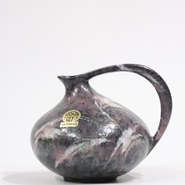 Ruscha製。 コンパクトながら、やわらかな膨らみを持つシルエットに深い表情をまとった一点。 グレーとブラウン、そして仄かなグリーンの釉薬が層のように重なり合いつつも、穏やかで静かな佇まいが印象的です。 サイズ:H;13.5cm, Top;φ3.7cm, Body;φ10cm, Bottom;φ5.2cm ----------------------Ruschaについて------------------------- 大きな影響力のあるRuschaは、Georg Schardtによってラ インバッハに創設され、最初はKlein & Schardt、その後はSchardt&Söhne(シャルト&ズーネ)として知られていました。 Georgの次男であるRudolf Schardt(ルドルフ・シャルト)が1948年に同社を継いだ際、自身のファーストネームの最初の2文字を入れた 「R u s c h a」に社名を変更しました。 R u d o l fはイノ ベーターであると同時に実業家でもあり、1950 年代の陶器ブームへの参入も自身で統括しました。 1950年代前半はCilli Wörsdörfer(ツィリ・ ヴェルスデルファー)が 芸術作品部 門の責任者を務め、「Milano(ミラノ)」や「Zebra(ゼブ ラ)」のような手描きのデザインが有名であっ た。1959年には、1951年から生産部門の責任者を務めたOtto Gerharz(オットー・ゲルハル ツ)がVulkano釉薬を考案した。Gerharzは、自 身で起業するべくRuschaを離れるまで、他に も多くの革新的な釉薬を作り出した。とりわけ Vulkano釉薬は形成される際に分水嶺を作り、 直線的なデザインから、滴り落ちるファッショナ ブルな釉薬のスタイルへと変化させる画期的 なものであった。 形状の多くはKurt Tschörner(クルト・チェル ナー/1912-1987)がデザインしたもので、有 名な「313」の水差しも、1954年に発表された 革新的な新シリーズに含まれていた。その他の 著名デザイナーとしては、1958~61年にErnst Borens(エルンスト・ボレンス)、1950年代半ば にHans Welling(ハンス・ヴェリンク)、Adele Bolz(アディーレ・ボルツ)などがいた。このう ちBolzは、1959~60年にかけて「Filigran(線 条細工)」シリーズと壁掛け用の飾り板のデザ インを手掛け、1950年代の典型的なスタイル からの脱却に寄与した。またHeinz Siery(ハ インツ・ジーリー)は1967~96年までデザイン の責任者を務め、1970年代にはJutta Johanni (ユッタ・ヨハンニ)もいくつかのデザインを制作した。 本体部分には赤または白の粘土が使用され、 マークには3桁の型番に続き、時にスラッシュを 挟んでサイズ表記が型押しされている。サイズ には1(最小)から6(最大)までの段階がある。Ruschaが閉鎖した後、社名と多くのデザイ ナーはScheurich(シューリッヒ)に買収されたが、 Scheurichは今でも「Ruscha Art」というブランド名で、ヴィンテージに着想を得たデザイ ンを制作しています。 ~~~~~購入の前に以下お読みください~~~~~ ※Bodyの寸法はハンドル部を含めない最大径で採寸しています。 ※ヴィンテージ品のため汚れや小さな擦り傷などがある場合があります。 ※弊社では総じて鑑賞用としてのご利用をオススメしています。取扱詳細は以下のURLをご参照下さい。 https://www.fatlava.net/p/00001 ※ご覧になられているメディア(スマートフォン・パソコン・タブレットなど)の環境や設定により、色調が実際とは多少異なる可能性がございます。 ※システム上【再入荷についてお問合せをする】というボタンが存在してしまいますが、基本的にお受けしておりません。ヴィンテージ品ということと、型違い・色違いなど相当数のバリエーションがあるので、全く同じものに出会う可能性が高くないことが理由です(もちろん、メーカーによって生産数が多いものについては、ほぼ同じ、というものが存在することもありますが、それも一つ一つで異なるため皆様に平等な対応ができないのです。。。。ごめんなさい。) その分、また新たに「これだ!」と思えるものをたくさん探していきますので、一期一会の出会いをお楽しみいただけたら幸いです。 ※資源の無駄を省くため梱包材の再利用にご協力ください。(ギフトなどの場合は仰せ下さい。) ※商業用でのテキストの無断転載・商品の無断転売はお控え下さい。 ※お客様都合での返品はお受けしておりません。 ※出荷まで約1週間頂戴しています。規定外出荷日のご希望やご相談はご購入の前に仰せ下さい。 ※複数購入の際、できる限り梱包をおまとめして配送致します。 その際送料に差分が生じた場合、クレジットでのお支払いの場合はこちらで減額させて頂きます。その他のお支払い方法をご選択の場合には、次回ご利用頂けるクーポンを発行しています。ご不明な点などございましたらご購入前にお問合せ下さい。 上記ご理解頂きました上でのご購入をお願いします。