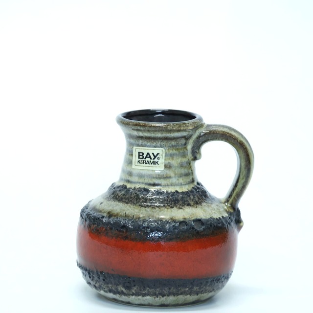 Bay Keramik社製。 焦げ茶の首元から、泡のような質感をもつ白の釉薬が流れ落ち、その下には鮮やかなレッドが力強く展開されています。釉薬の重なりによって自然に生まれる境界線が、まるで雪解けとともに地表が現れる瞬間を切り取ったような表情を見せています。 胴部のボリューム感と、口元のすぼまりのバランスも美しく、Fat Lava期のBayらしい造形です。 サイズ:H;12.3cm, Top;φ4.4cm, Body;φ10.3cm, Bottom;φ8.5cm ---------Bay Keramikについて---------------- 1933年、Bay Keramikは Eduard Bayによって、陶器産 業で知られていたランスバッハ=バウムバッハに 設立されました。 当初は調理用の鍋も含め、素焼きの テラコッタの食器類を中心に生産が行われてい ました。 その後1936年には釉薬が導入され、翌1937年 には鋳造が開始されたことで、より速く安定した生 産が可能になりました。 第二次世界大戦後に食器の 生産が再開され、1950年代前半からは花瓶など の装飾品も登場しました。 1956年までには120種類の形状で18種類の図 柄が生産されるようになり、1960年には図柄の種 類は29にまで増加しました。 図柄の多くは曲線もしく は角ばったデザインで構成され、黒色の部分や線 と対照を成すように明るい色彩が用いられている ものが多く見られます。 同様に形状も湾曲していて、 非対称な場合もしばしば存在します。 中でもBodo Mansは1959~75年までの期間に 最も活躍したデザイナーで、「Ravenna」などコレクターに人気のあるデザインを手掛 けていました。 1950年代後半以降、Bay Keramikは製品の種類 や品質、生産量の面で業界をリードする代表的な 企業となりました。 1960年代からのスタイルとしては、 当時広く流行していた色彩の釉薬(マットまたは 光沢あり)を使用し、シンプルなフォルムの上に様 式化した花の図柄の型押しや幾何学模様をあし らったものが多く、Scheurichのも のと混同されがちです。 本体には白い粘土が使われている。底のマーク は型押しされており、「Bay」の名が確認できるこ とが多いです。 数字が示しているのは、2~3桁の形 状番号とセンチメートル単位のサイズ表記で、間 には通常スペースがあるが、ハイフンで区切られ ている場合もある。また、一般的に「WEST」または 「W.-GERMANY」の表記が用いられています。 Bay Keramikは装飾的な陶器の製造を1971年 にやめており、現在は「römertopfeと呼ばれる素焼きテラコッタの蓋付きキャセ ロール鍋)」のメーカーとして知られています。 ~~~~~購入の前に以下お読みください~~~~~ ※Bodyの寸法はハンドル部を含めない最大径で採寸しています。 ※ヴィンテージ品のため汚れや小さな擦り傷などがある場合があります。 ※弊社では総じて鑑賞用としてのご利用をオススメしています。取扱詳細は以下のURLをご参照下さい。 https://www.fatlava.net/p/00001 ※ご覧になられているメディア(スマートフォン・パソコン・タブレットなど)の環境や設定により、色調が実際とは多少異なる可能性がございます。 ※システム上【再入荷についてお問合せをする】というボタンが存在してしまいますが、基本的にお受けしておりません。ヴィンテージ品ということと、型違い・色違いなど相当数のバリエーションがあるので、全く同じものに出会う可能性が高くないことが理由です(もちろん、メーカーによって生産数が多いものについては、ほぼ同じ、というものが存在することもありますが、それも一つ一つで異なるため皆様に平等な対応ができないのです。。。。ごめんなさい。) その分、また新たに「これだ!」と思えるものをたくさん探していきますので、一期一会の出会いをお楽しみいただけたら幸いです。 ※資源の無駄を省くため梱包材の再利用にご協力ください。(ギフトなどの場合は仰せ下さい。) ※商業用でのテキストの無断転載・商品の無断転売はお控え下さい。 ※お客様都合での返品はお受けしておりません。 ※出荷まで約1週間頂戴しています。規定外出荷日のご希望やご相談はご購入の前に仰せ下さい。 ※佐川急便の荷物の保管期間は初回配達日を含む7日間ですのでお受け取りにはどうぞご留意くださいませ。なお、この期間を過ぎると荷物は着払いで弊社に返却されることになります。そういった場合には別途往復分(弊社戻り分+再度お送りする分)の送料をお支払いいただいた上で出荷させて頂きます。 ※発送手続き完了後のキャンセルにつきましては上記諸経費を差し引いた金額をご返金させていただきます。 ※複数購入の際、できる限り梱包をおまとめして配送致します。 その際送料に差分が生じた場合、クレジットでのお支払いの場合はこちらで減額させて頂きます。その他のお支払い方法をご選択の場合には、次回ご利用頂けるクーポンを発行しています。ご不明な点などございましたらご購入前にお問合せ下さい。 上記ご理解頂きました上でのご購入をお願いします。