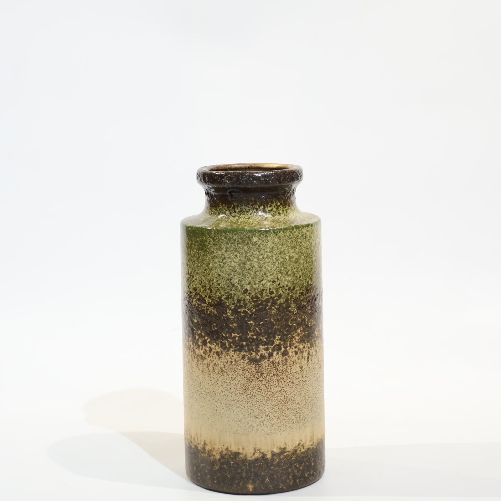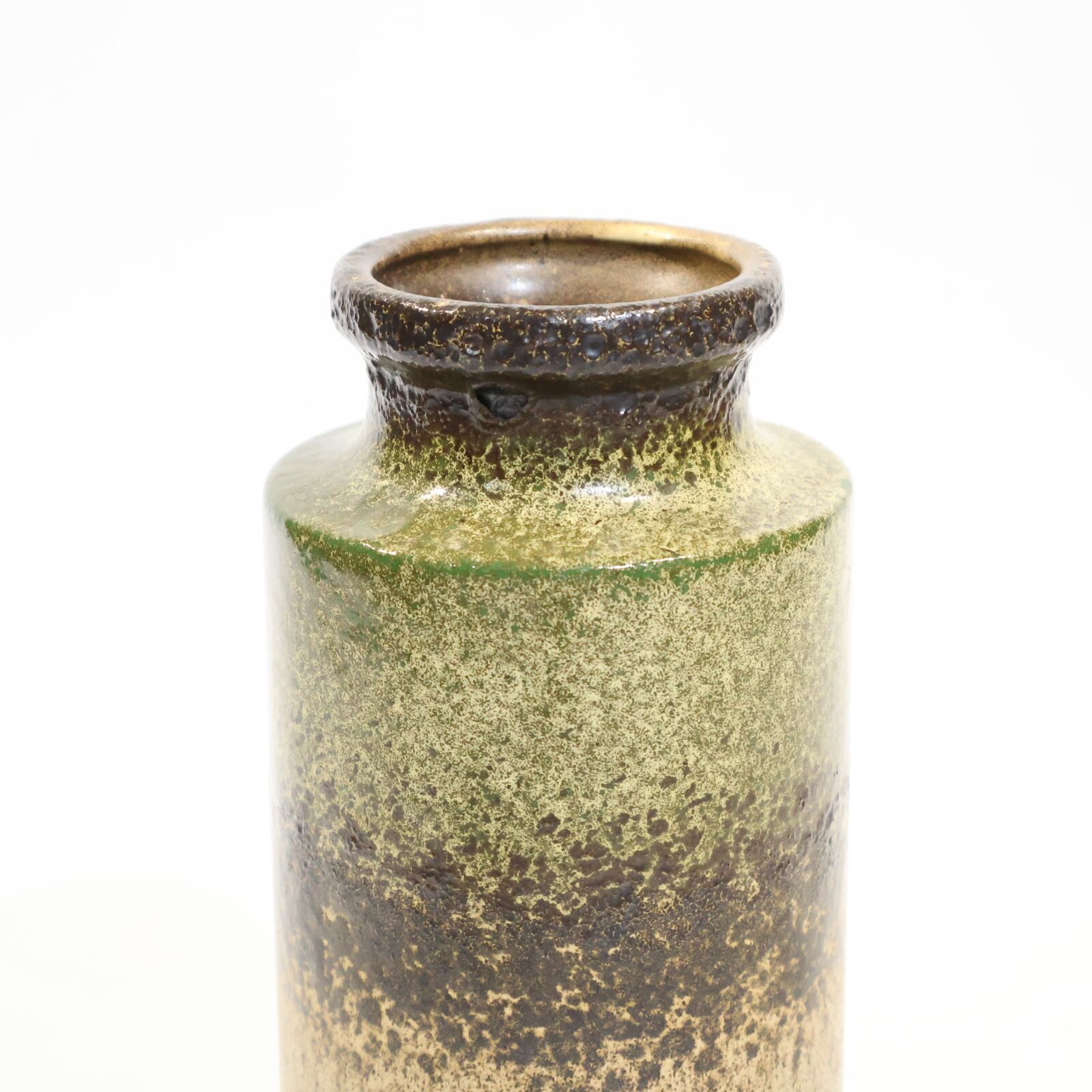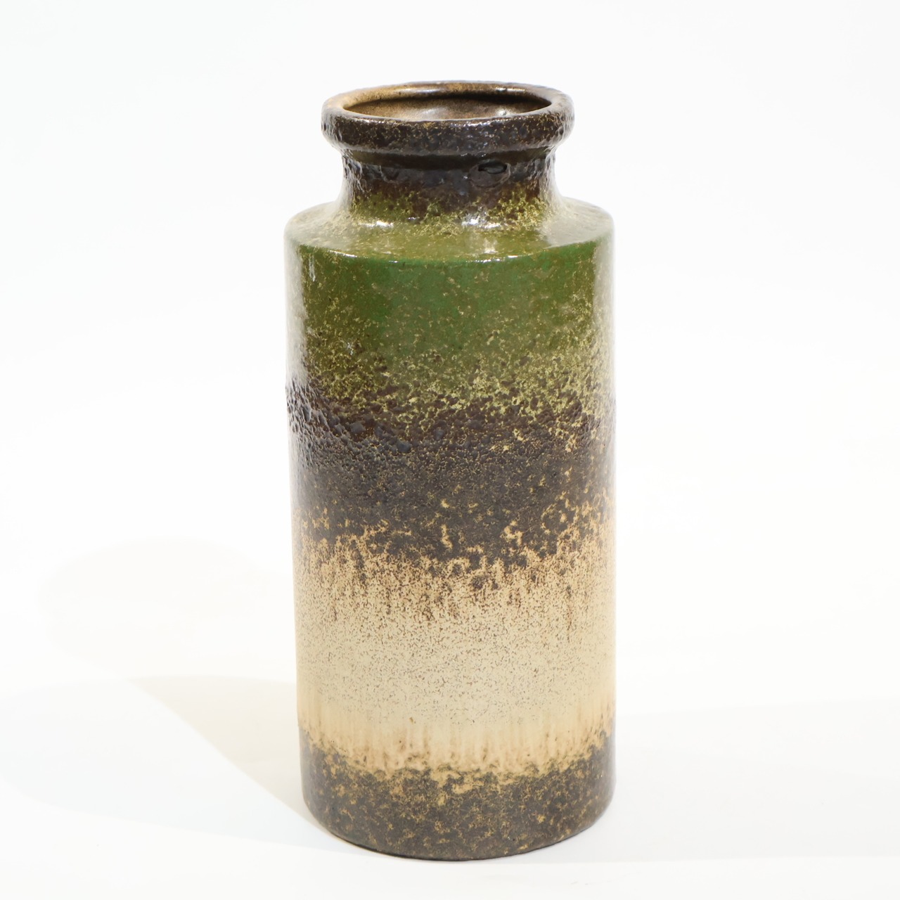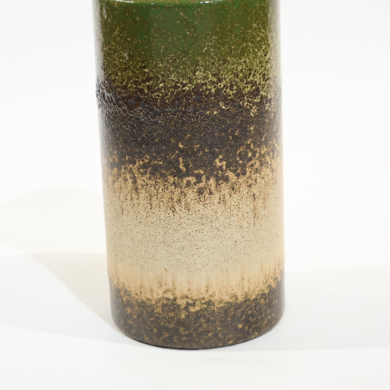 同社は急速に成長し、1950~80年代には陶 器製造の分野でドイツ最大のメーカーとなり、今日も確固たる地位を維持しています。形状に加えて釉薬でも、当時は最も幅広い品揃えを誇った他、輸出量も最大だったため、現在でも同社の製品はよく見られます。特に円筒形を基調にし たシンプルな形状で、型押し模様のある床置き 花瓶が代表的。色彩については当時主流だっ た赤やオレンジから、クリーム、ベージュ、茶色 などが多くを占めています。