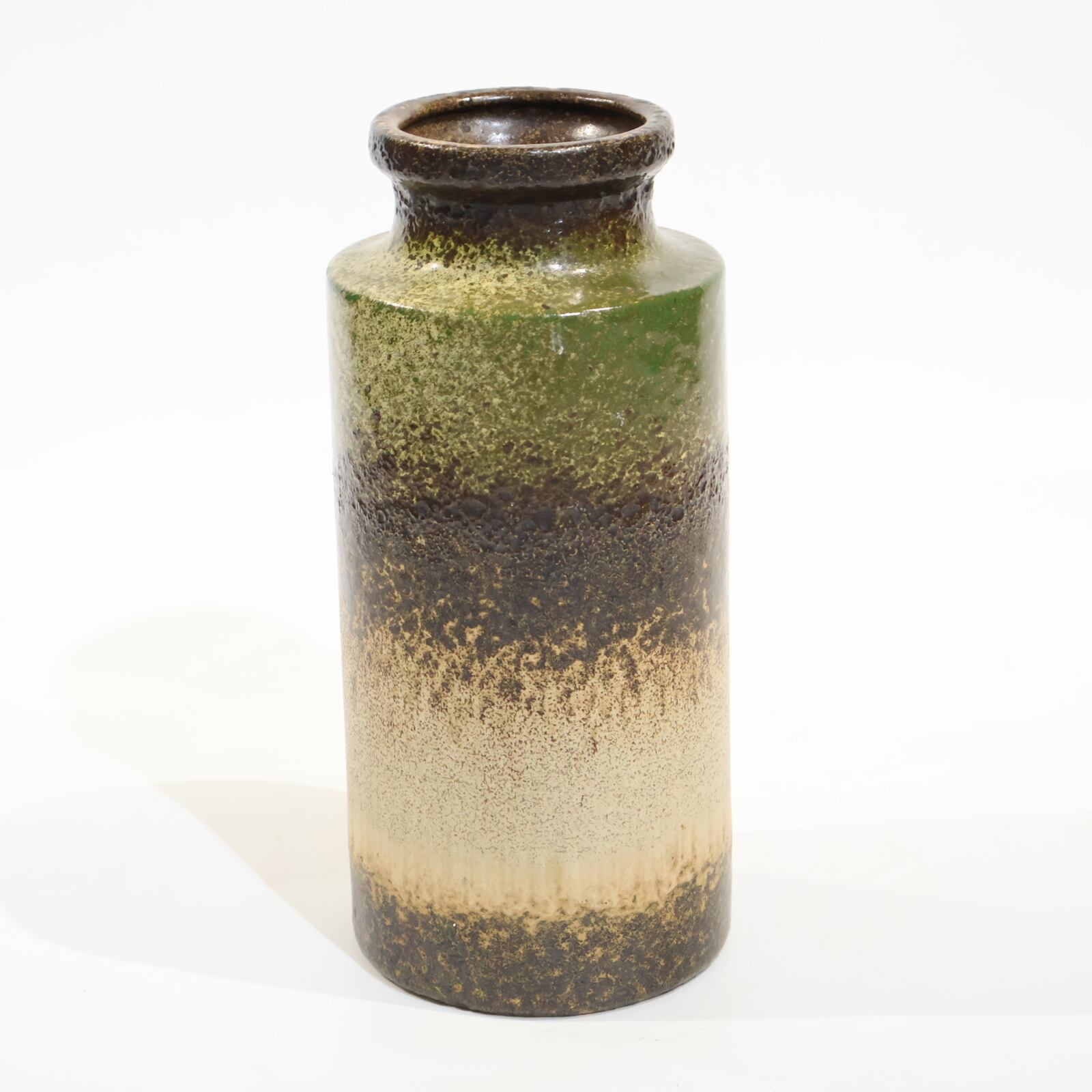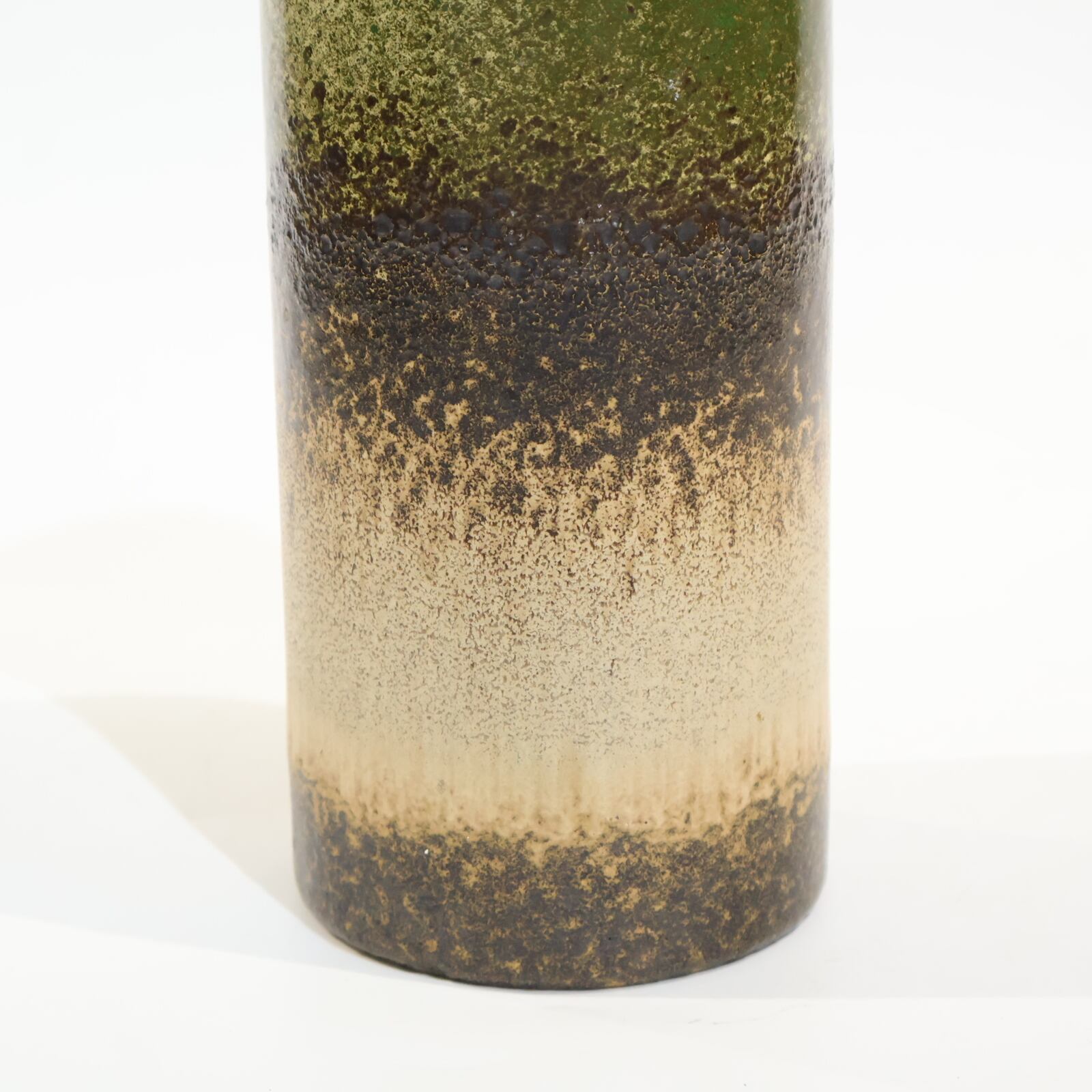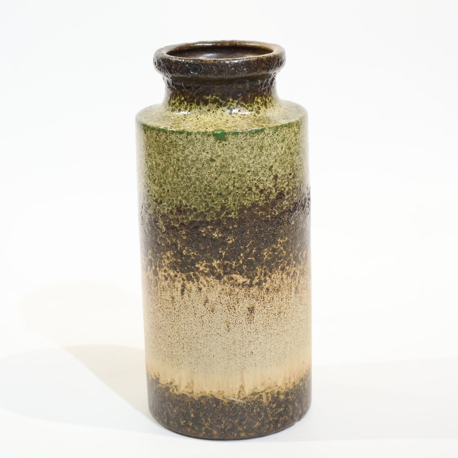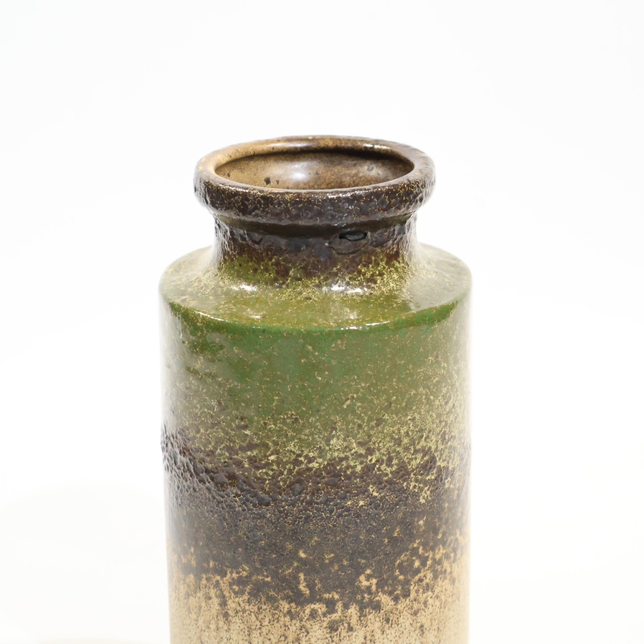 同社は急速に成長し、1950~80年代には陶 器製造の分野でドイツ最大のメーカーとなり、今日も確固たる地位を維持しています。形状に加えて釉薬でも、当時は最も幅広い品揃えを誇った他、輸出量も最大だったため、現在でも同社の製品はよく見られます。特に円筒形を基調にし たシンプルな形状で、型押し模様のある床置き 花瓶が代表的。色彩については当時主流だっ た赤やオレンジから、クリーム、ベージュ、茶色 などが多くを占めています。