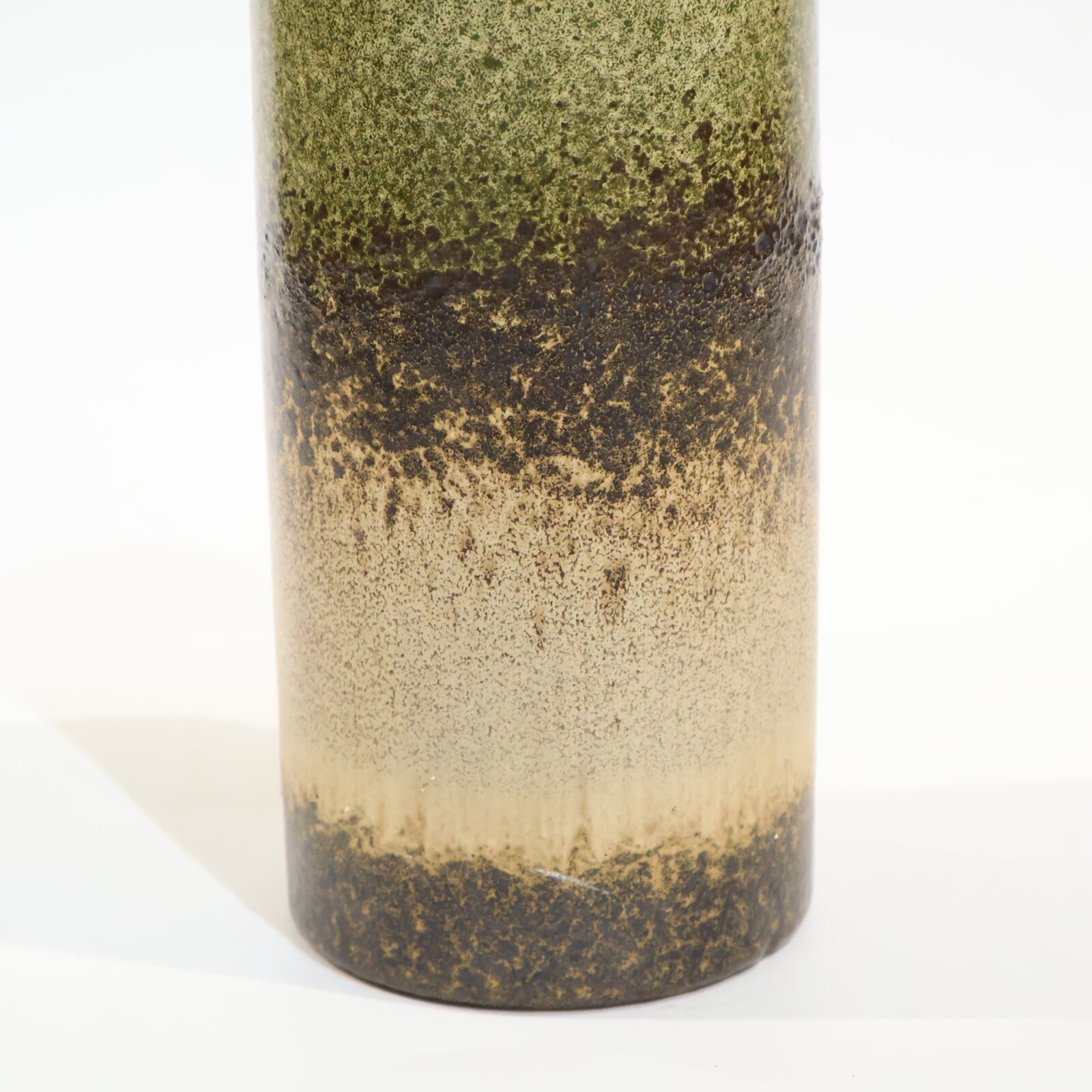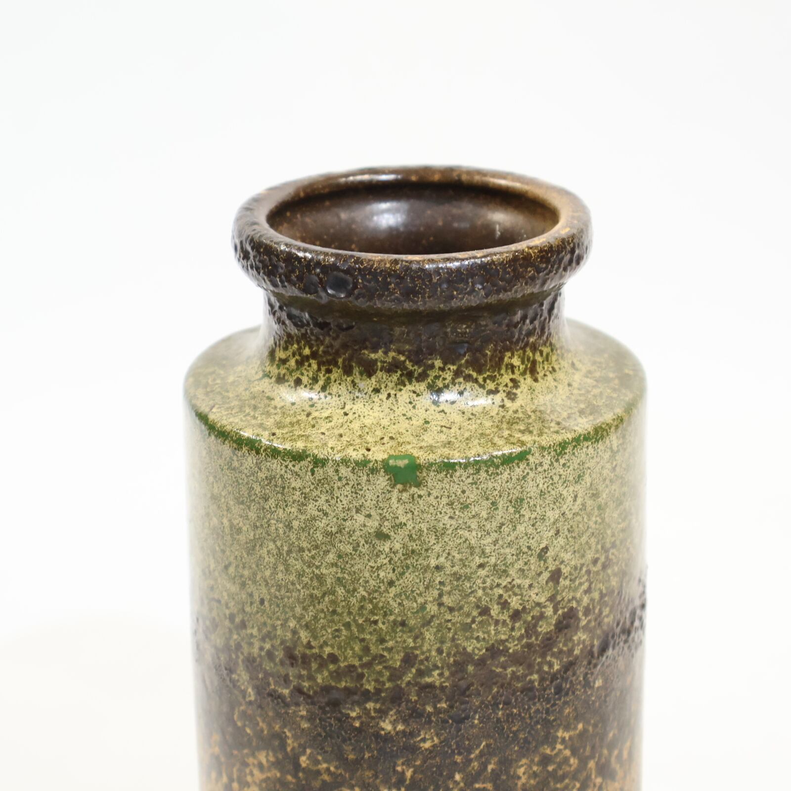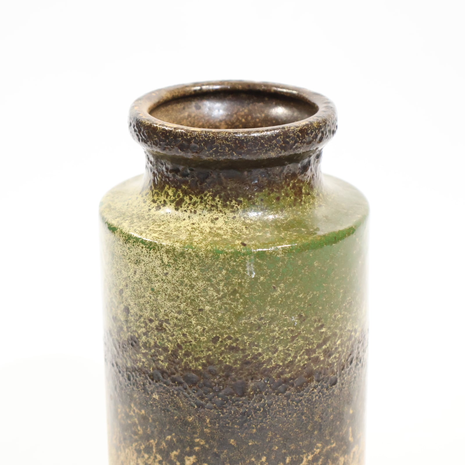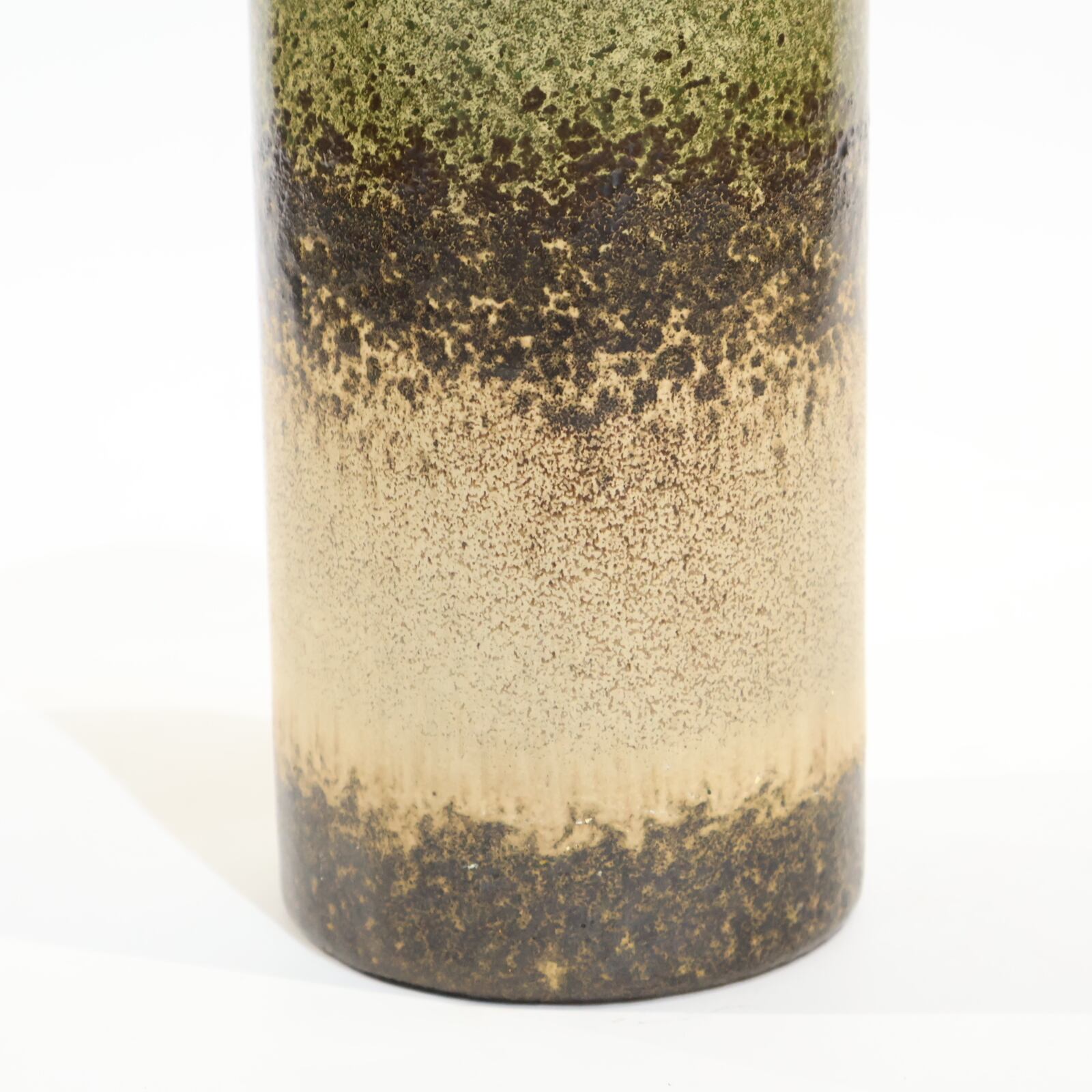 同社は急速に成長し、1950~80年代には陶 器製造の分野でドイツ最大のメーカーとなり、今日も確固たる地位を維持しています。形状に加えて釉薬でも、当時は最も幅広い品揃えを誇った他、輸出量も最大だったため、現在でも同社の製品はよく見られます。特に円筒形を基調にし たシンプルな形状で、型押し模様のある床置き 花瓶が代表的。色彩については当時主流だっ た赤やオレンジから、クリーム、ベージュ、茶色 などが多くを占めています。