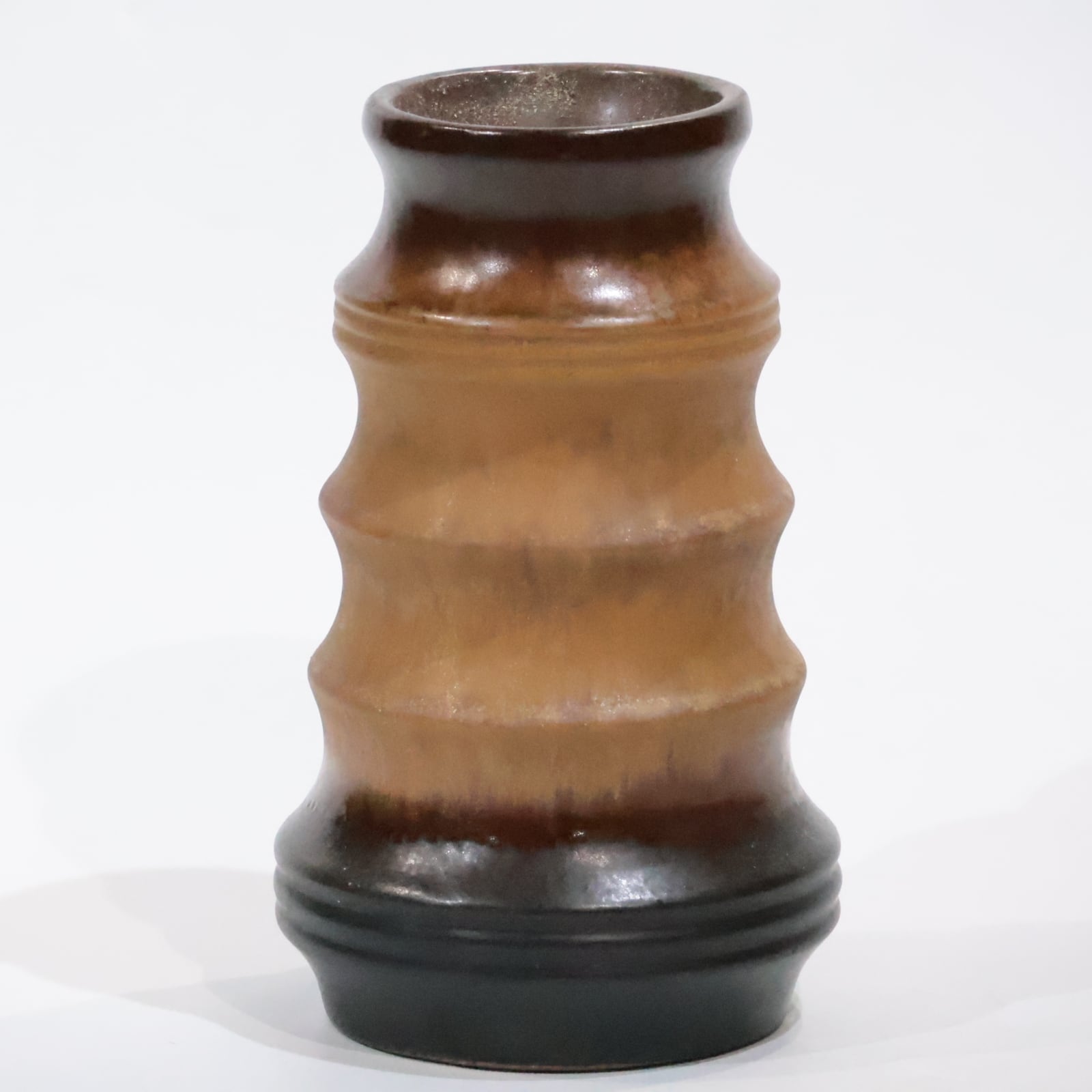 胴部の波打つような立体造形は、どこか竹節のようでもあり、有機的な美しさとクラフト的な手仕事の魅力が共存しています。シンプルで潔い佇まいでありながら、その造形と釉薬の妙だけでしっかりとした存在感を放つ一品です。