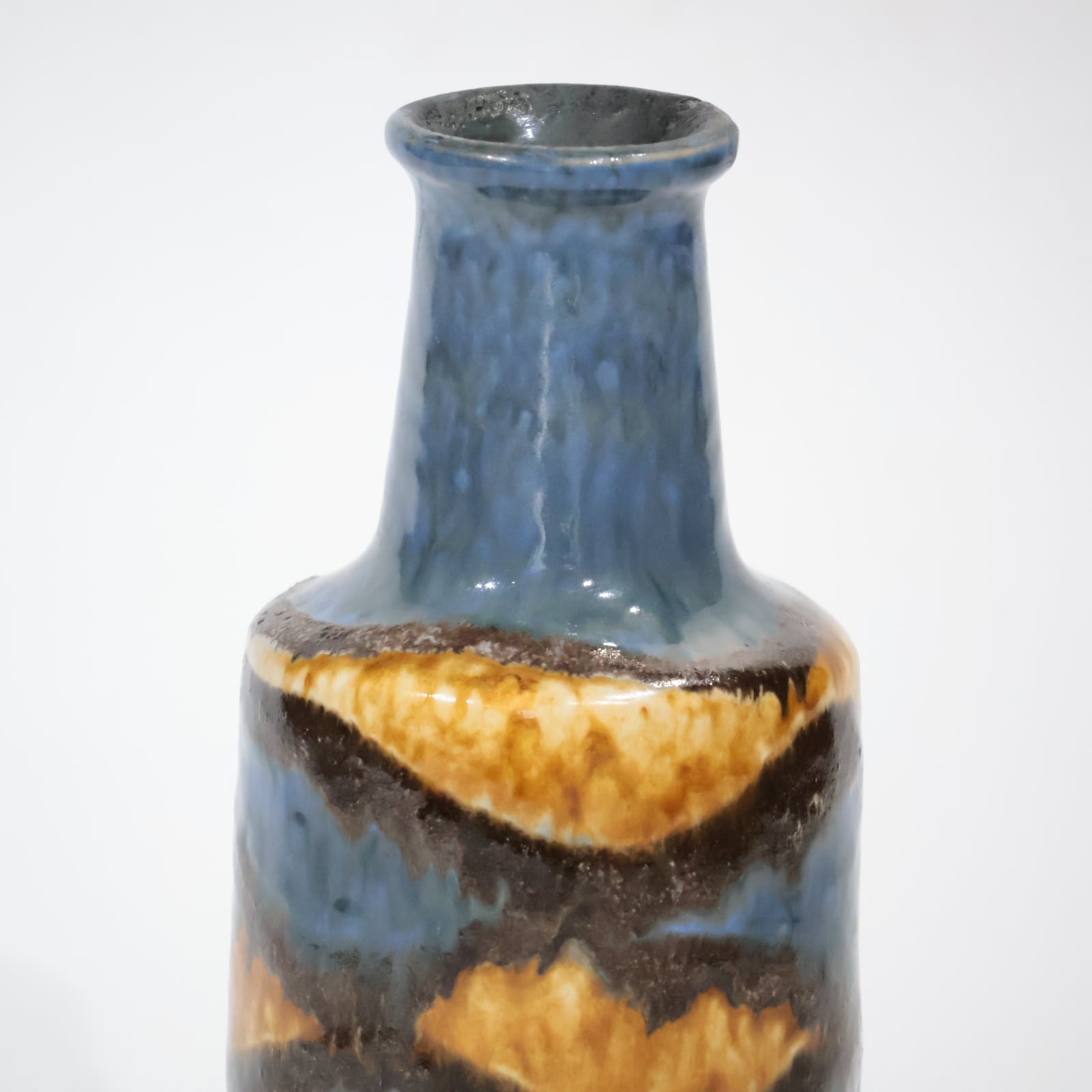 胴部には連続するしずく型のような浮き彫り装飾が施されており、そこに掛けられた深い藍色と黄土色の釉薬が、光沢のある濃淡をつくり出しています。
