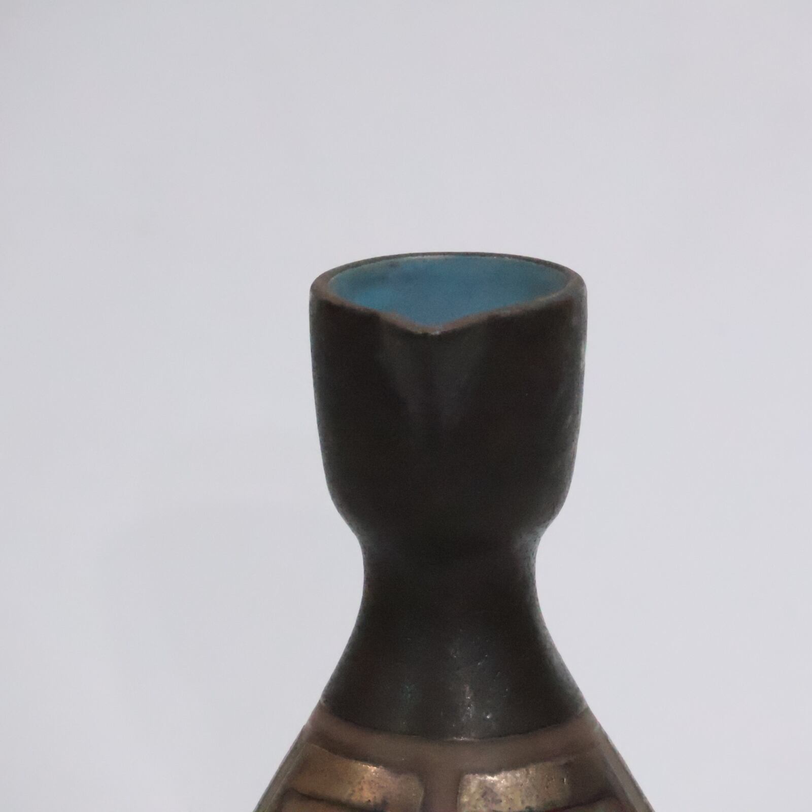 細長い首から広がる肩、直線的なハンドル、そして胴部に施されたラビリンス状の装飾が、まるで古代建築の断片を写し取ったかのよう。静かに佇みながらも、確かな造形と質感が空間に美しい緊張感を与えます。