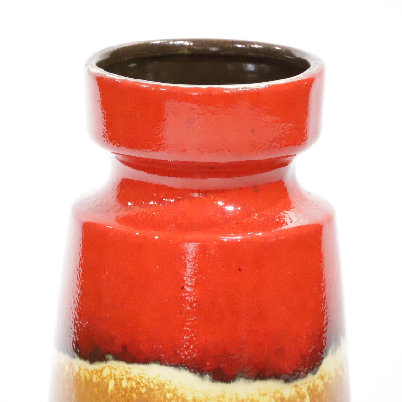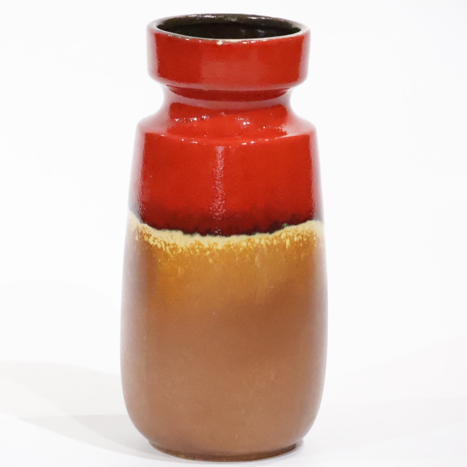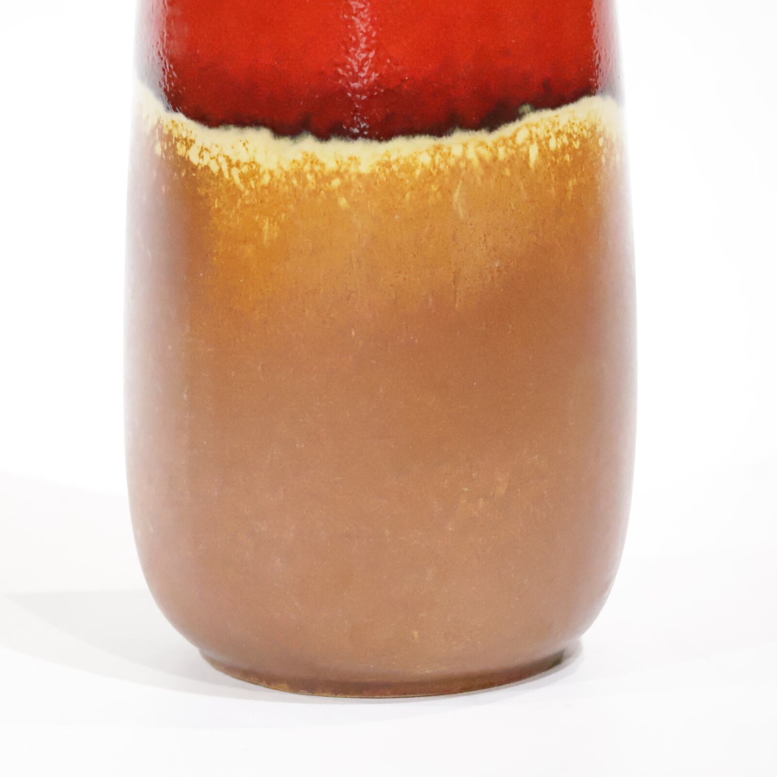 艶やかな赤とブラウンのグラデーションが印象的な作品です。上部には深みのあるレッドが鮮やかに発色し、その境界に沿ってイエローの釉薬がにじむように広がっています。まるで火山のマグマが冷えて地層を描いているかのような色彩構成で、Scheurichの高度な釉薬技術が感じられます。