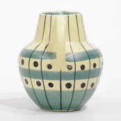 この花瓶は、優美なラインと柔らかな色合いで空間に穏やかな印象を与えます。イエローとグリーンのカラーリングに加え、ドットとライン状の装飾が描かれており、シンプルながらもアートの一片を感じさせるデザインです。