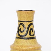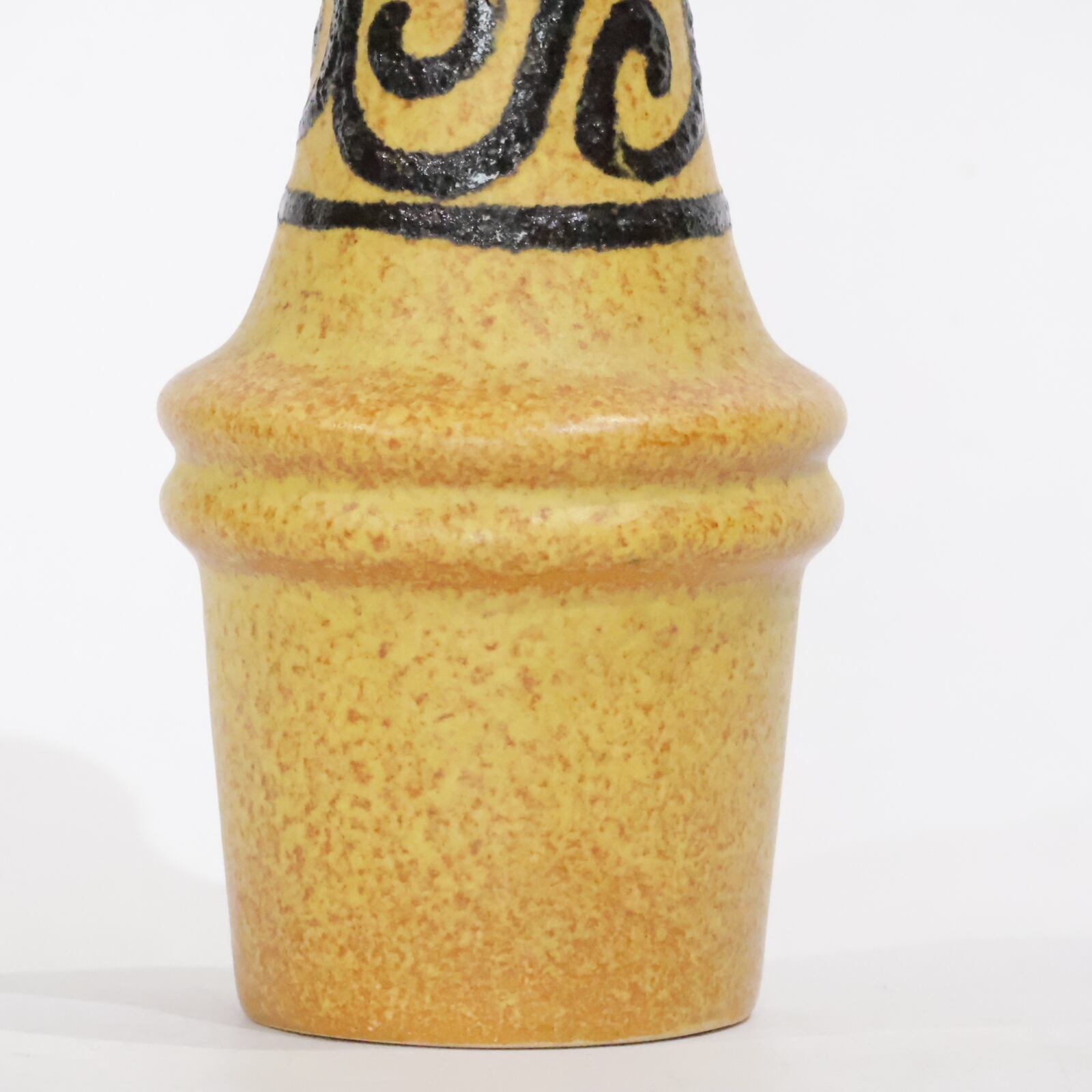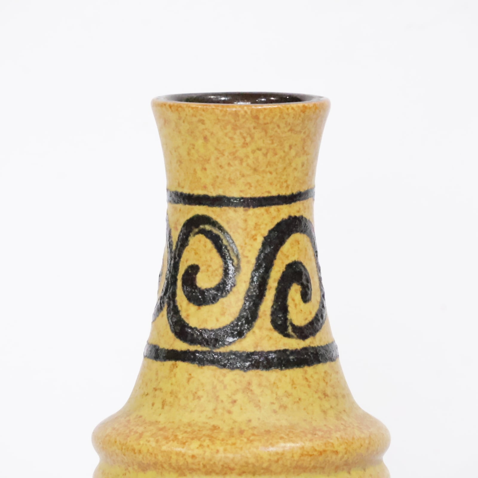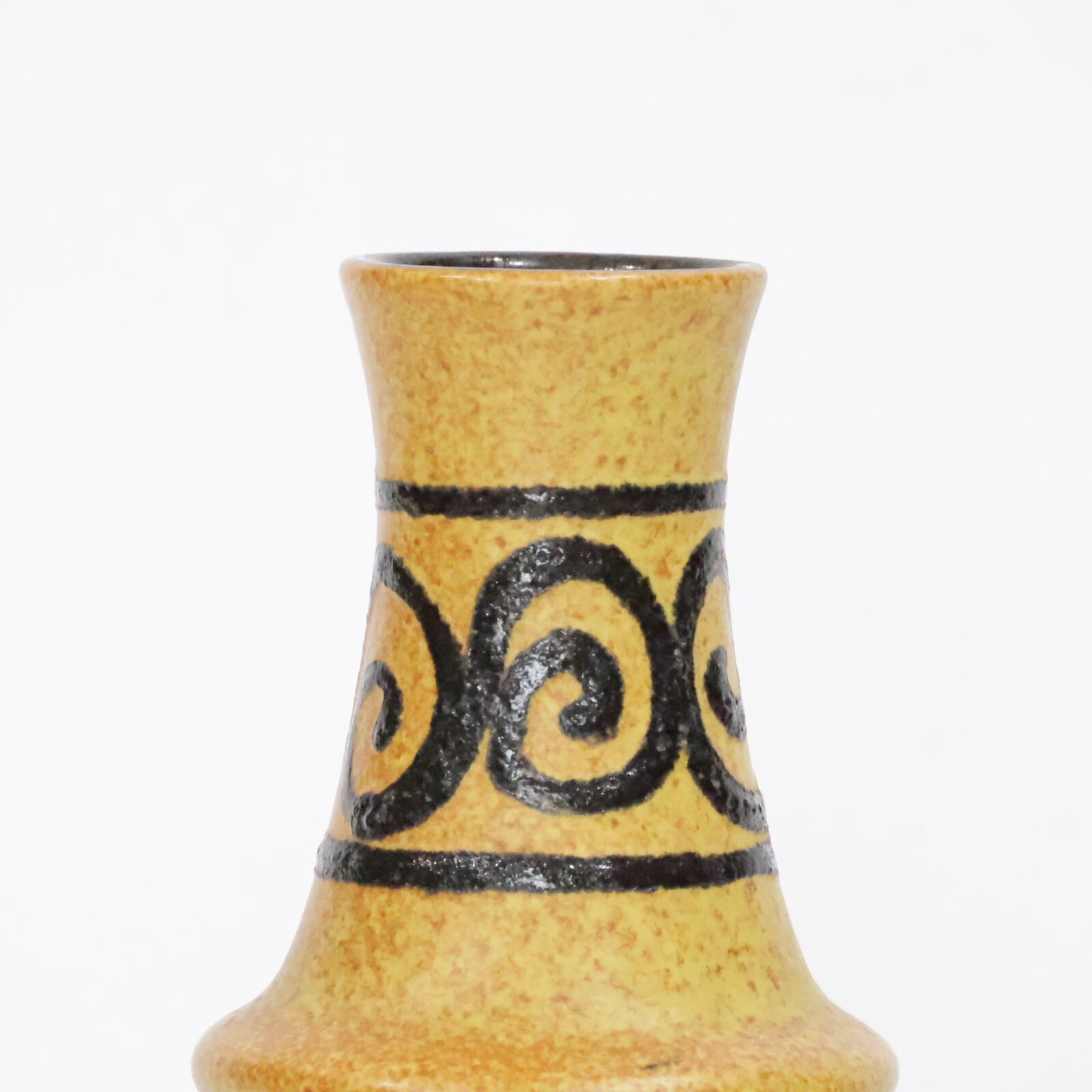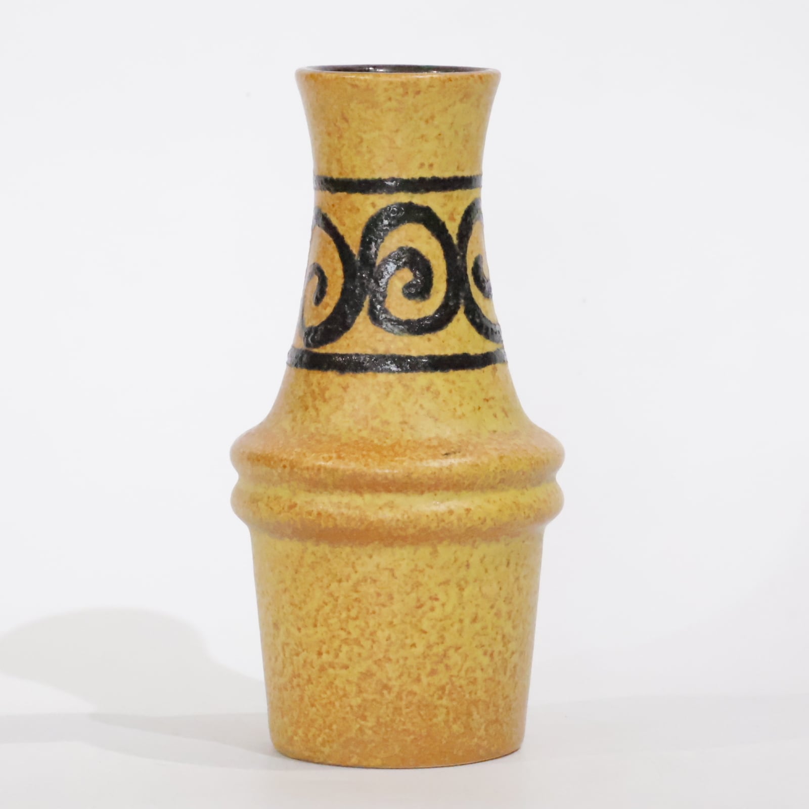 同社は急速に成長し、1950~80年代には陶 器製造の分野でドイツ最大のメーカーとなり、今日も確固たる地位を維持しています。形状に加えて釉薬でも、当時は最も幅広い品揃えを誇った他、輸出量も最大だったため、現在でも同社の製品はよく見られます。特に円筒形を基調にし たシンプルな形状で、型押し模様のある床置き 花瓶が代表的。色彩については当時主流だっ た赤やオレンジから、クリーム、ベージュ、茶色 などが多くを占めています。