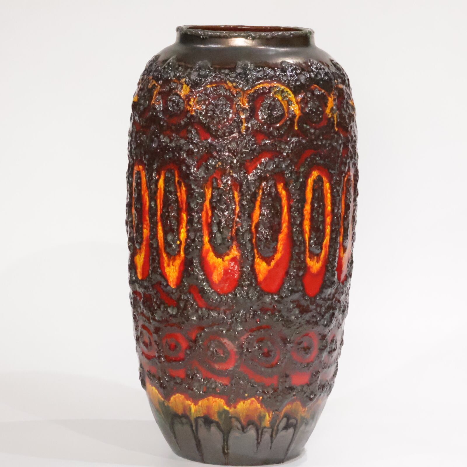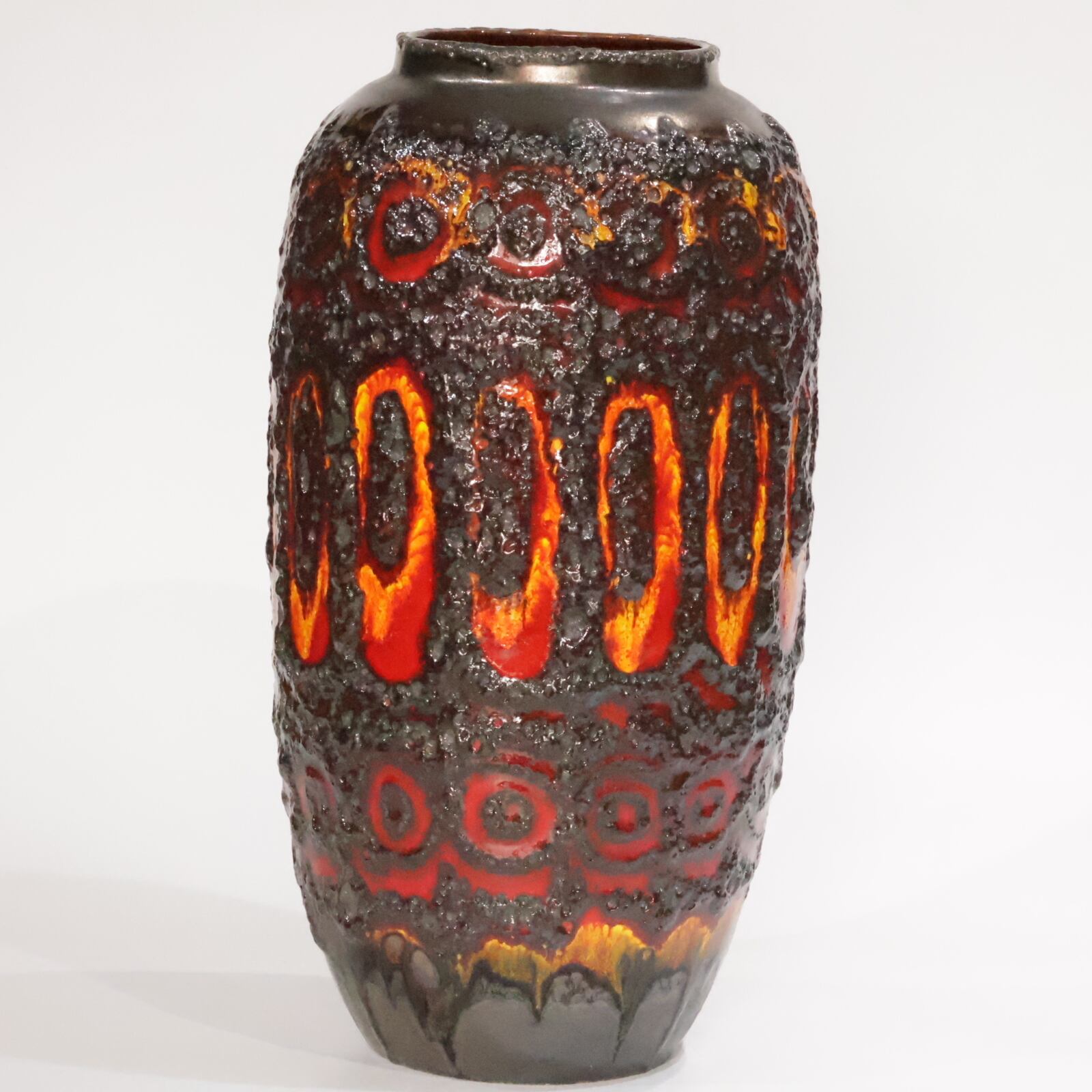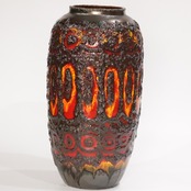 同社は急速に成長し、1950~80年代には陶 器製造の分野でドイツ最大のメーカーとなり、今日も確固たる地位を維持しています。形状に加えて釉薬でも、当時は最も幅広い品揃えを誇った他、輸出量も最大だったため、現在でも同社の製品はよく見られます。特に円筒形を基調にし たシンプルな形状で、型押し模様のある床置き 花瓶が代表的。色彩については当時主流だっ た赤やオレンジから、クリーム、ベージュ、茶色 などが多くを占めています。
