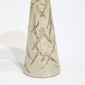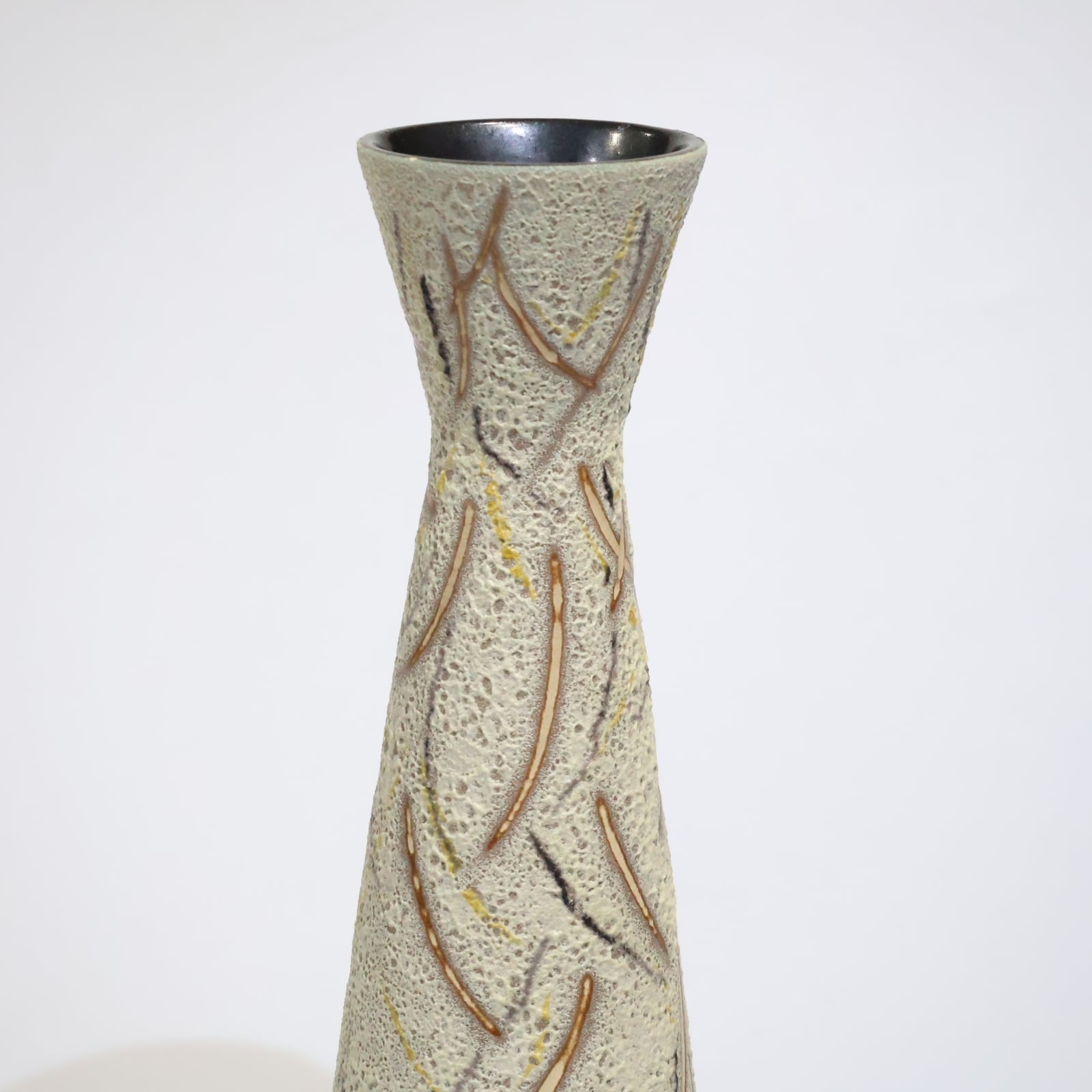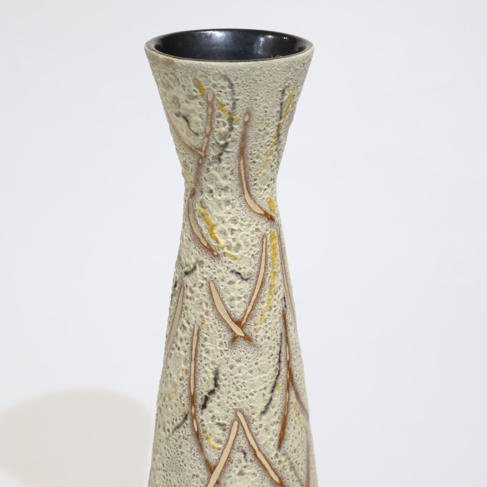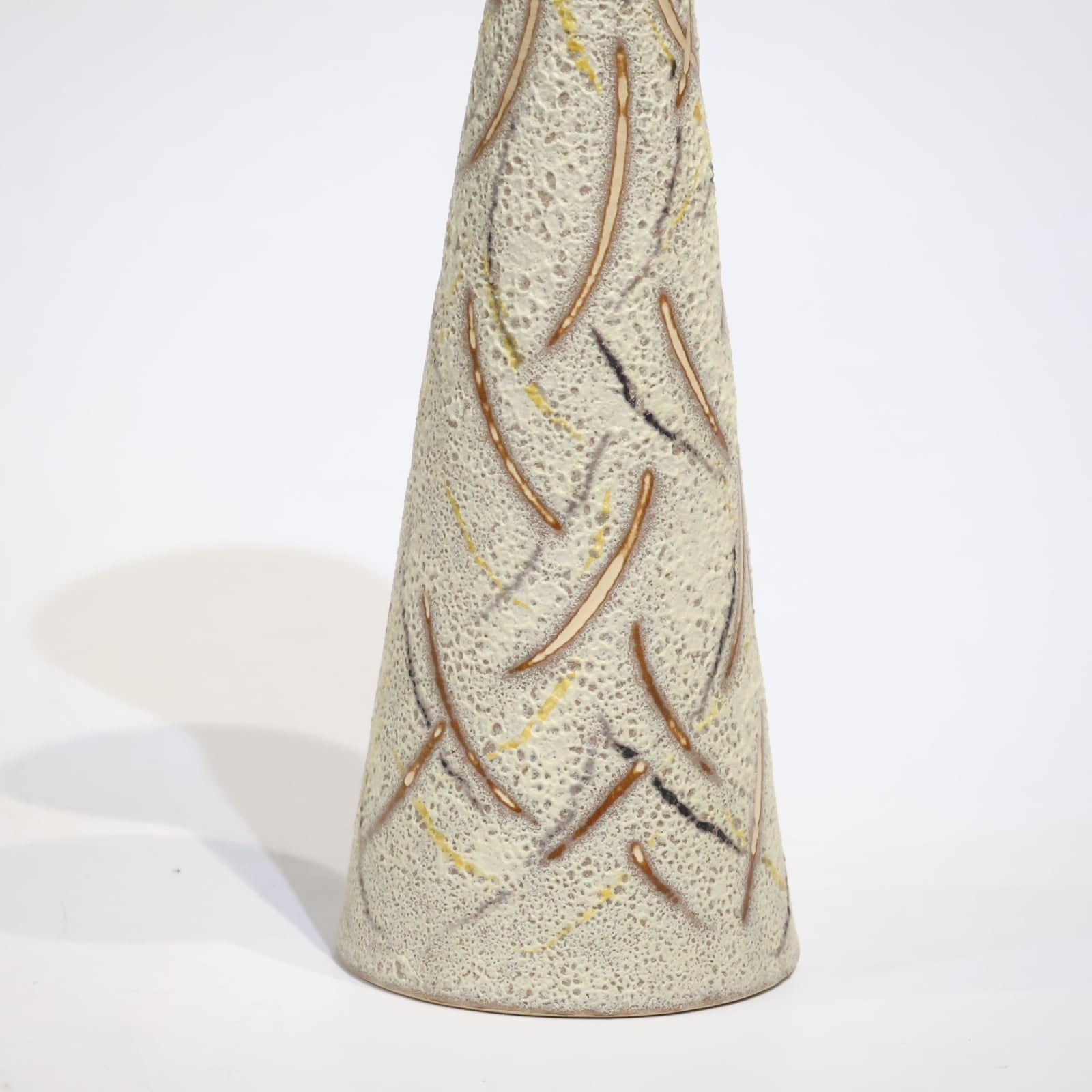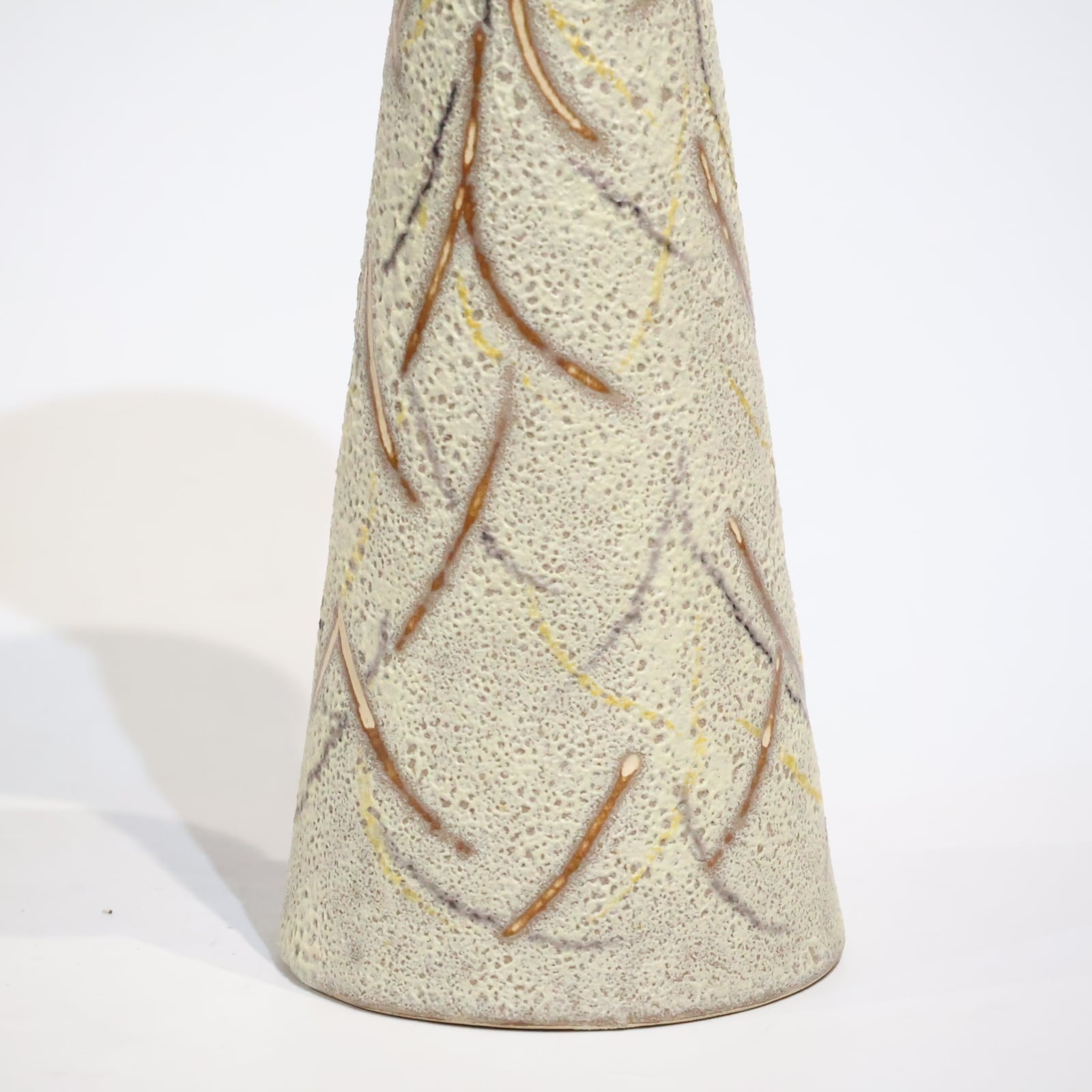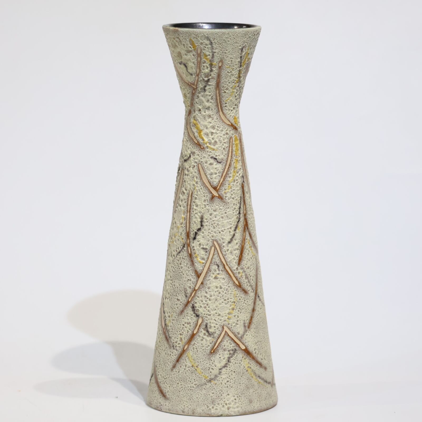 同社は急速に成長し、1950~80年代には陶 器製造の分野でドイツ最大のメーカーとなり、今日も確固たる地位を維持しています。形状に加えて釉薬でも、当時は最も幅広い品揃えを誇った他、輸出量も最大だったため、現在でも同社の製品はよく見られます。特に円筒形を基調にし たシンプルな形状で、型押し模様のある床置き 花瓶が代表的。色彩については当時主流だっ た赤やオレンジから、クリーム、ベージュ、茶色 などが多くを占めています。