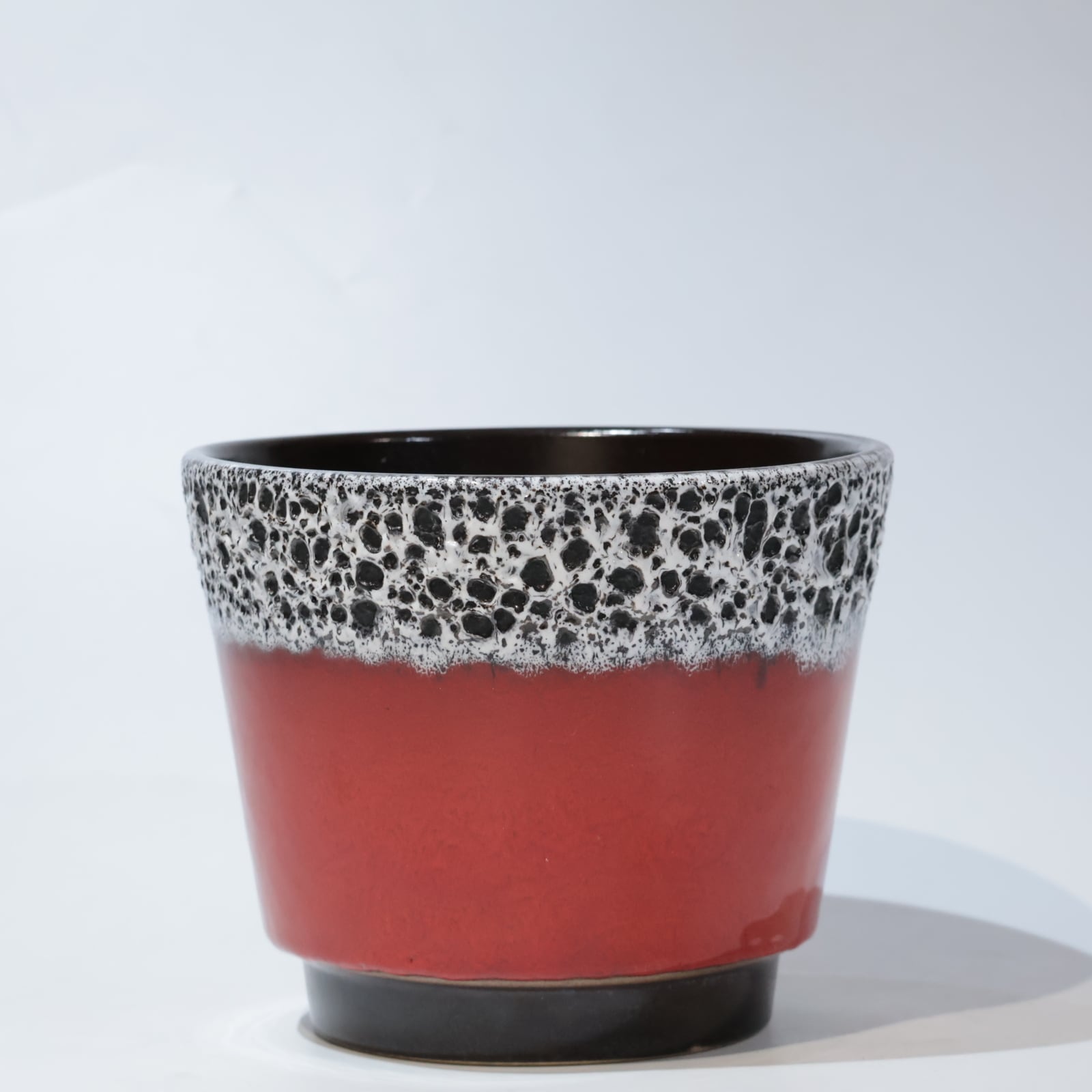 光沢感のある黒と赤の釉薬の上に白い釉薬が滴るような表情をつけています。