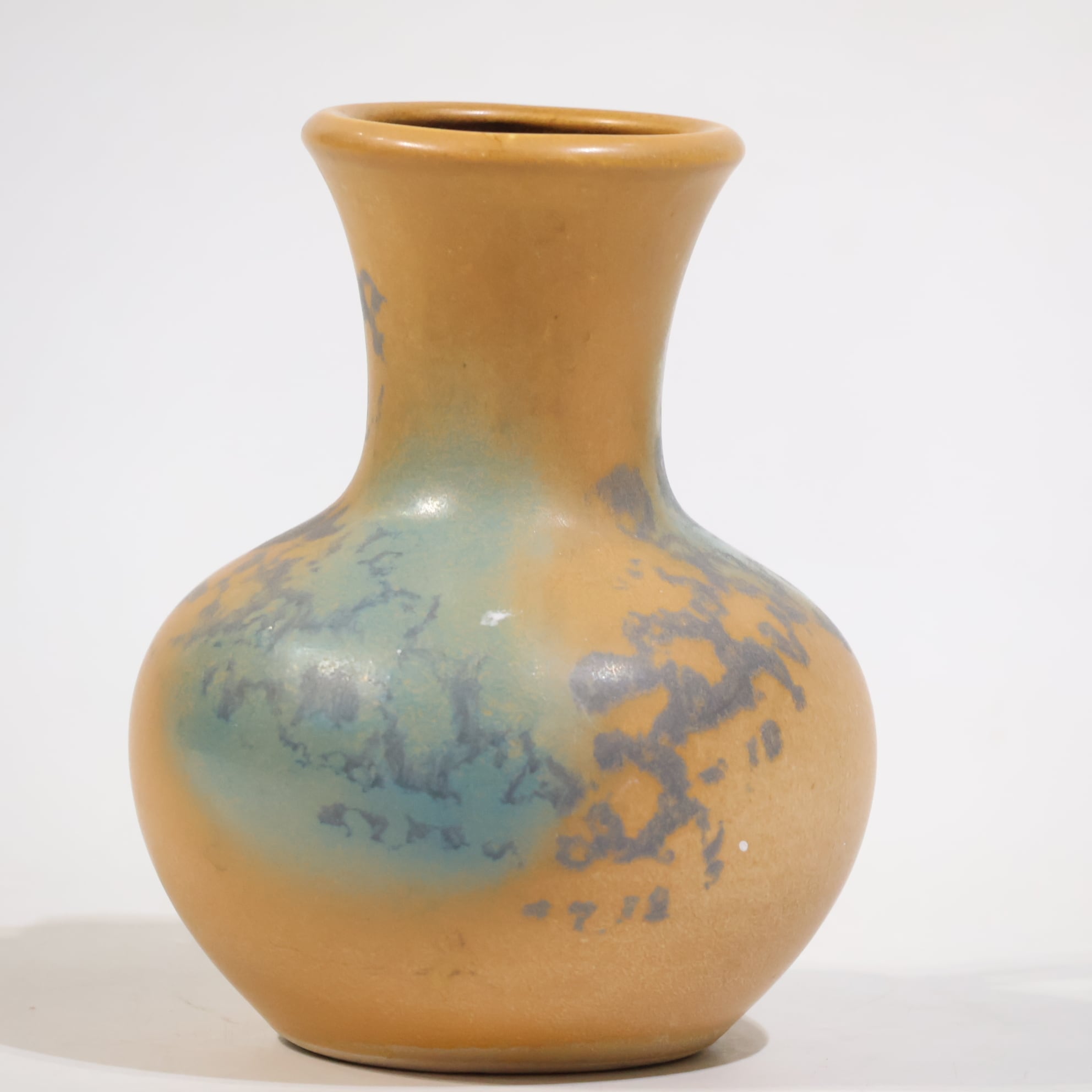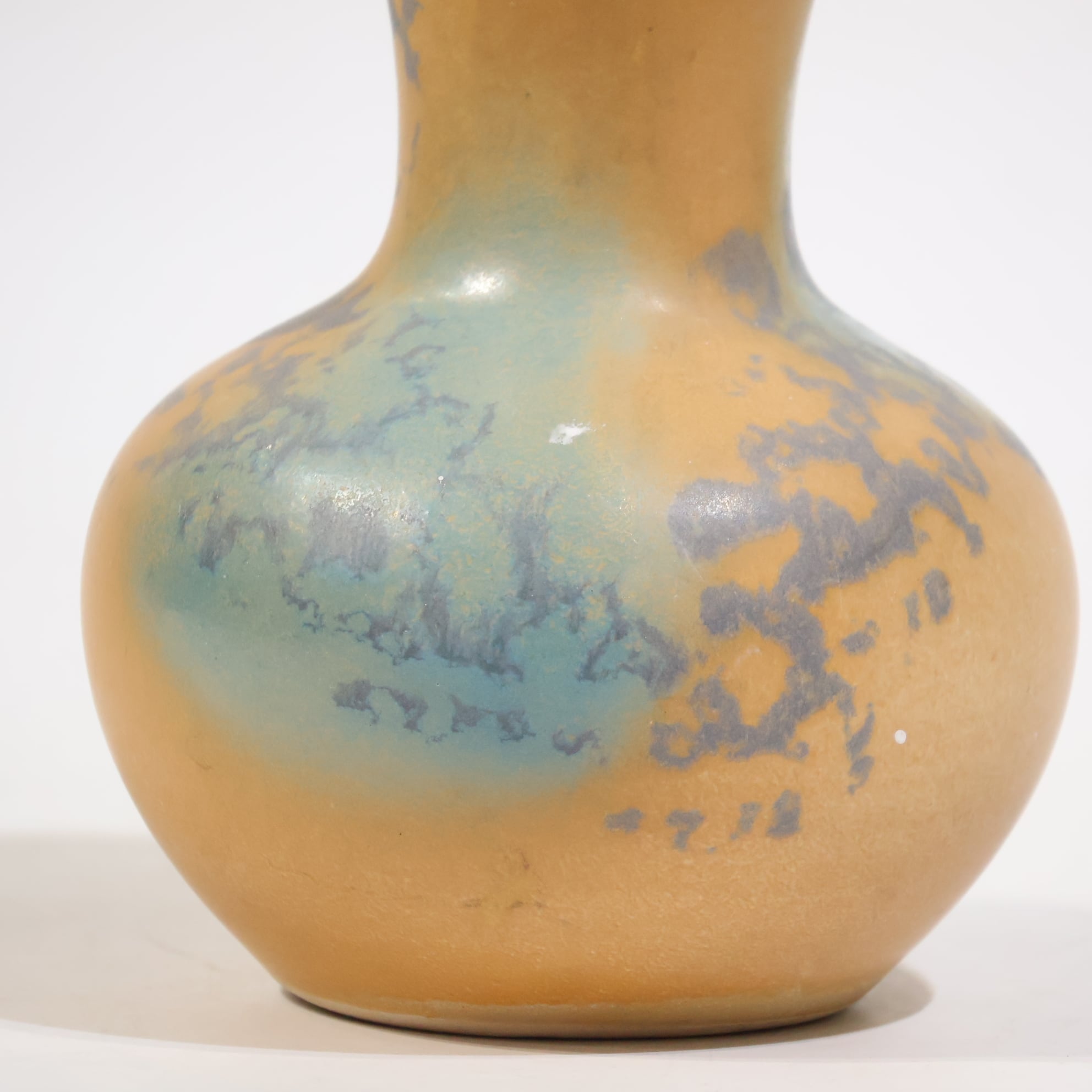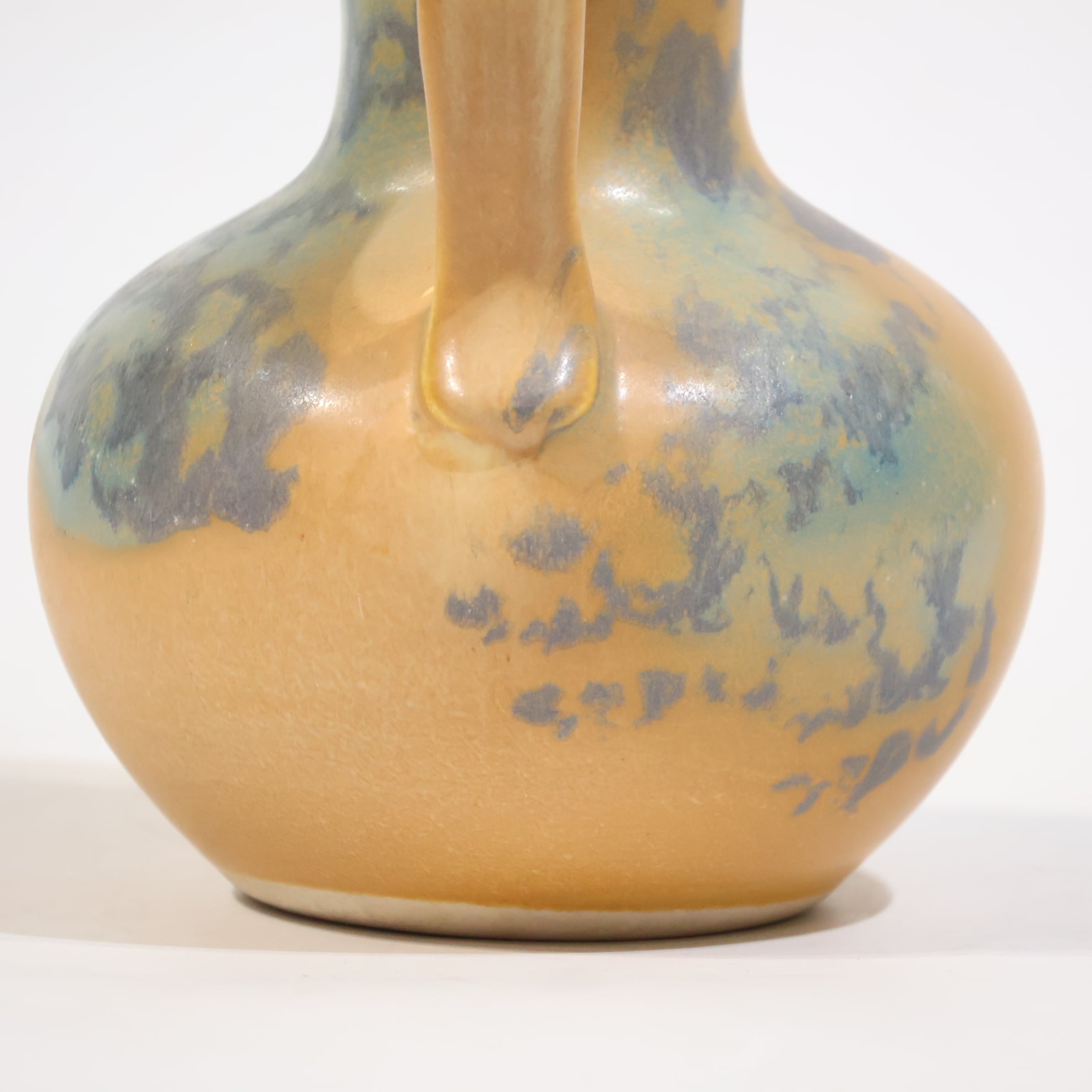 ベージュブラウンのマットな地に、青緑の釉が肩から流れ込む構成をしていて、焼成時の流れがそのまま残り、色の層として見えています。