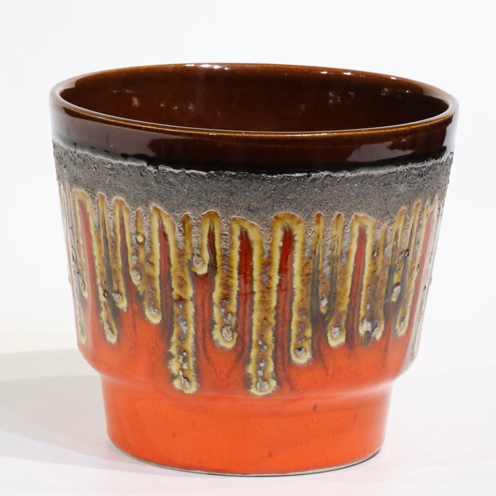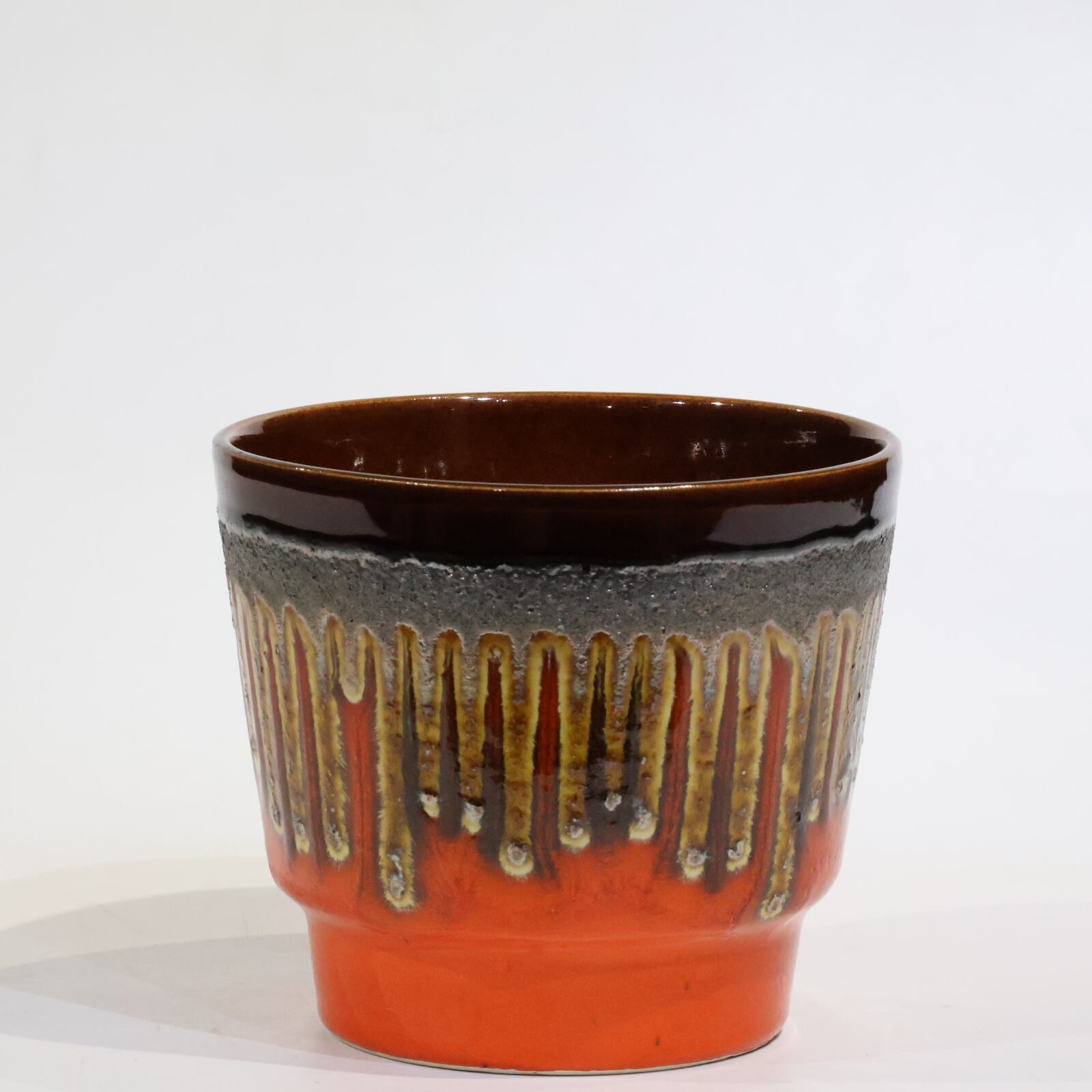深みのあるチョコレートブラウンから、ざらついた溶岩のようなブラック、それから燃えるようなオレンジレッドへと滑らかにグラデーションするÜebelacker Keramikの鉢カバー。