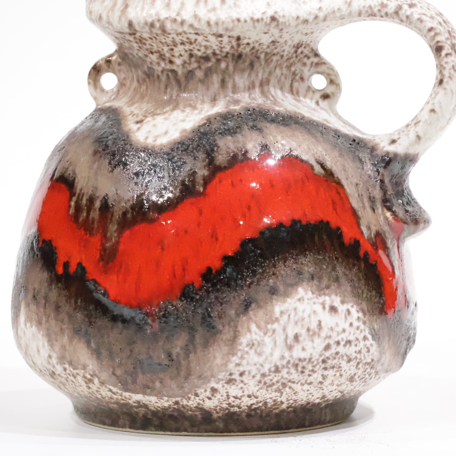 ぽってりと膨らんだボディに、首元から流れ込むように施された釉薬は、白〜ベージュをベースに、黒、茶、赤が混ざり合いながら溶岩のようなテクスチャを描き出しています。特に中央を走る鮮やかな赤色の釉薬が印象的で、まさにFat Lavaらしいエネルギーを湛えています。