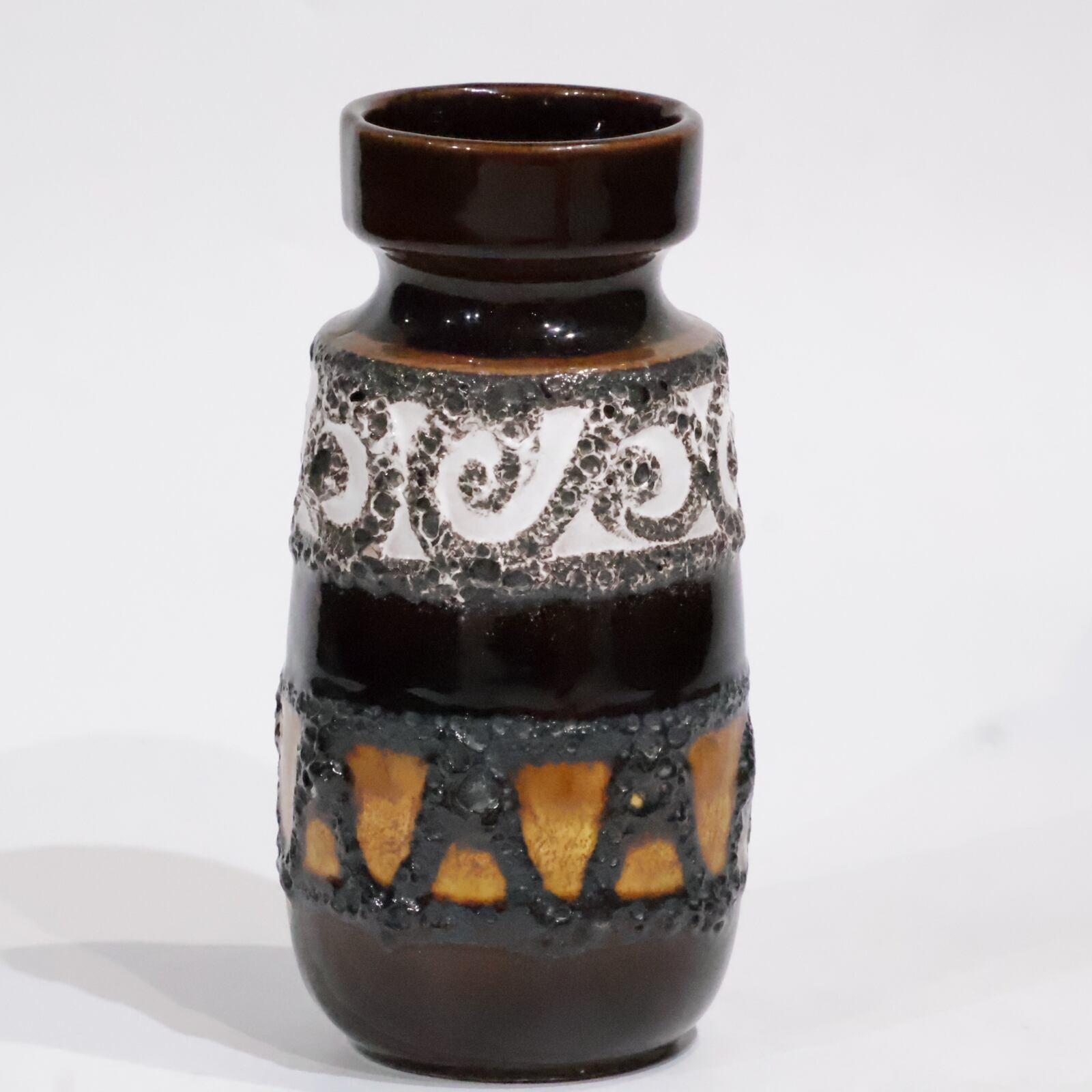 深みのあるブラウンを基調に、釉薬の立体感が美しく浮かび上がるScheurichの一点。首元には白地に渦巻きを描いた浮き彫りのような装飾が施されており、クラシカルな印象を与えます。胴の中ほどには、黒いFat Lava釉の中に力強く並ぶ黄色の逆三角形が配置され、モダンさと民族的な雰囲気が融合しています。