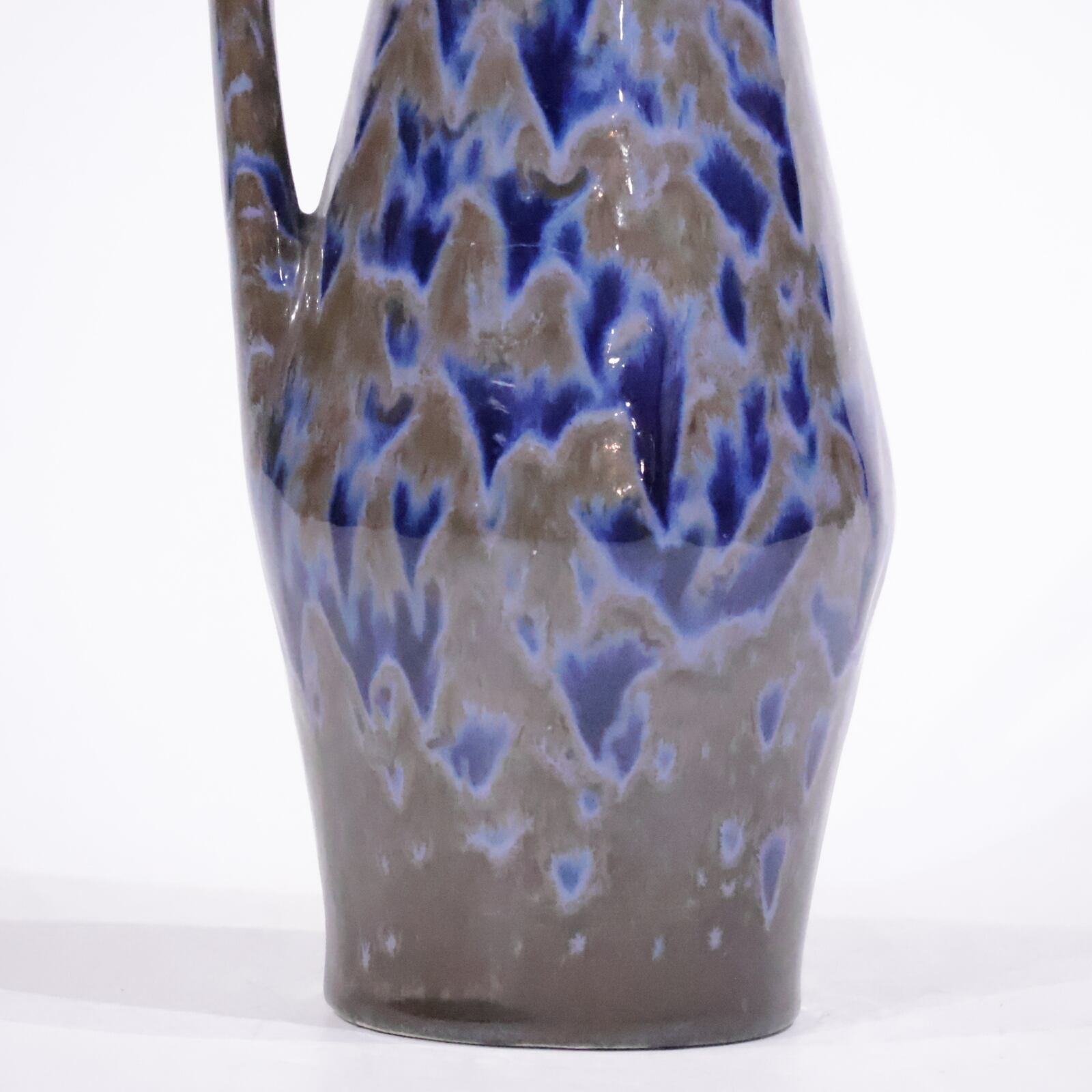 釉薬は、艶やかなグレイッシュブラウンの地に、流れるように濃淡を持ったブルーが結晶のように広がる、結晶釉にも似た表情を持っています。この青のニュアンスが絶妙で、角度によっては深海のような色彩の奥行きを感じさせます。