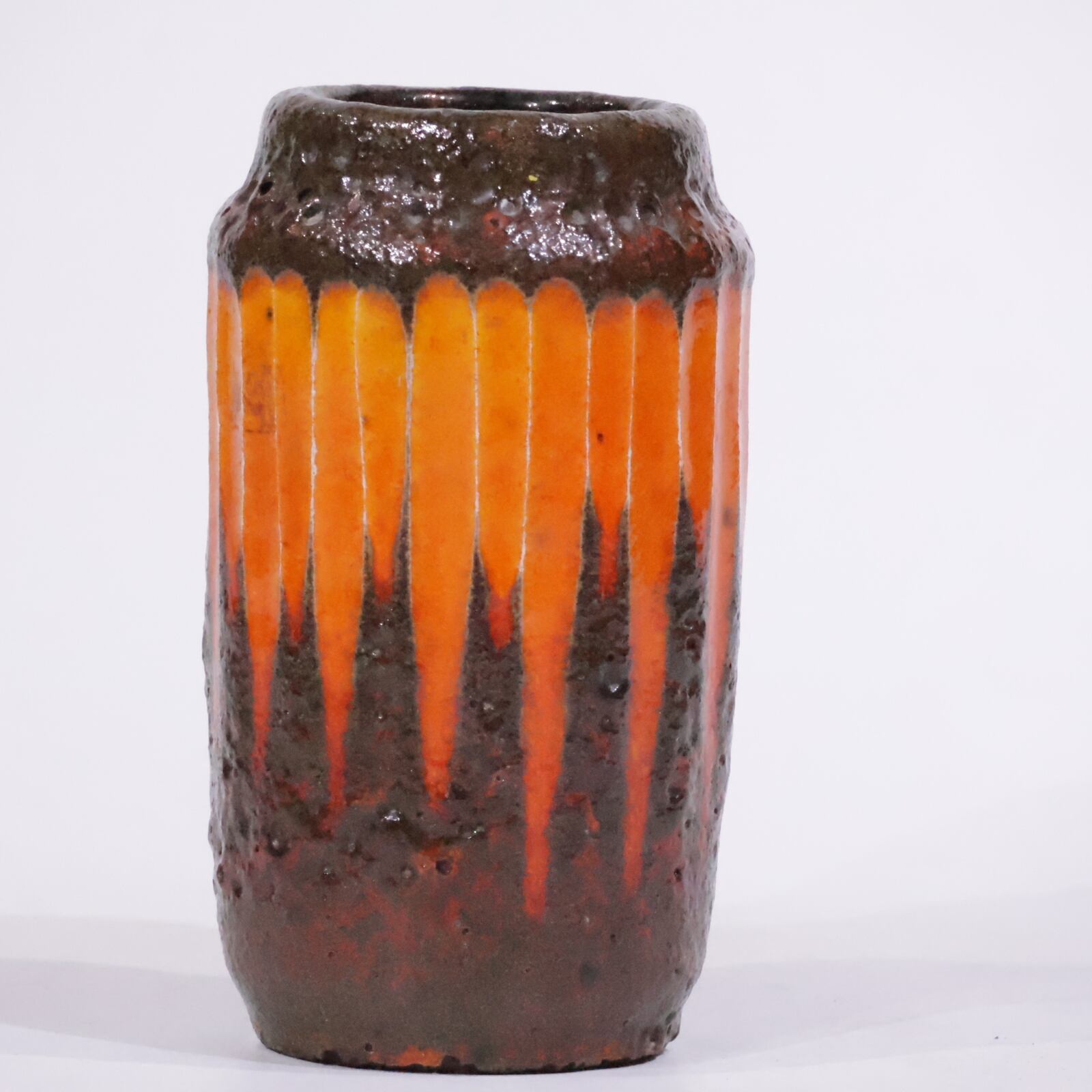 表面には凹凸のあるマットなFat Lava釉が厚く施され、光の加減によって陰影が際立ち、立体感が生まれています。釉薬の濃淡によってオレンジから赤、そして黒へと滑らかに移り変わるグラデーションが美しく、Scheurichならではの釉薬技術の高さがうかがえます。