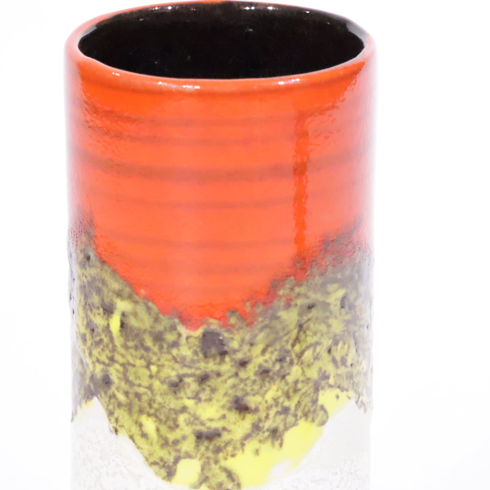 鮮烈な赤、鮮やかな黄、そしてざらりとした白のコントラストが目を奪う、一本のスリムな造形。高さ18.8cmと手頃ながら、その配色と釉薬の展開には強いインパクトがあります。