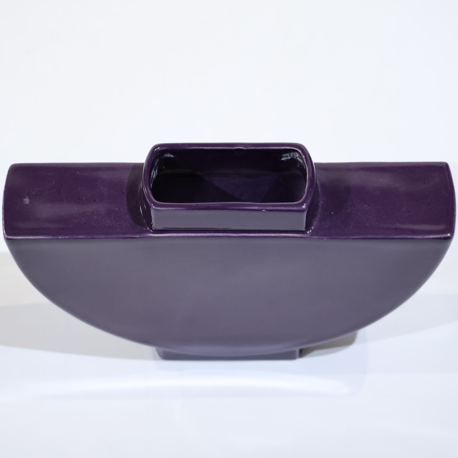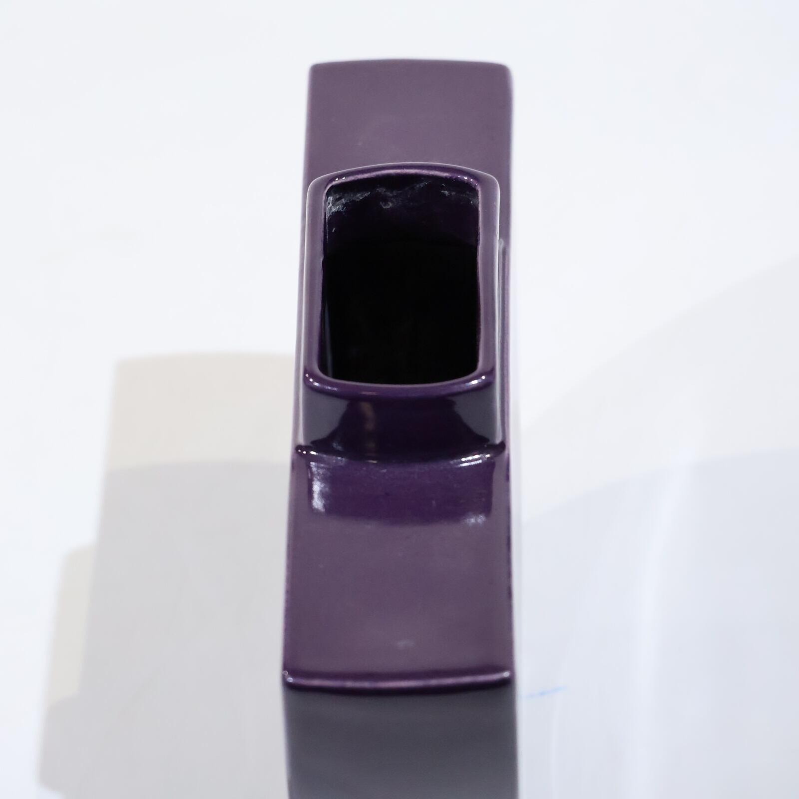 深みのあるパープルが気品を漂わせるASAの作品。半円形のフォルムにスクエアの口縁を組み合わせた造形は、直線と曲線のコントラストが強調され、まるで建築的な美しさを感じさせます。横に広がるシルエットは安定感を備えつつも軽やかで、正面から見たときの大胆な形状はインテリアに強い印象を与えます。