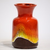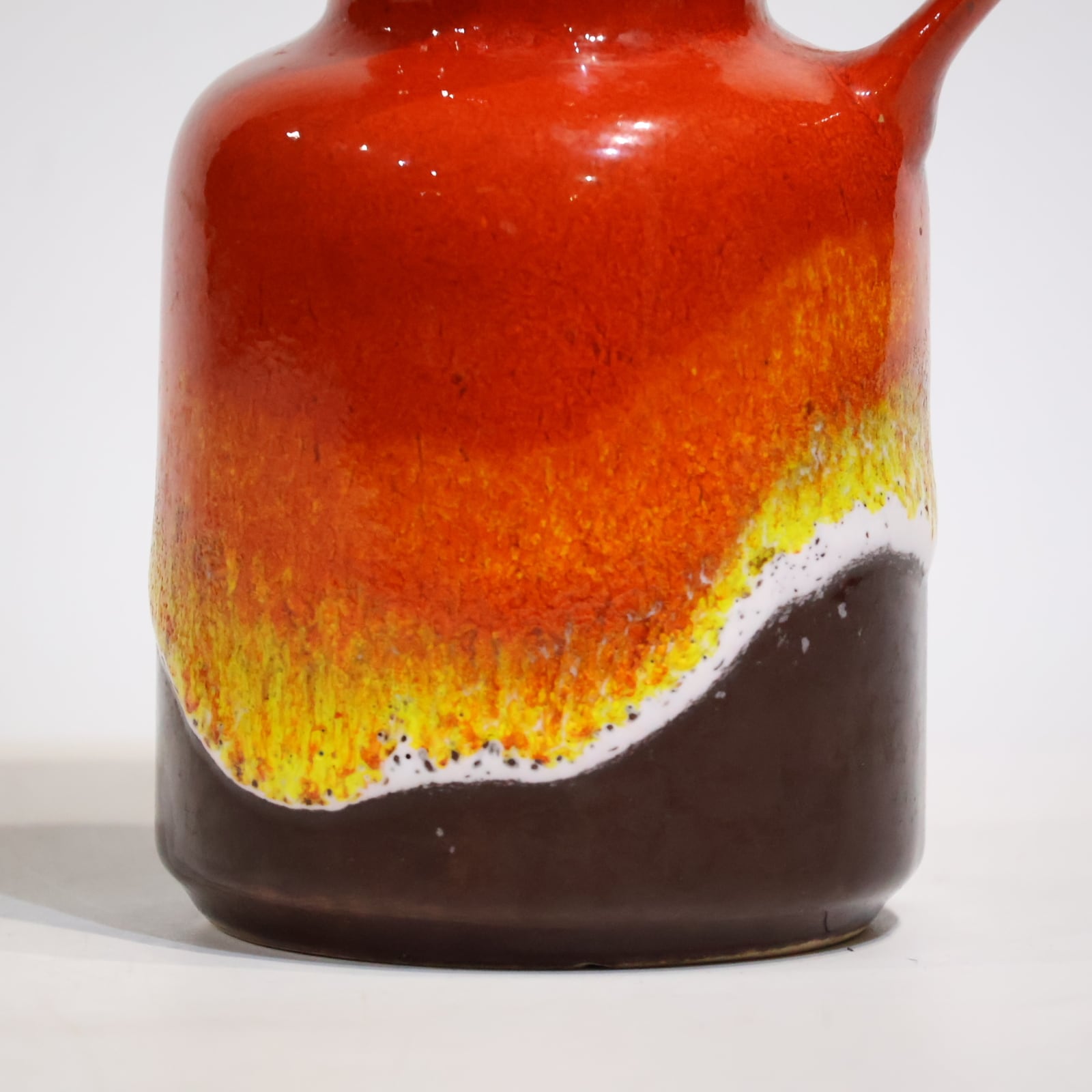 Jasbaの代表的なシリーズ「Nシリーズ」より、コンパクトながら印象深い一点。赤、黄色、マットなブラウンという三色の釉薬が大胆に重なり合い、まるで燃え上がる炎のようなグラデーションを描いています。特に黄色釉が点描のように発色し、滑らかな赤とのコントラストに躍動感を与えています。形状はシンプルながら、口元の大きなフレアが軽やかさを演出し、内側にも赤釉の粒子が浮かぶなど細部まで丁寧な仕上がり。Nシリーズならではの装飾美と構成感が詰まったコレクションピースです。