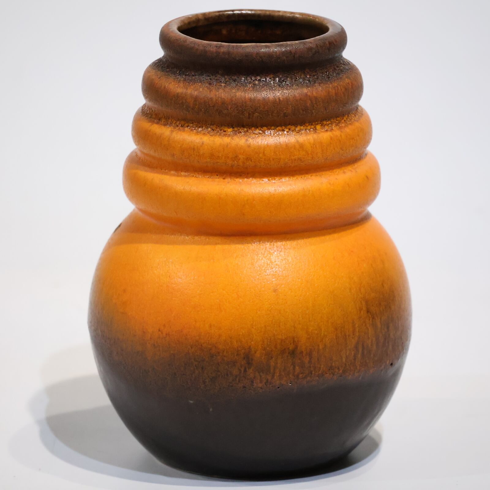 同社は急速に成長し、1950~80年代には陶 器製造の分野でドイツ最大のメーカーとなり、今日も確固たる地位を維持しています。形状に加えて釉薬でも、当時は最も幅広い品揃えを誇った他、輸出量も最大だったため、現在でも同社の製品はよく見られます。特に円筒形を基調にし たシンプルな形状で、型押し模様のある床置き 花瓶が代表的。色彩については当時主流だっ た赤やオレンジから、クリーム、ベージュ、茶色 などが多くを占めています。