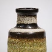 同社は急速に成長し、1950~80年代には陶 器製造の分野でドイツ最大のメーカーとなり、今日も確固たる地位を維持しています。形状に加えて釉薬でも、当時は最も幅広い品揃えを誇った他、輸出量も最大だったため、現在でも同社の製品はよく見られます。特に円筒形を基調にし たシンプルな形状で、型押し模様のある床置き 花瓶が代表的。色彩については当時主流だっ た赤やオレンジから、クリーム、ベージュ、茶色 などが多くを占めています。