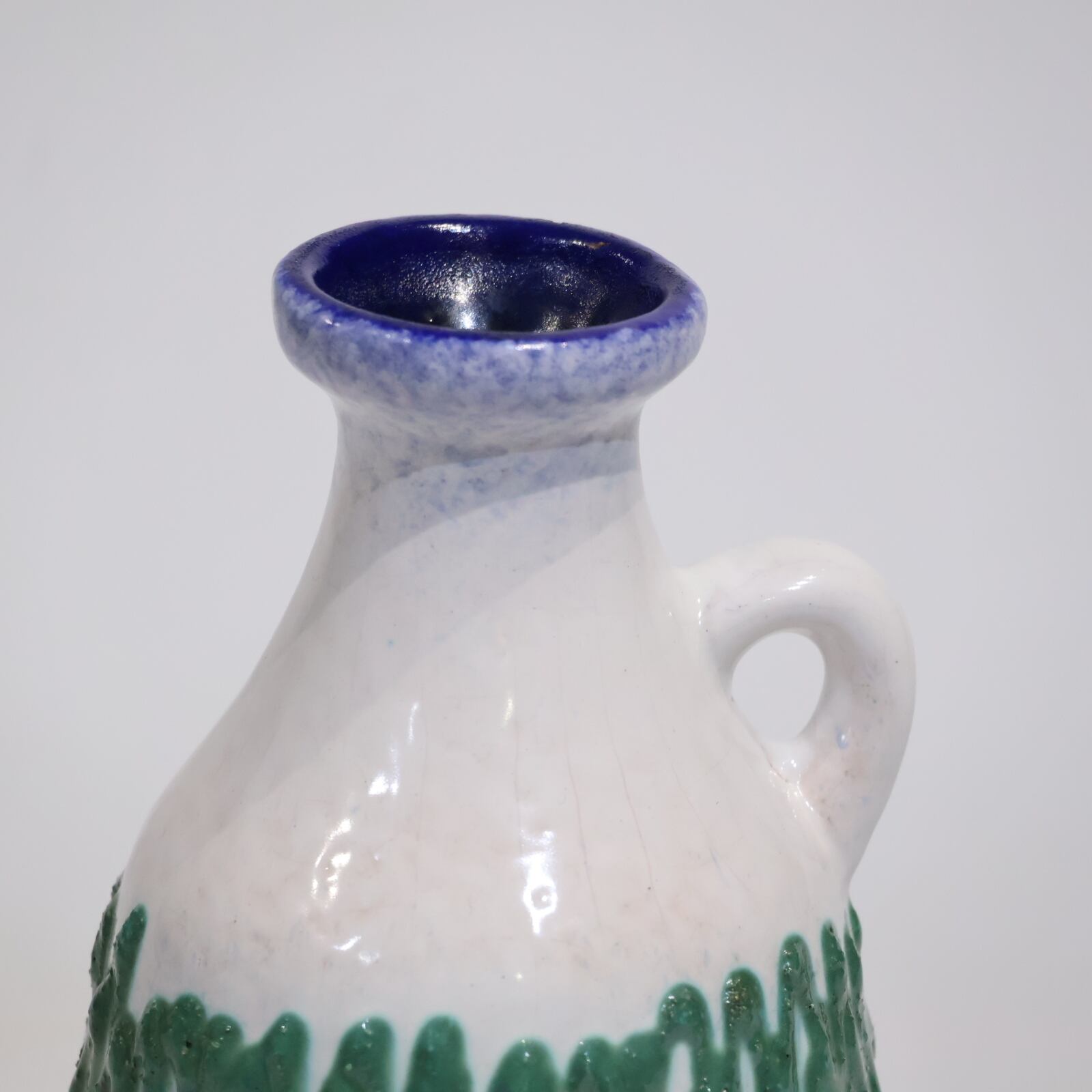 コバルトブルーからオレンジ、ホワイトへと続く色のレイヤーに、ジグザグとしたグリーンの釉薬がアクセントとしてあしらわれた、Strehla製の一点。