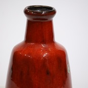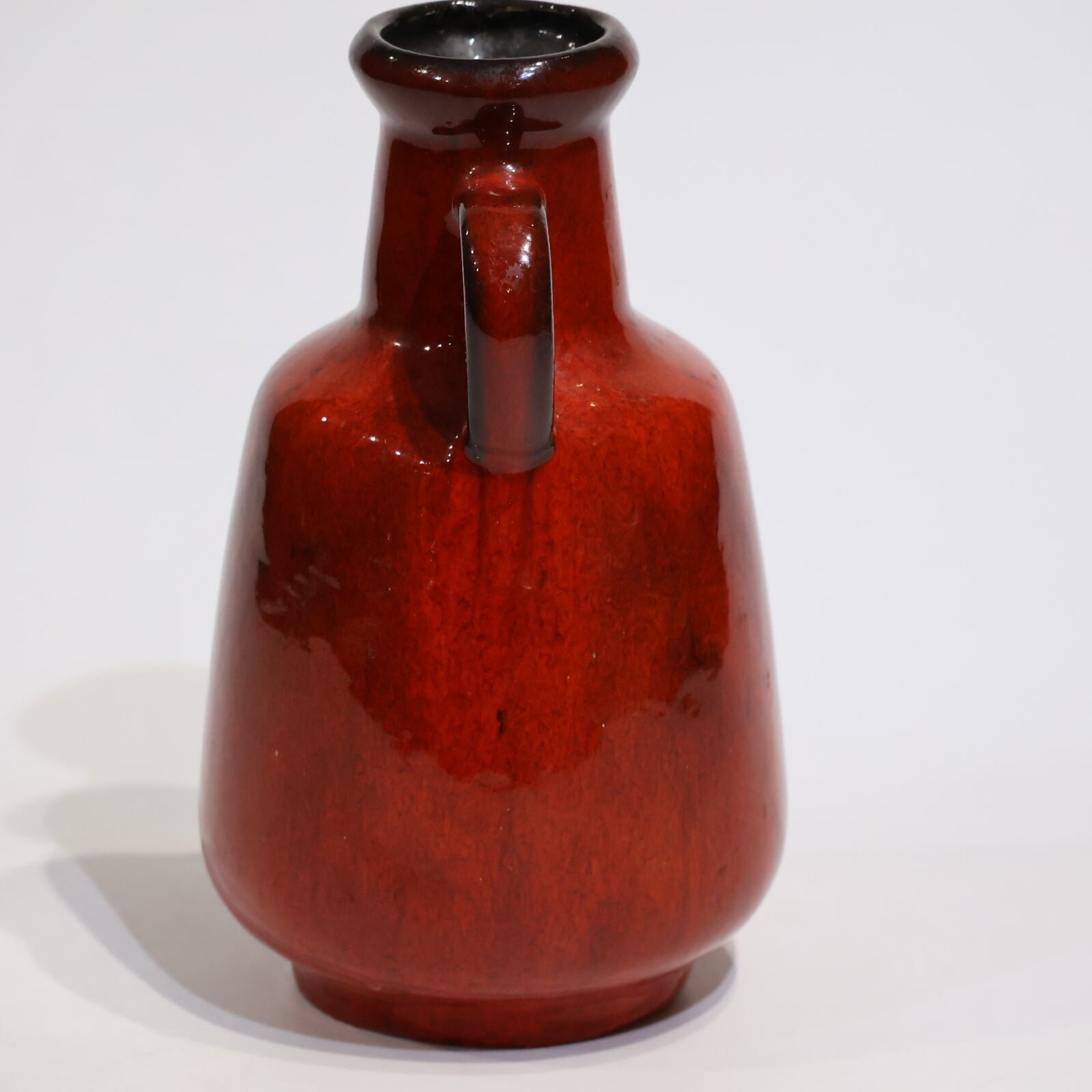 深みのある赤釉が全体を覆う、存在感ある一点。胴部に向かってふくらみを持たせた端正なフォルムに、小ぶりなハンドルがアクセントを添えています。釉薬は光沢を帯びつつも、黒みを含んだ濃淡が揺らめき、炎のような表情を見せます。ES Keramikが得意としたシンプルながらも力強い造形と、大胆な色彩表現が際立つ作品です。