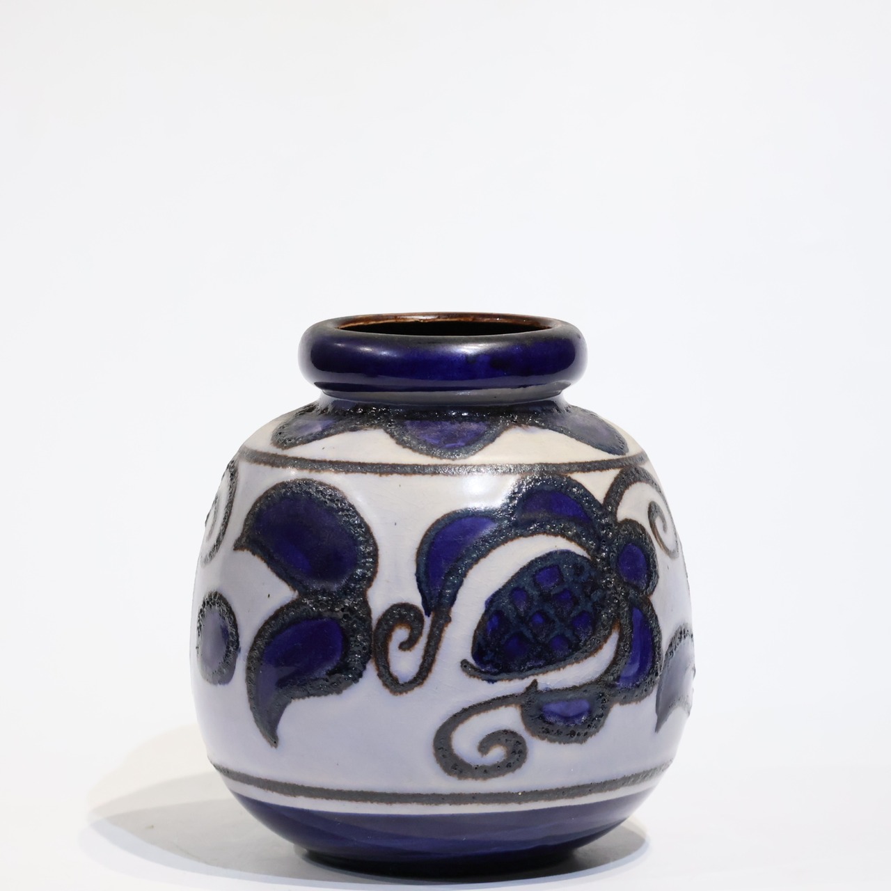 艶やかなコバルトブルーと白地のコントラストが美しいScheurichの一点。葡萄や葉をモチーフにした装飾がリズムよく配され、濃淡のあるブルー釉が光の加減で表情を変える華やかな仕上がりです。黒のアウトラインが模様をくっきりと浮かび上がらせ、シンプルなフォルムに豊かな存在感を与えています。