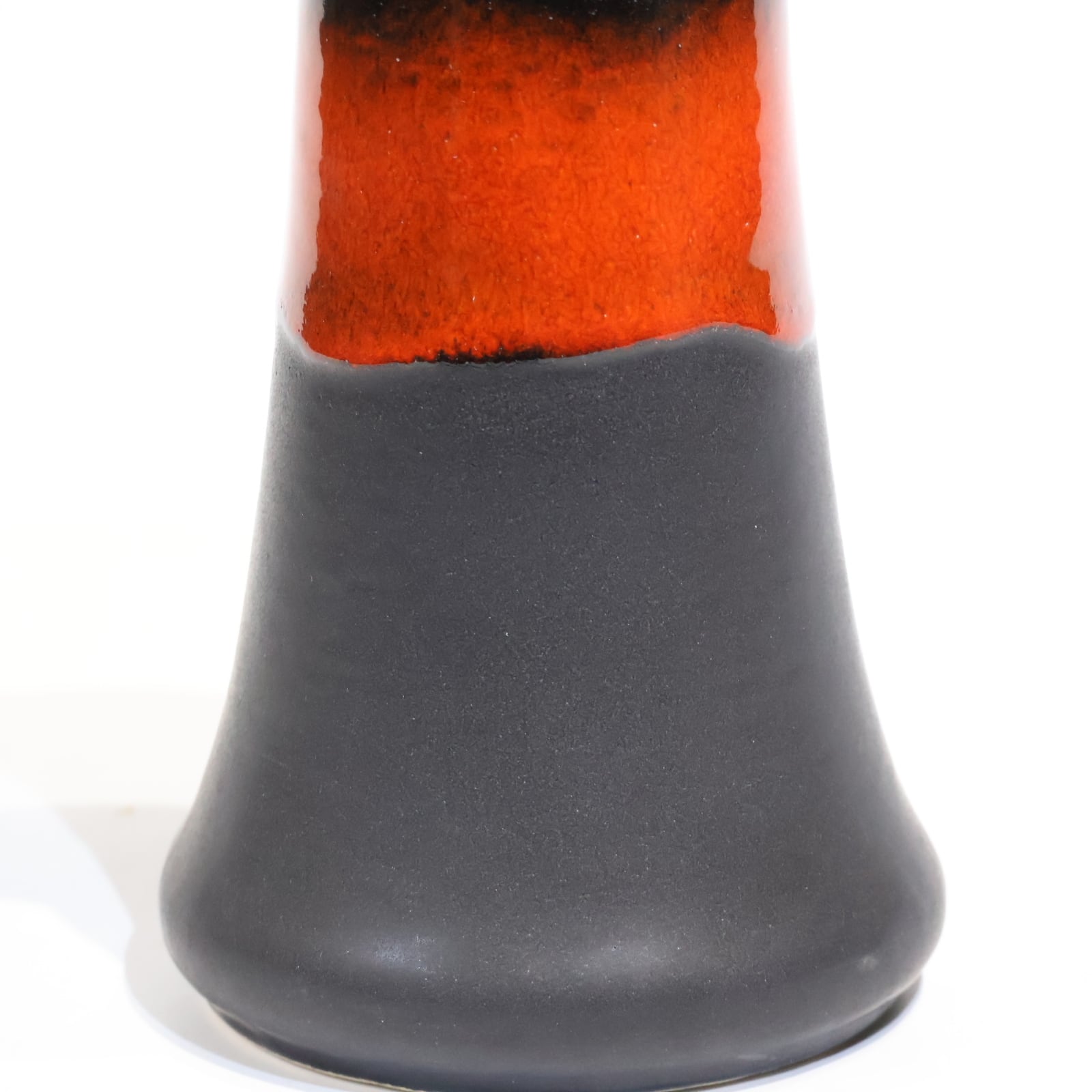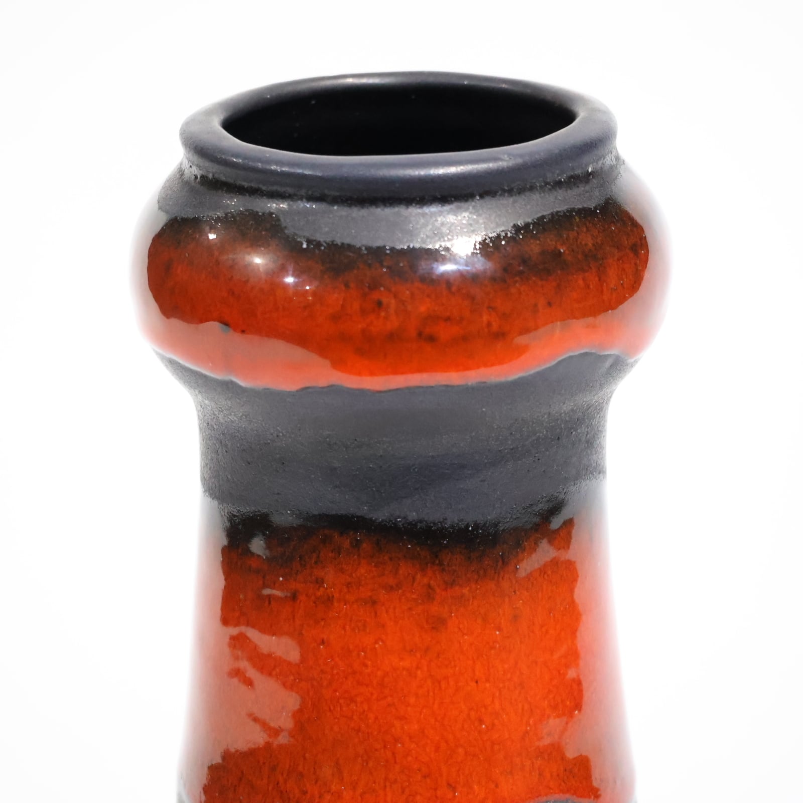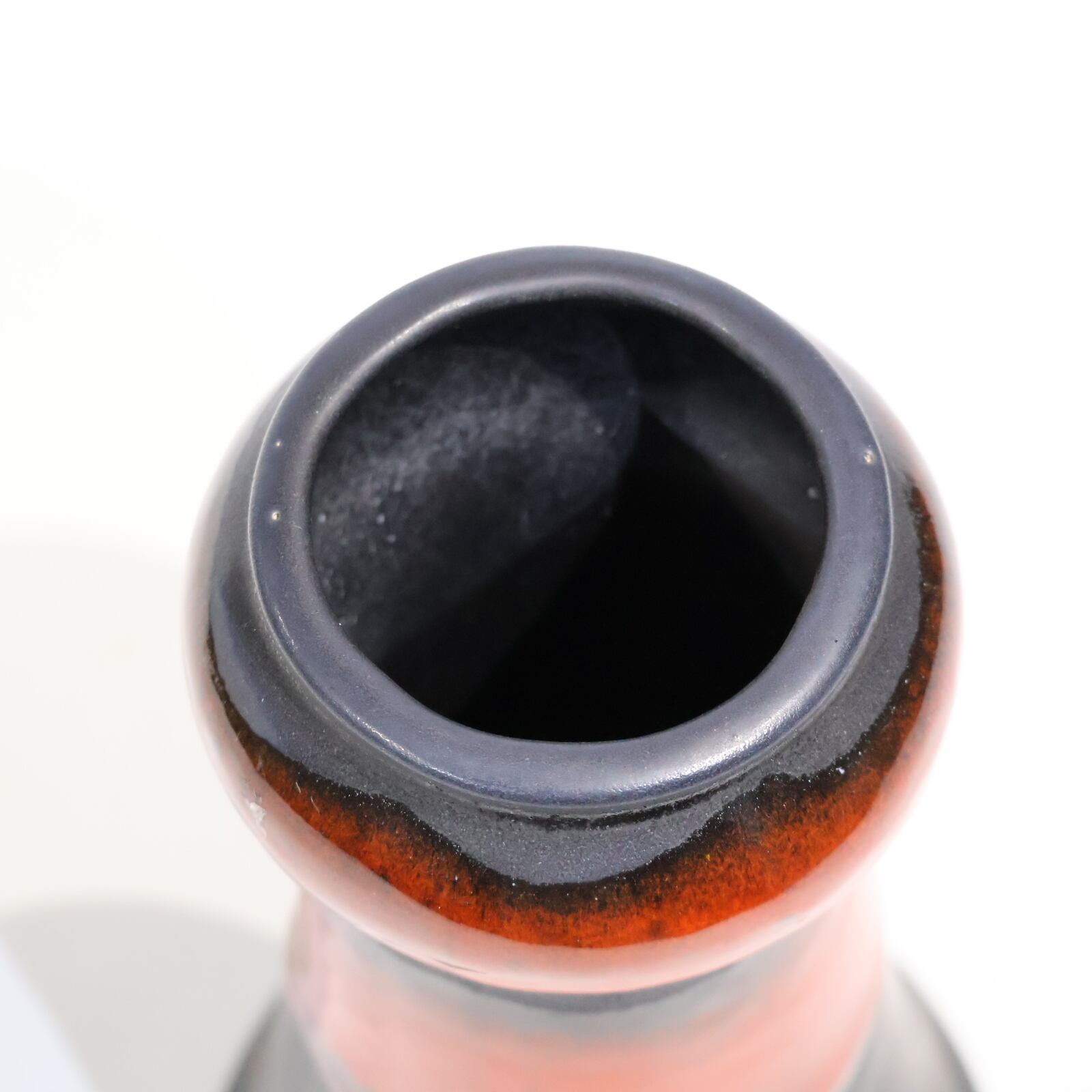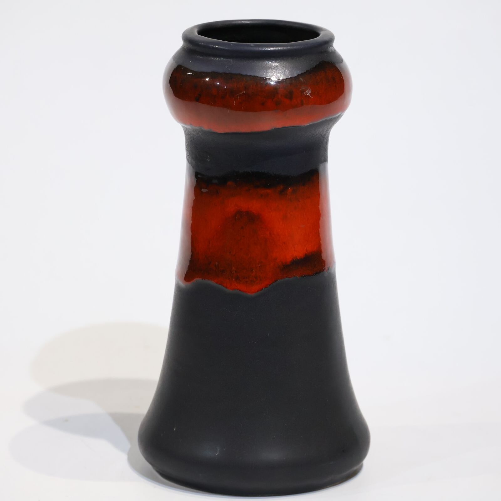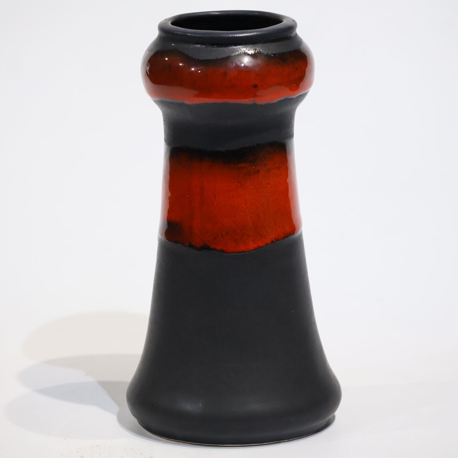 マットブラックと艶やかな赤釉のコントラストが際立つ、力強くも洗練された佇まいの一点。上部から中腹にかけて艶のある赤釉が施され、下部にかけては艶のないマットな黒によって引き締められたデザインが特徴です。モダンでありながらどこかクラシックな印象も併せ持ち、ドイツ陶器らしい職人技を感じさせる造形です。