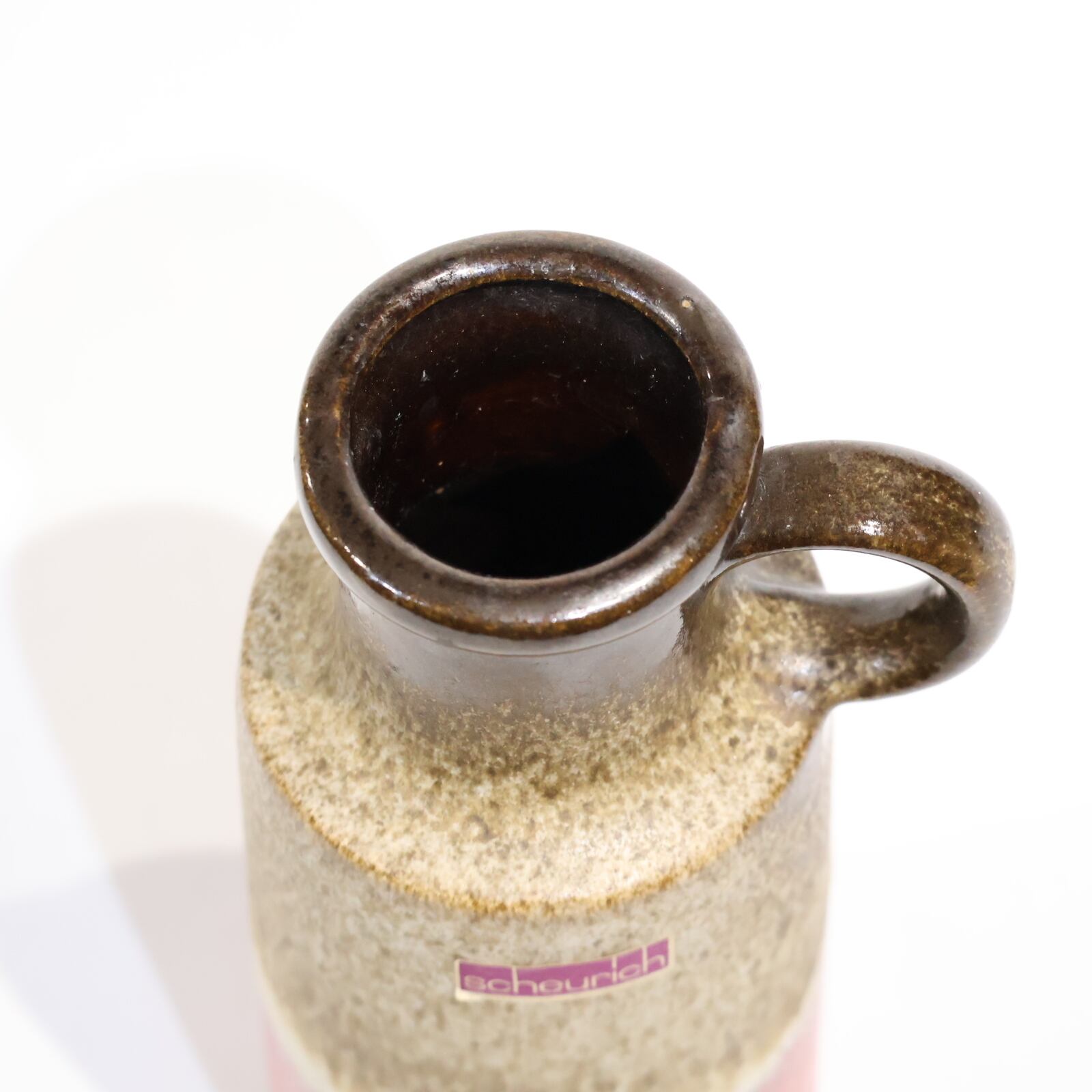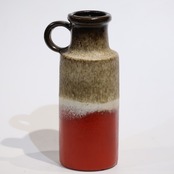 ブラウンベージュと赤のコントラストが鮮やかなScheurichの一点です。上部はマットなブラウンベージュのグラデーションで落ち着いた印象を与え、下部は赤釉が存在感を放っています。中央には乳白色の釉薬がにじむように広がり、両色の境界を柔らかくつないでいます。小ぶりのハンドルが付いており、全体のバランスにアクセントを加えています。