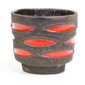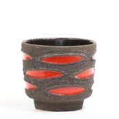 アイキャッチとなる鮮やかな赤い釉薬が、黒くざらついた溶岩状の表面から楕円形に覗く、極めて特徴的なデザインです。