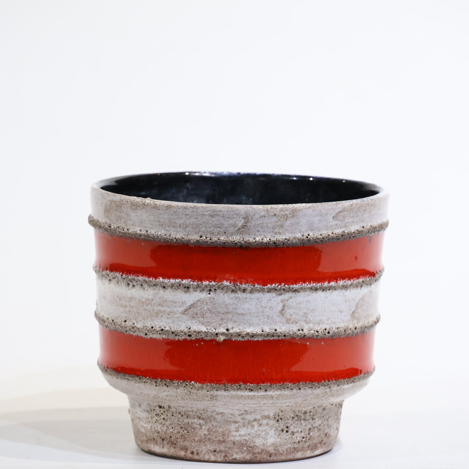 無駄のない直線的なフォルムに、エネルギッシュな赤の釉薬が横縞状に施された一点。艶やかな赤と、ざらりとした質感のマットグレーの対比が力強く、どこかインダストリアルな雰囲気も漂わせています。
