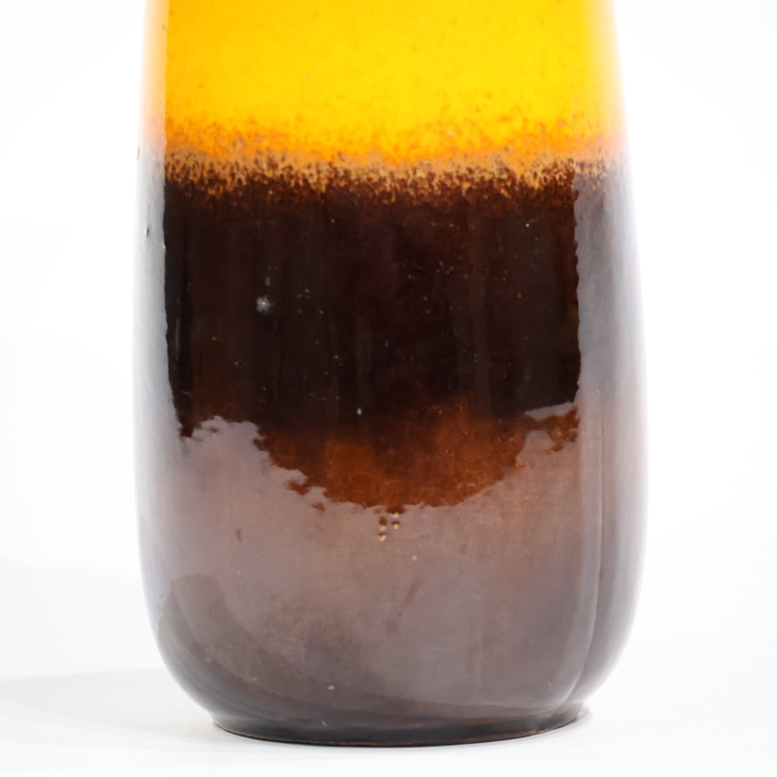 鮮やかなオレンジと深みのあるブラウンの対比が印象的な、Scheurichによる一点。上部にかけては艶やかなオレンジ釉がしっかりと塗り重ねられ、そこから滑らかにブラウンへとグラデーションのように変化していく構成が美しく、まるで夕焼け空と地平線が溶け合うような色彩の世界を感じさせます。