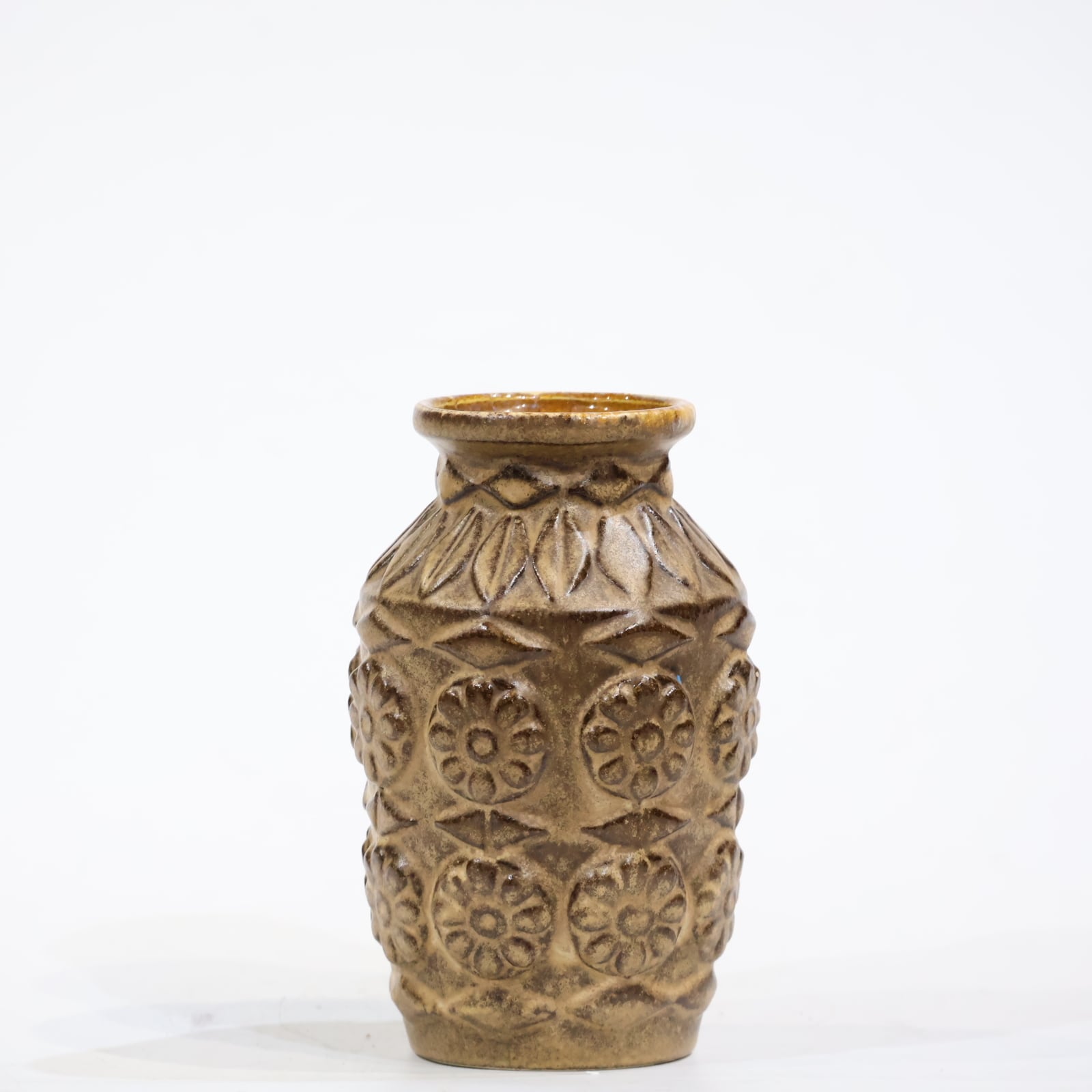 1960年代からのスタイルとしては、 当時広く流行していた色彩の釉薬(マットまたは 光沢あり)を使用し、シンプルなフォルムの上に様 式化した花の図柄の型押しや幾何学模様をあし らったものが多く、Scheurichのも のと混同されがちです。