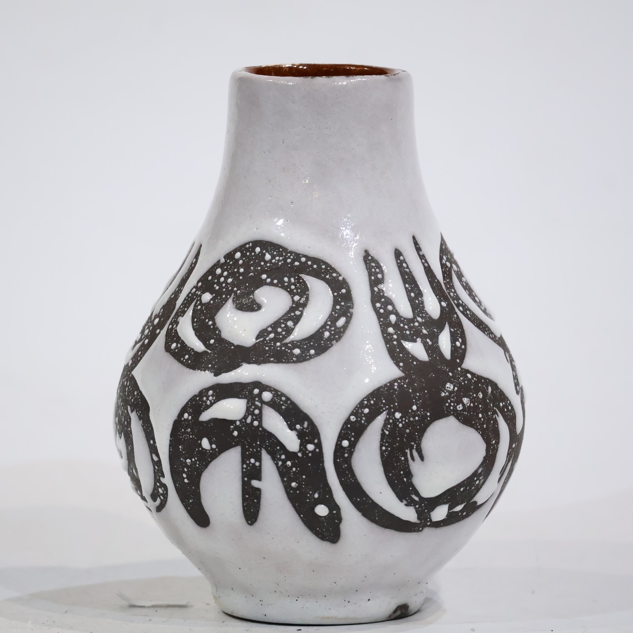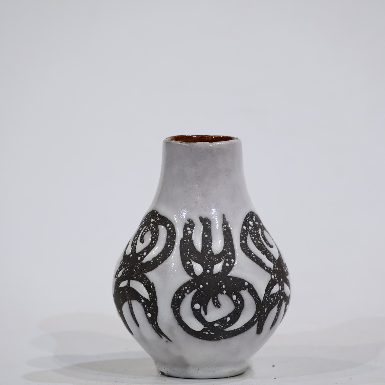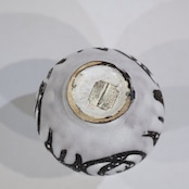 白いマット釉をベースに、黒の抽象文様が面ごとに描かれた構成的デザインが特徴です。線の重なりやリズムにより、静謐さの中に有機的な躍動を感じさせます。