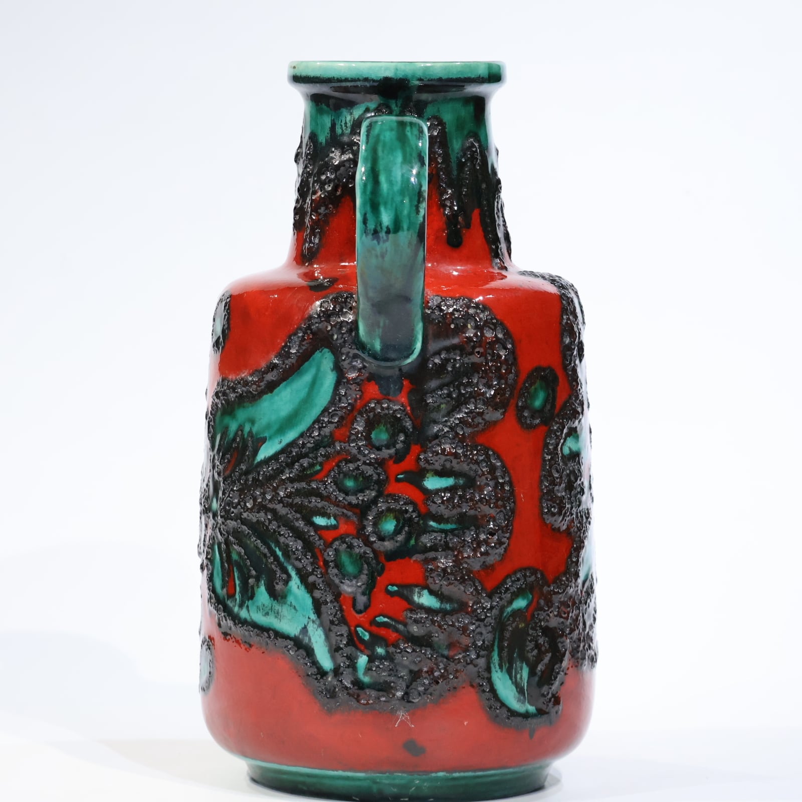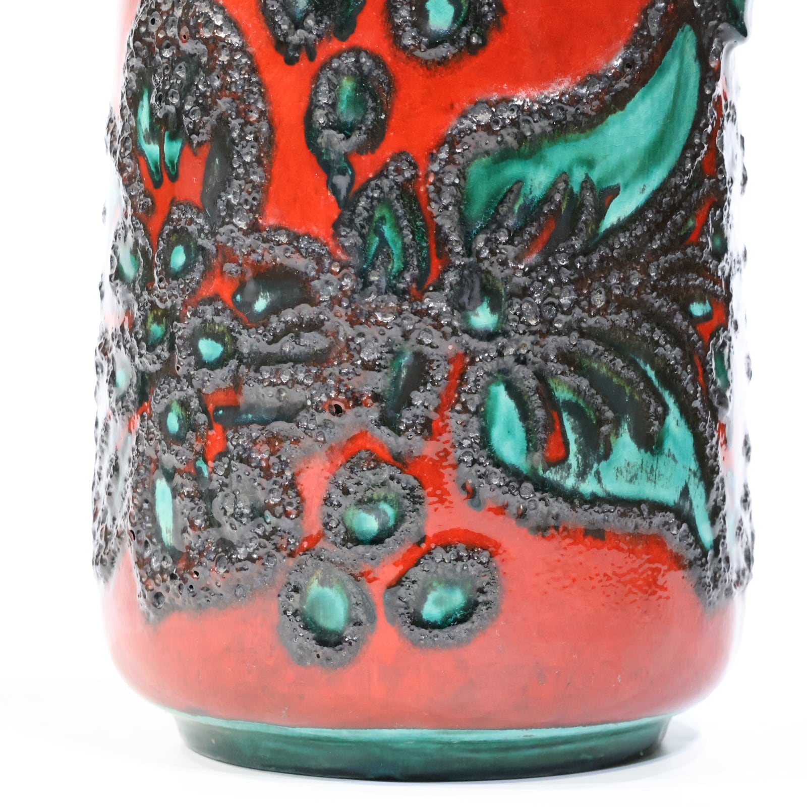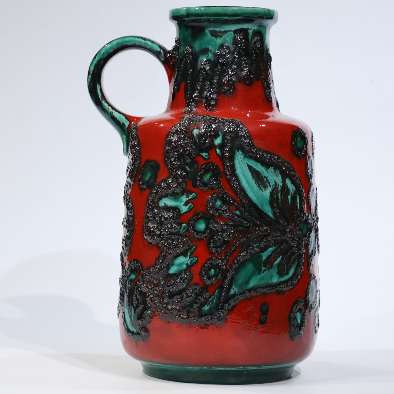 同社は急速に成長し、1950~80年代には陶 器製造の分野でドイツ最大のメーカーとなり、今日も確固たる地位を維持しています。形状に加えて釉薬でも、当時は最も幅広い品揃えを誇った他、輸出量も最大だったため、現在でも同社の製品はよく見られます。特に円筒形を基調にし たシンプルな形状で、型押し模様のある床置き 花瓶が代表的。色彩については当時主流だっ た赤やオレンジから、クリーム、ベージュ、茶色 などが多くを占めています。