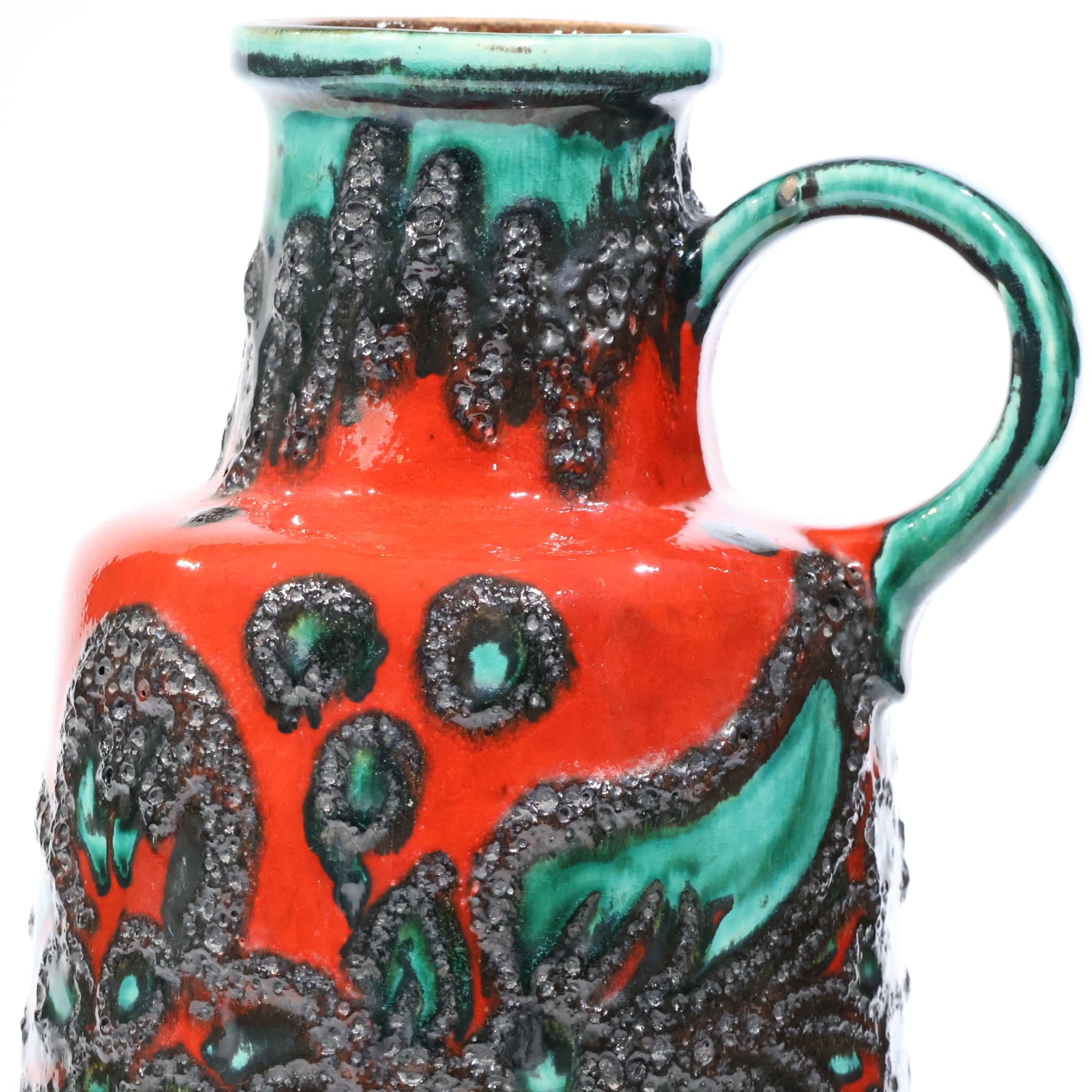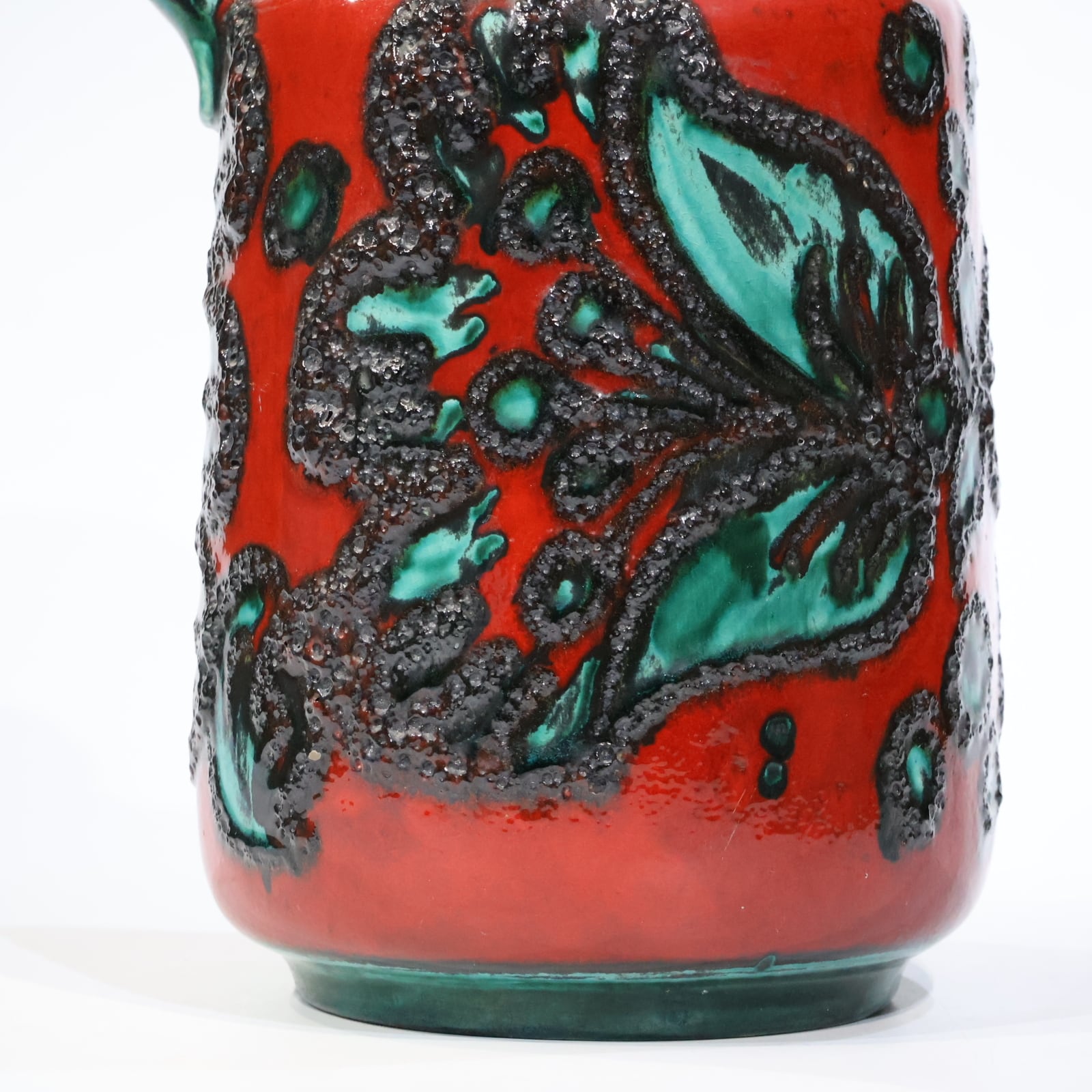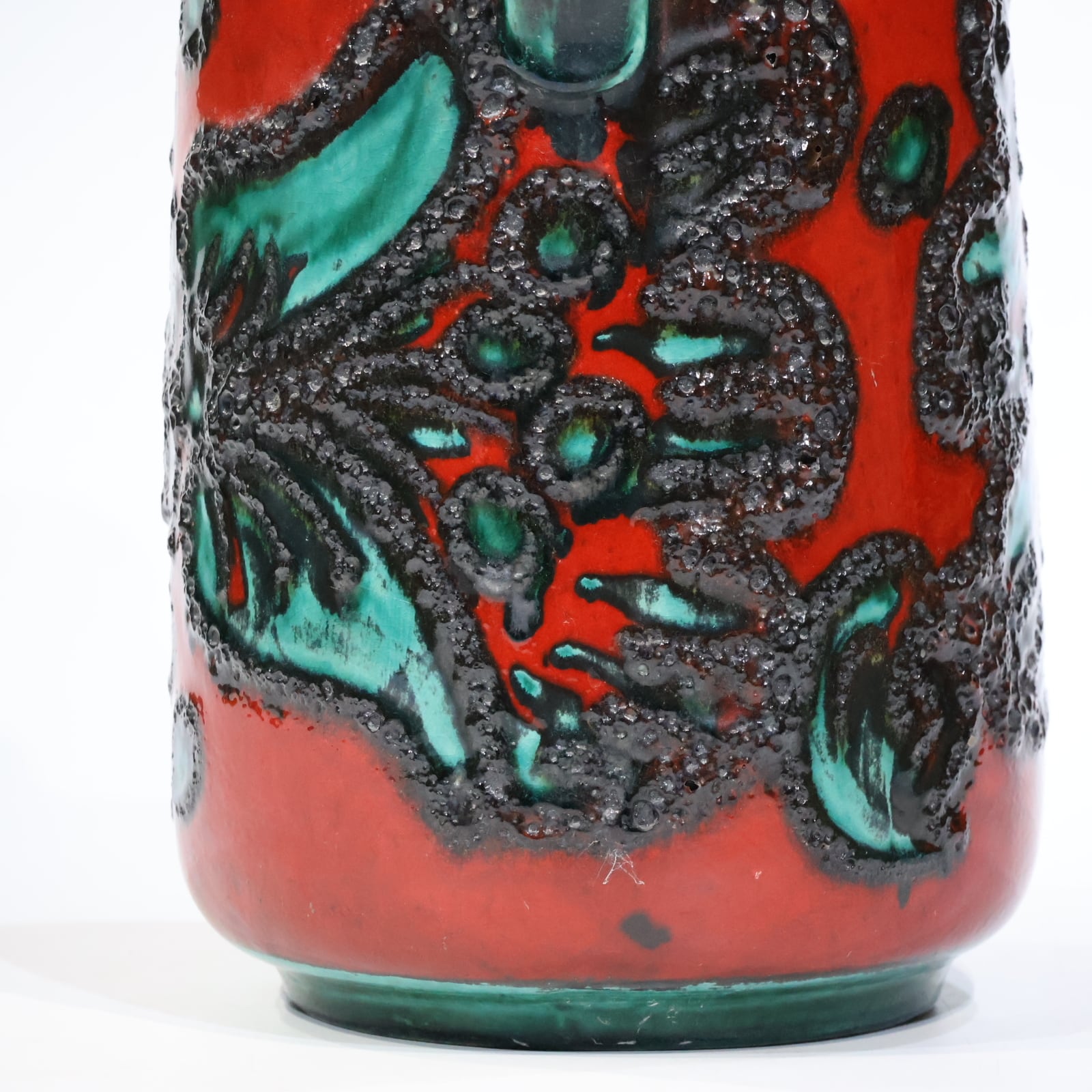 同社は急速に成長し、1950~80年代には陶 器製造の分野でドイツ最大のメーカーとなり、今日も確固たる地位を維持しています。形状に加えて釉薬でも、当時は最も幅広い品揃えを誇った他、輸出量も最大だったため、現在でも同社の製品はよく見られます。特に円筒形を基調にし たシンプルな形状で、型押し模様のある床置き 花瓶が代表的。色彩については当時主流だっ た赤やオレンジから、クリーム、ベージュ、茶色 などが多くを占めています。
