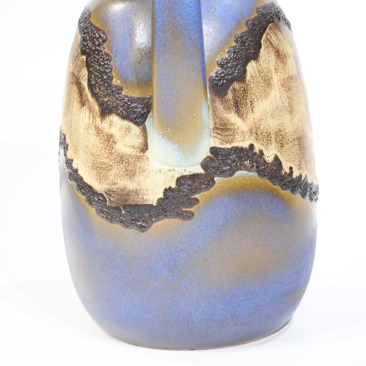 深いブルーとブラウンが織りなすマットなグラデーションの中に、ざらりとした黒釉とベージュの釉薬が山並みのように立ち現れる独特の装飾が施されています。
