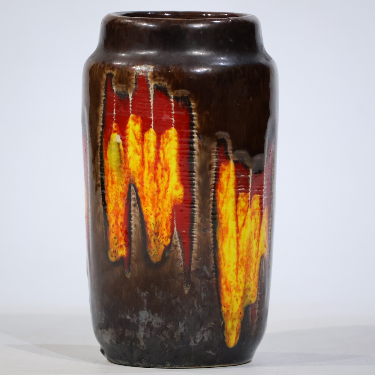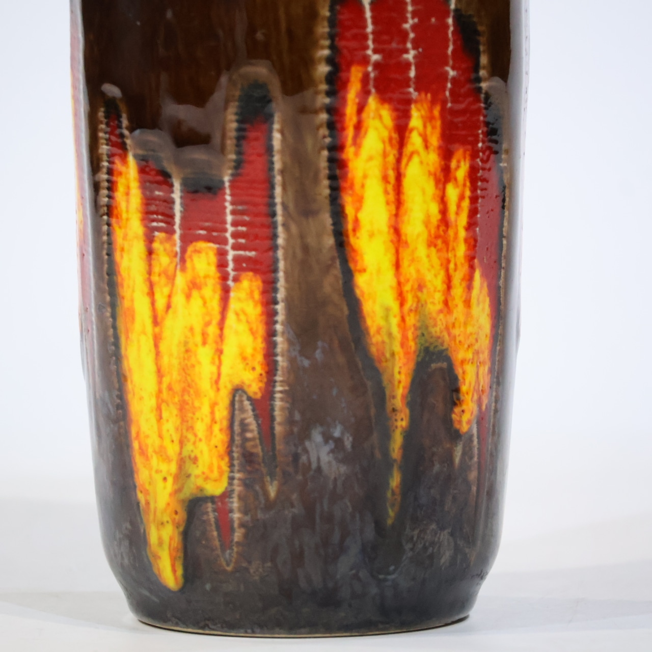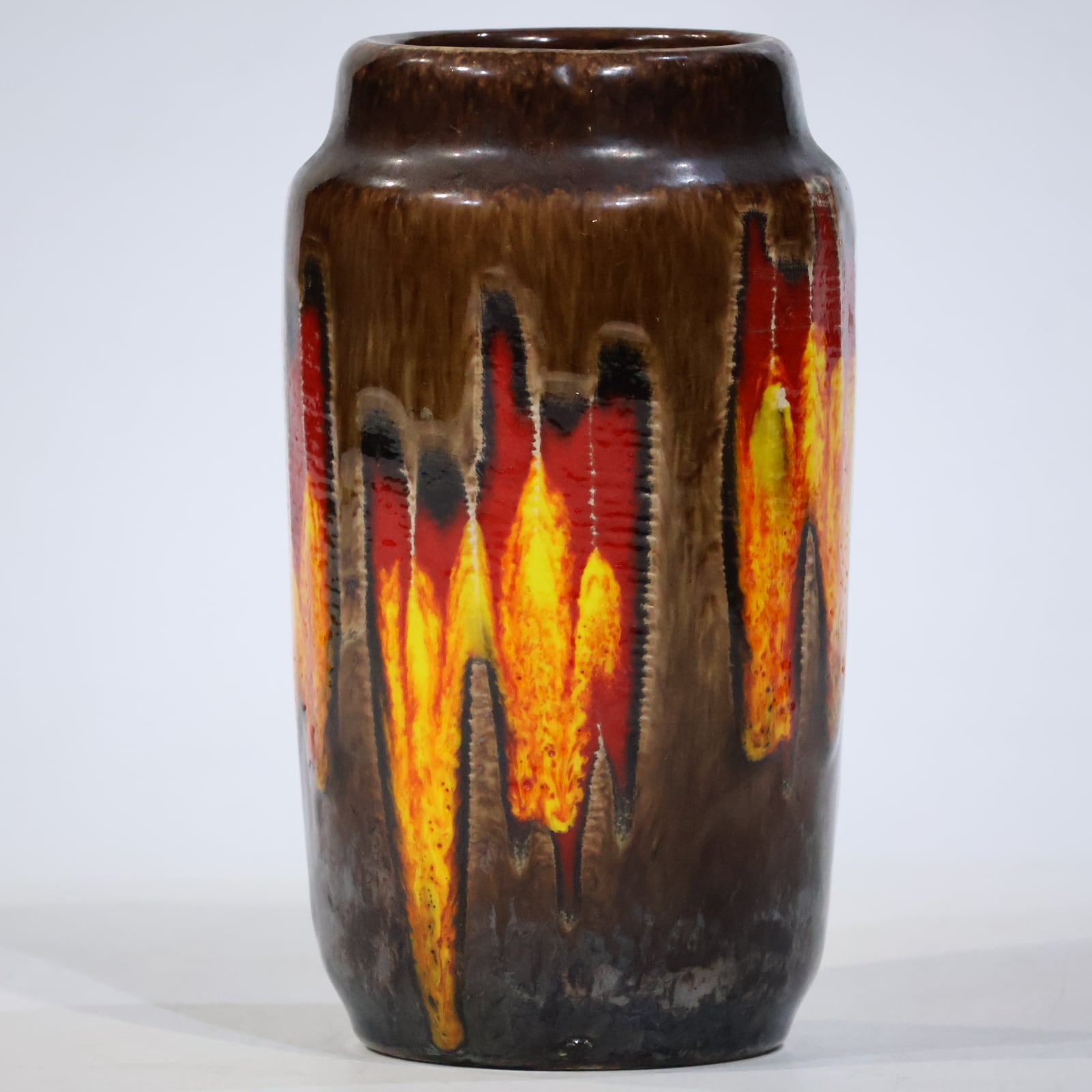 深みのあるブラウンの地に、赤と黄色の釉薬が大胆に流れ落ちるような表情を見せる、Scheurich社製の一点。