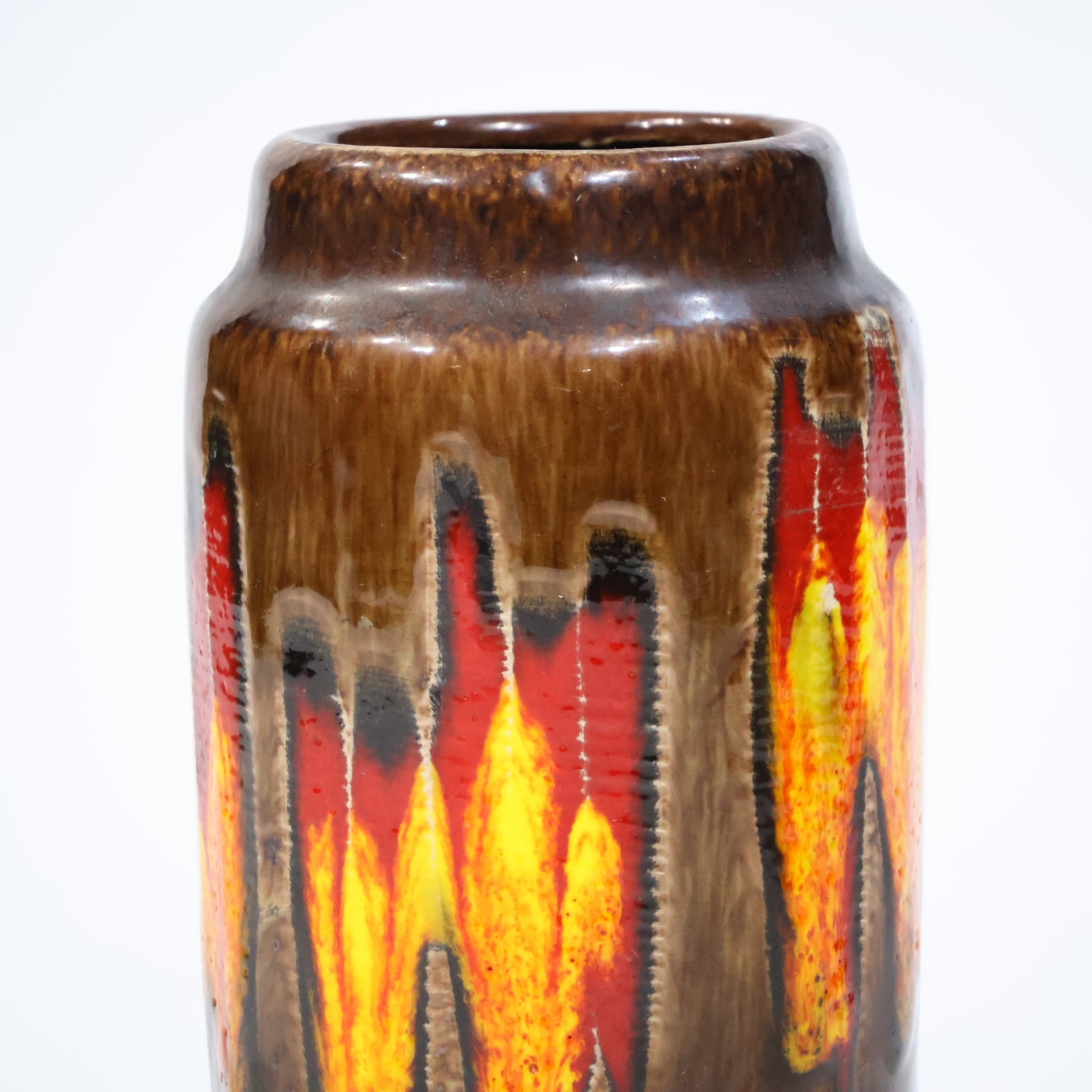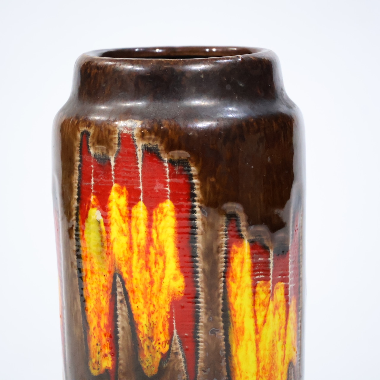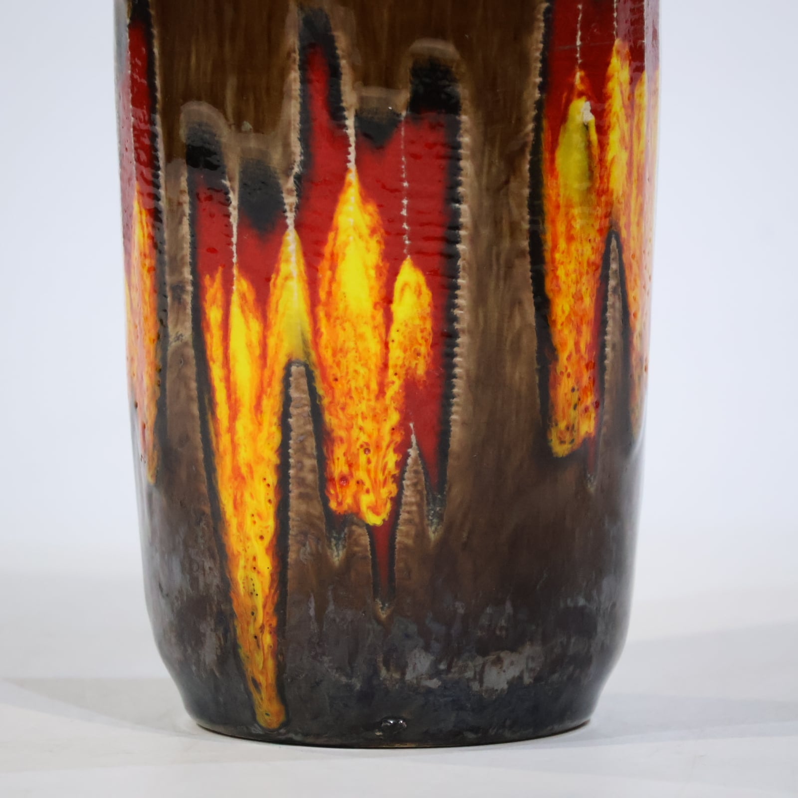 深みのあるブラウンの地に、赤と黄色の釉薬が大胆に流れ落ちるような表情を見せる、Scheurich社製の一点。