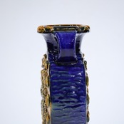 1960年代後半には一目で見分けがつく銅色の釉薬を開発し、ベージュの色調や泡状の滴る溶岩釉との組み合わせがよく用いられていました。