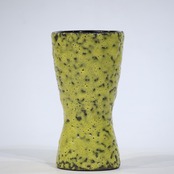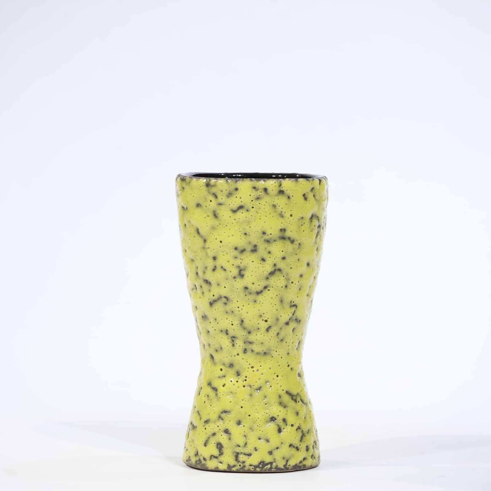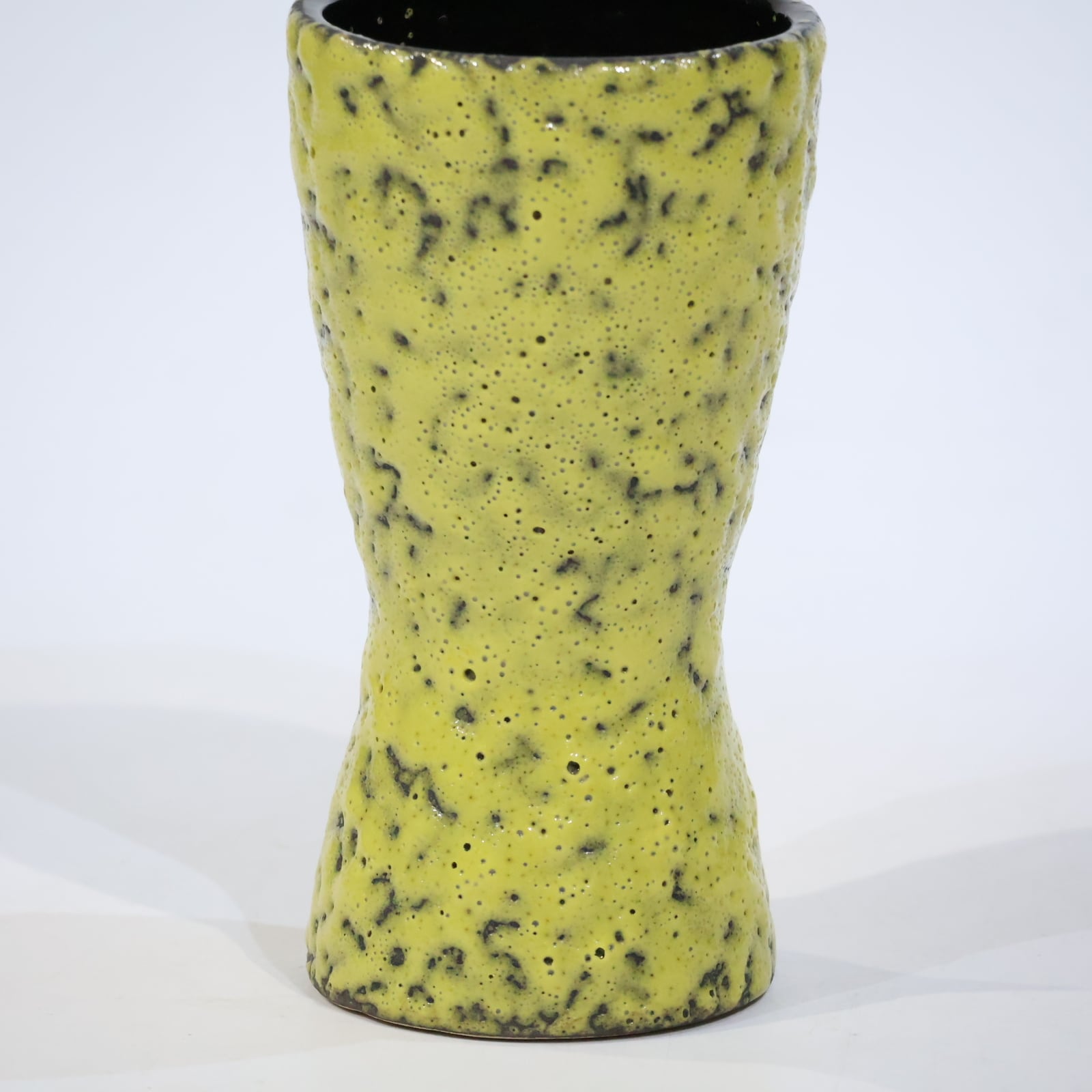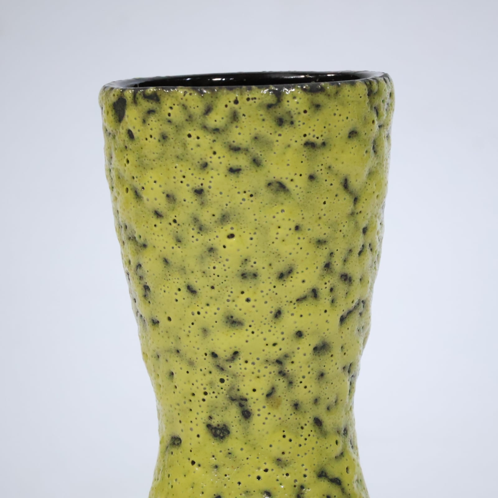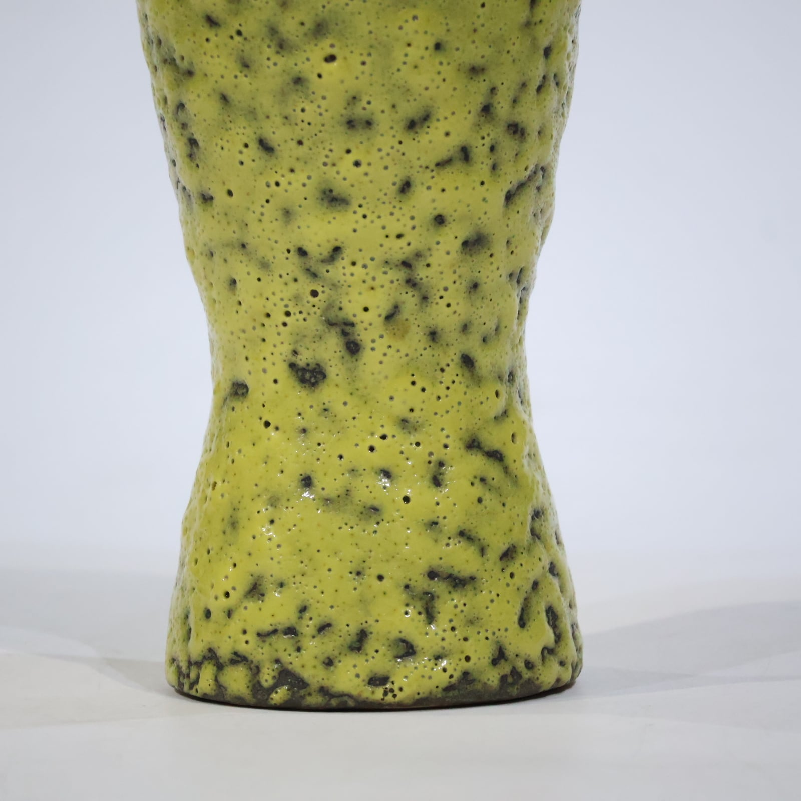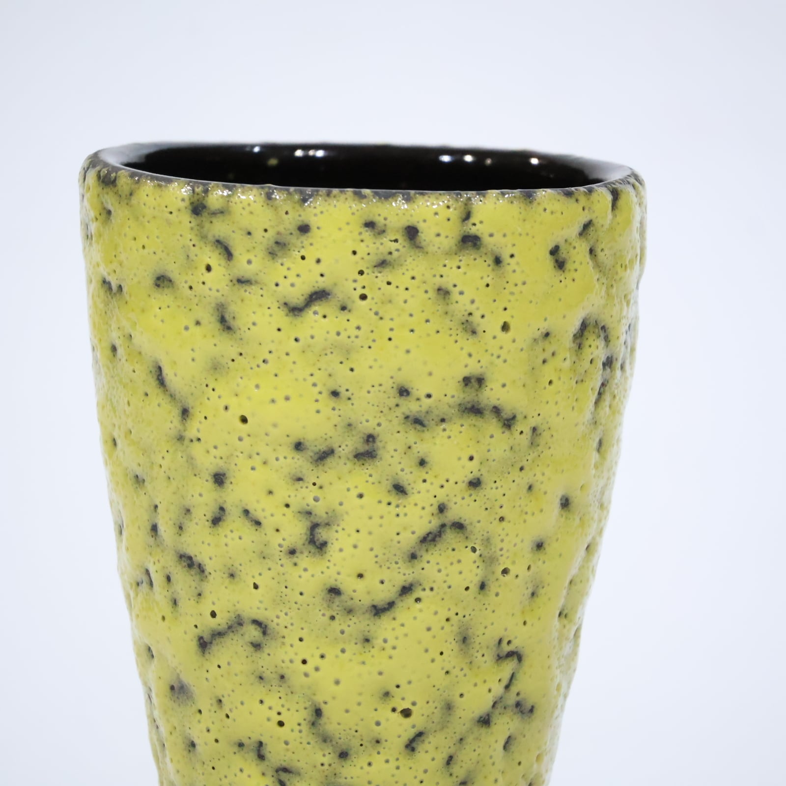 ホルンのようにくびれた独特のシルエットに、鮮烈なライムイエローのマット釉が施された印象的な一点。釉薬には黒い結晶粒のようなざらつきがあり、溶岩を思わせるテクスチャが特徴的です。手に取ると軽やかさがありつつも、Scheurichらしい技術の高さが随所に感じられます。