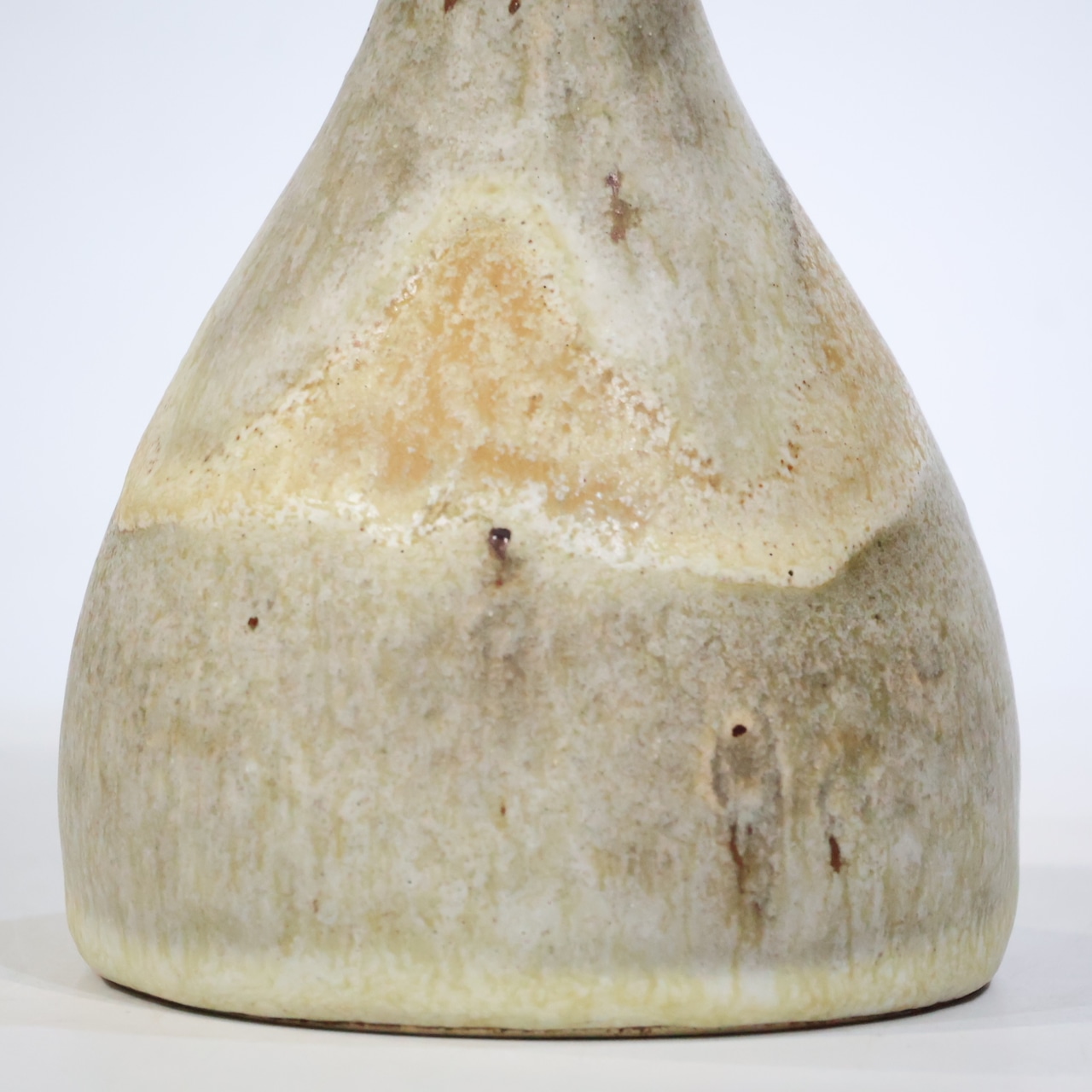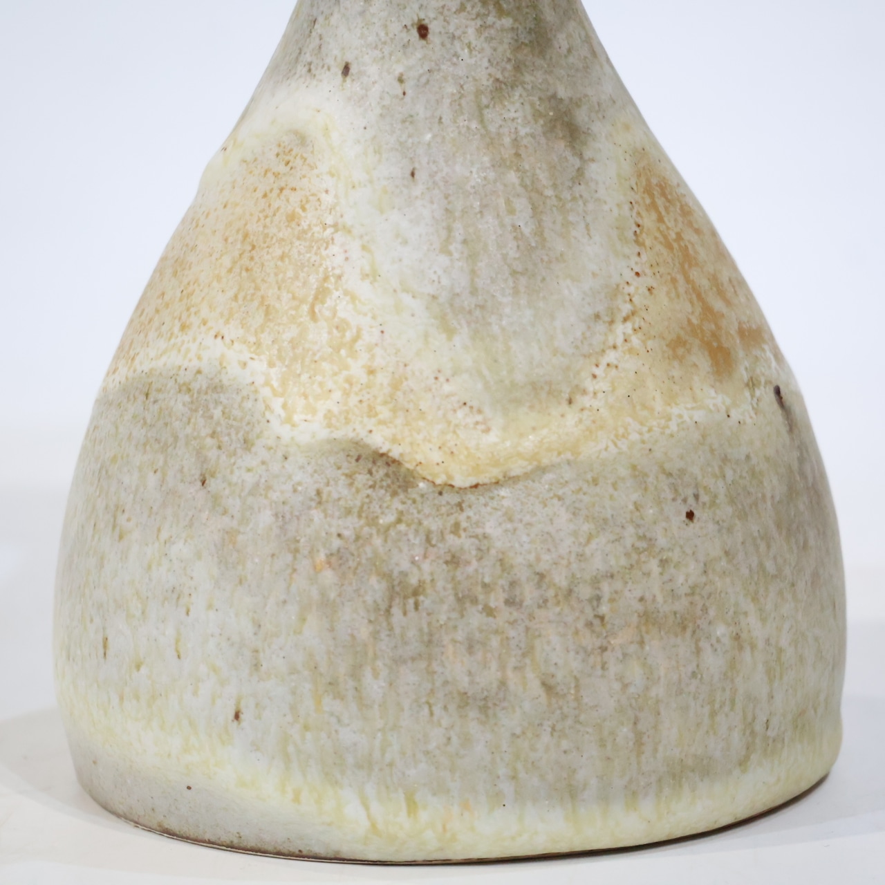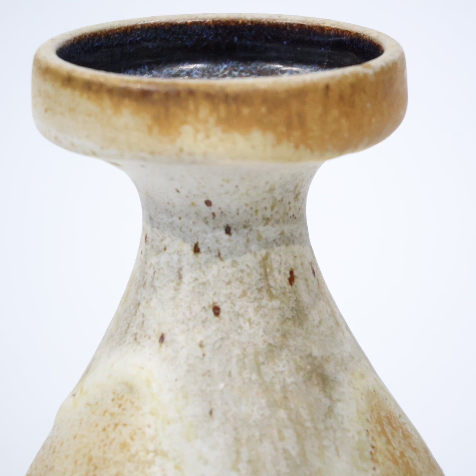 すらりと立ち上がるボディラインから、口元でふわりと開いた円盤状の縁まで、非常にバランスの取れたシルエット。装飾性を抑えたミニマルな造形だからこそ、釉薬の微細な表情が際立ちます。