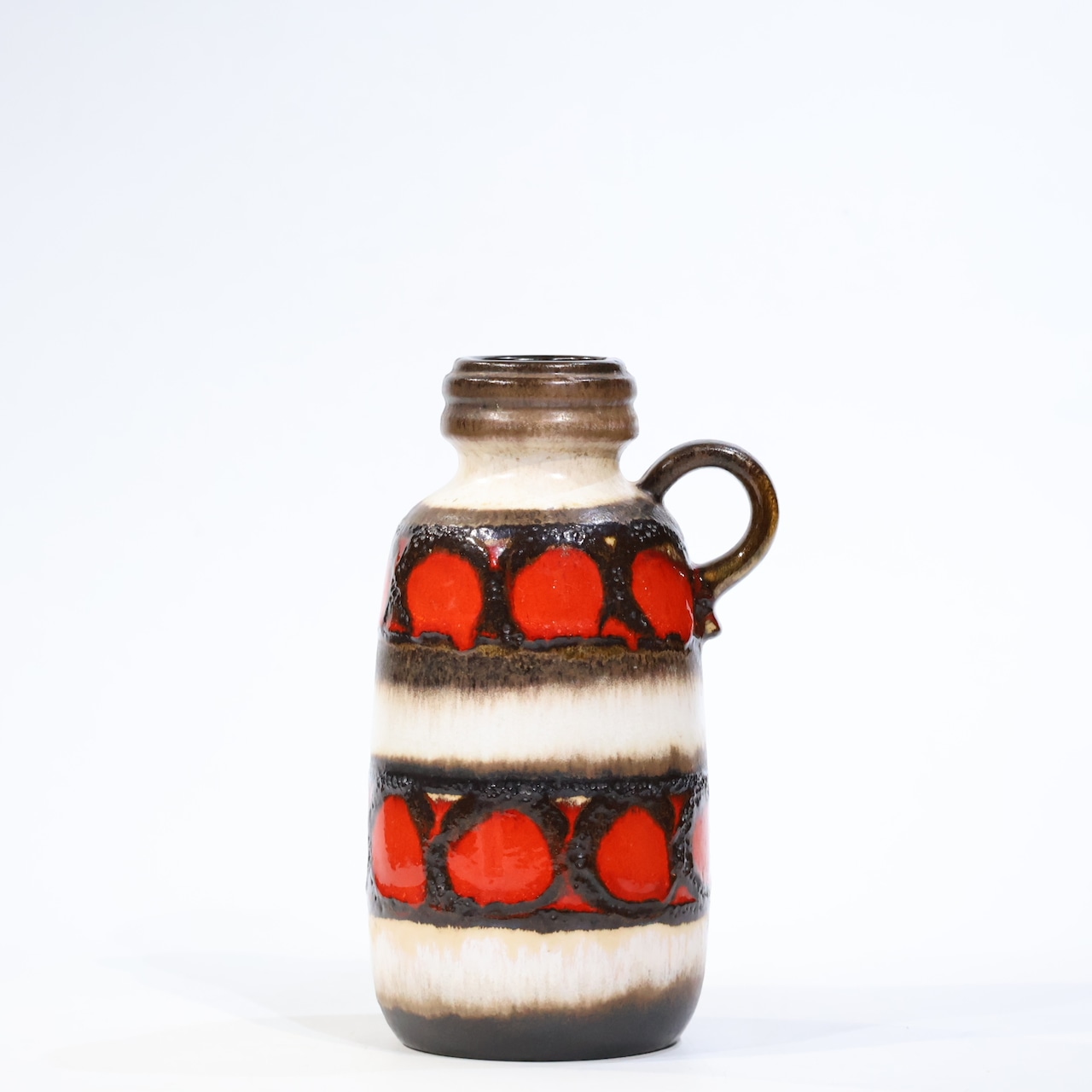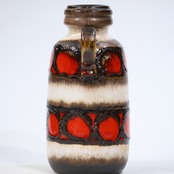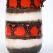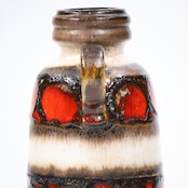同社は急速に成長し、1950~80年代には陶 器製造の分野でドイツ最大のメーカーとなり、今日も確固たる地位を維持しています。形状に加えて釉薬でも、当時は最も幅広い品揃えを誇った他、輸出量も最大だったため、現在でも同社の製品はよく見られます。特に円筒形を基調にし たシンプルな形状で、型押し模様のある床置き 花瓶が代表的。色彩については当時主流だっ た赤やオレンジから、クリーム、ベージュ、茶色 などが多くを占めています。