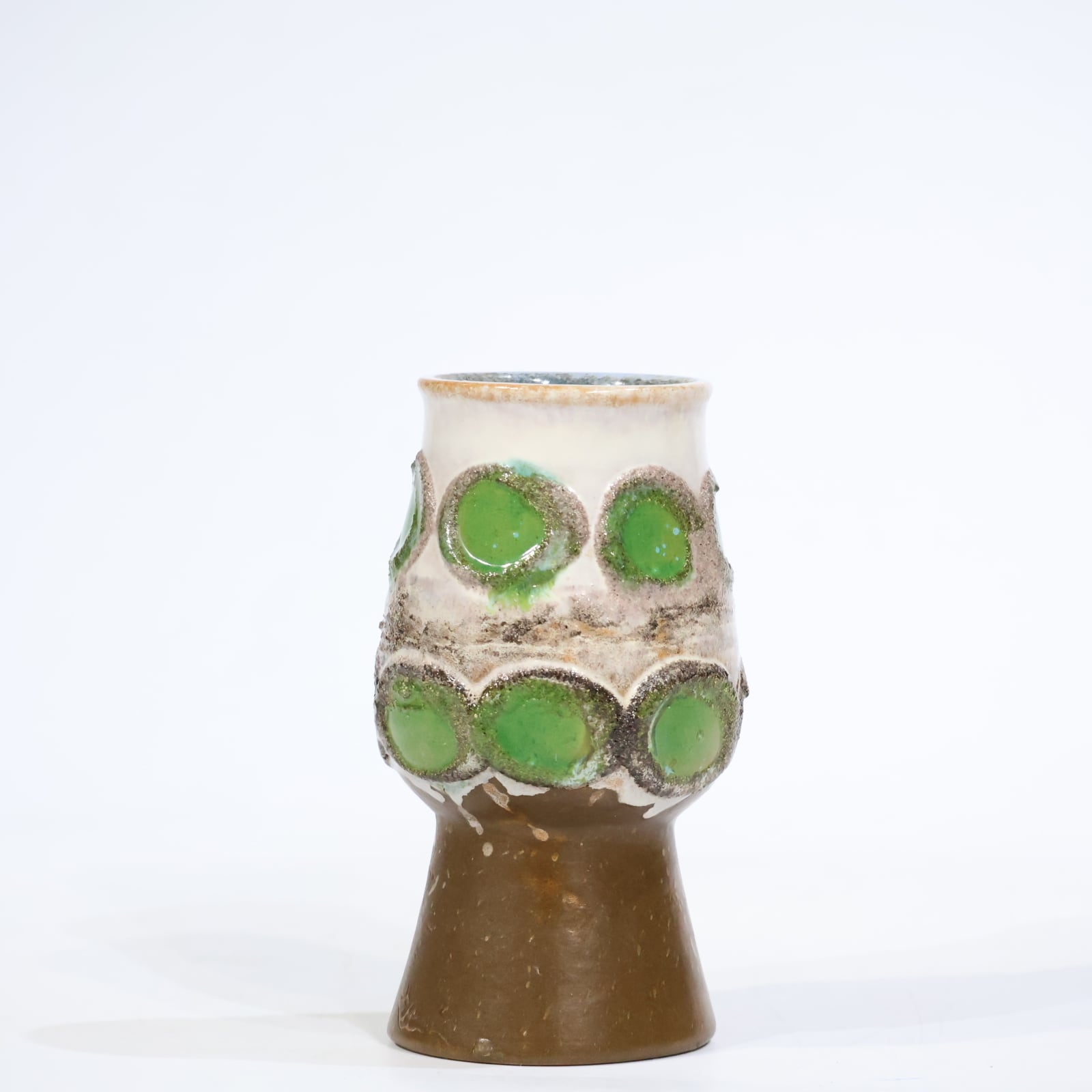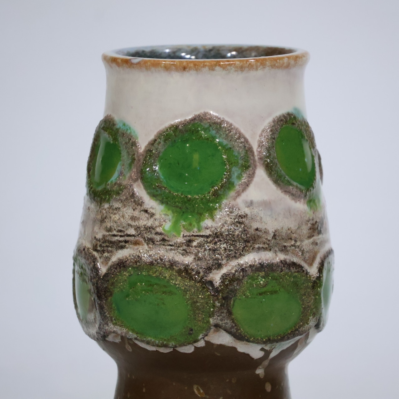 アイボリーの釉薬に浮かび上がる、艶やかなグリーンの丸模様。