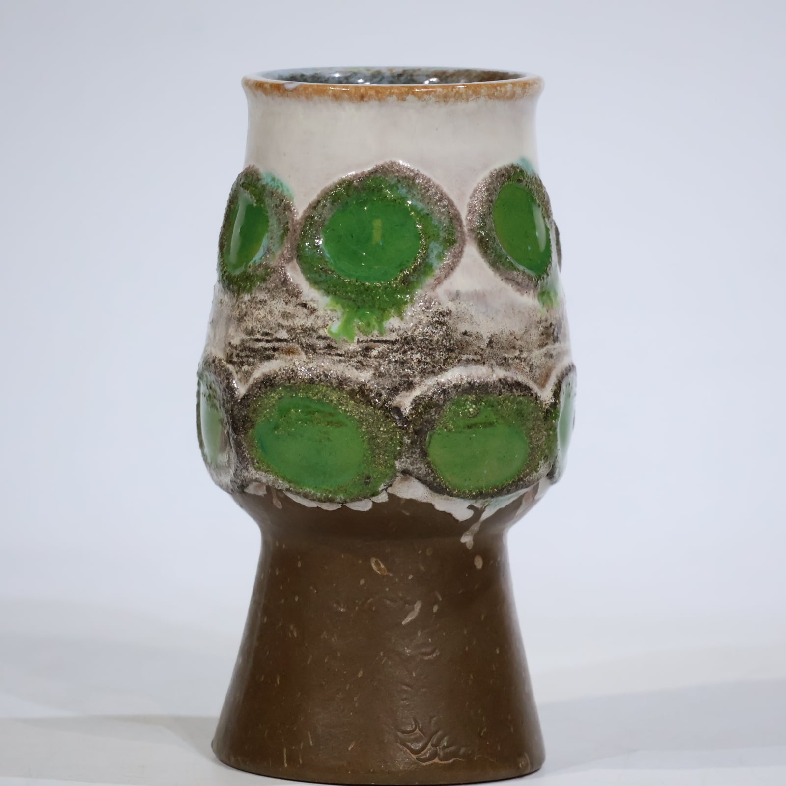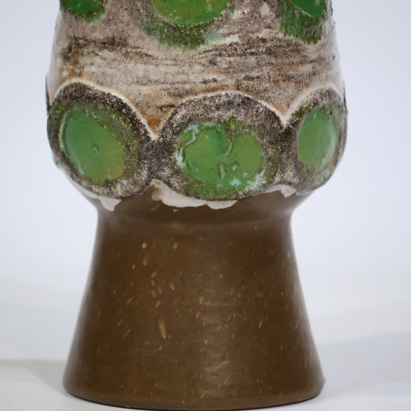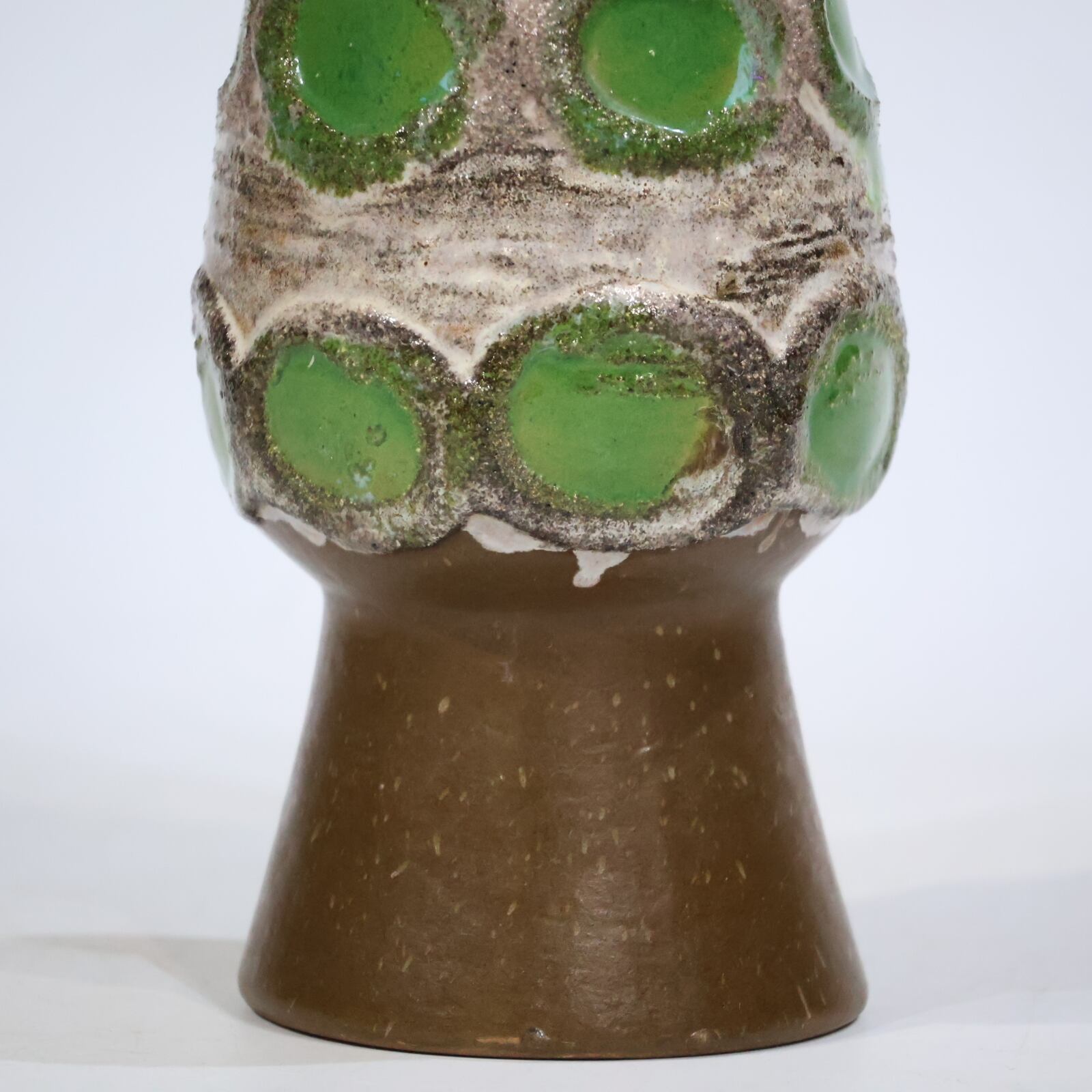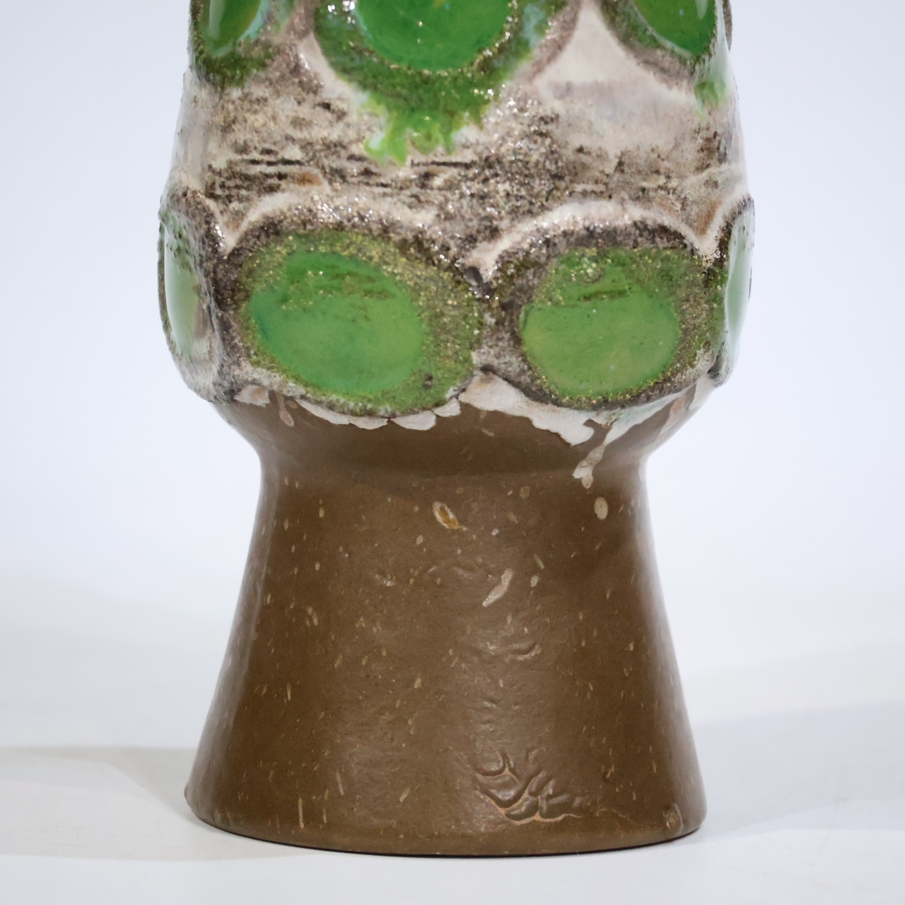 Strehlaの作品は、60年代後半から70年代にかけて、手作業で追加されたチューブで裏打ちされたFat Lava釉薬を使用した装飾によって特徴づけられました。ほとんどの作品には「Strehla」と刻印されたインクが刻印されており、ベースには型番が刻印されています。おそらく生産の多くが輸出されたので、アイテムは西ドイツの商品よりドイツで見つけるのが難しいです。