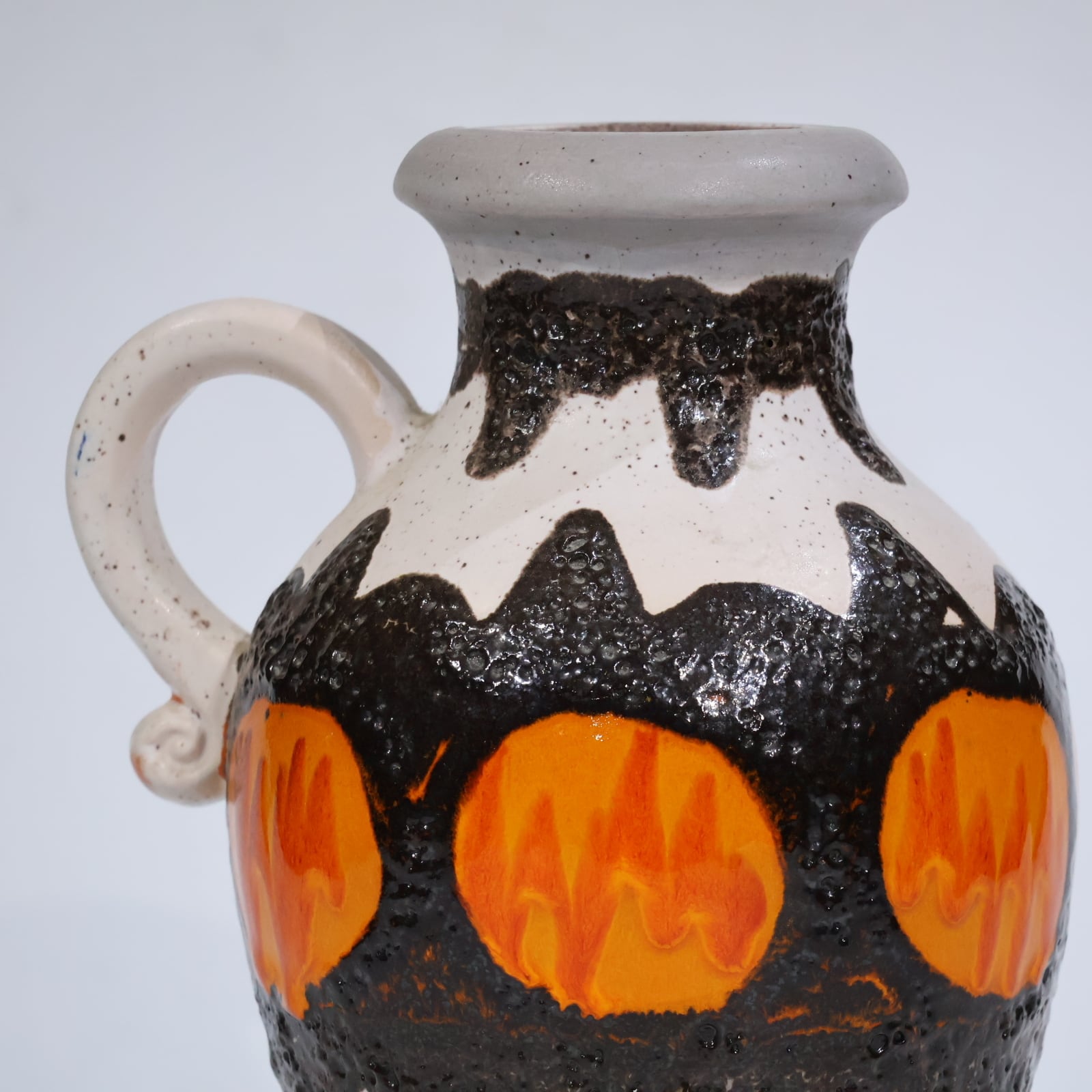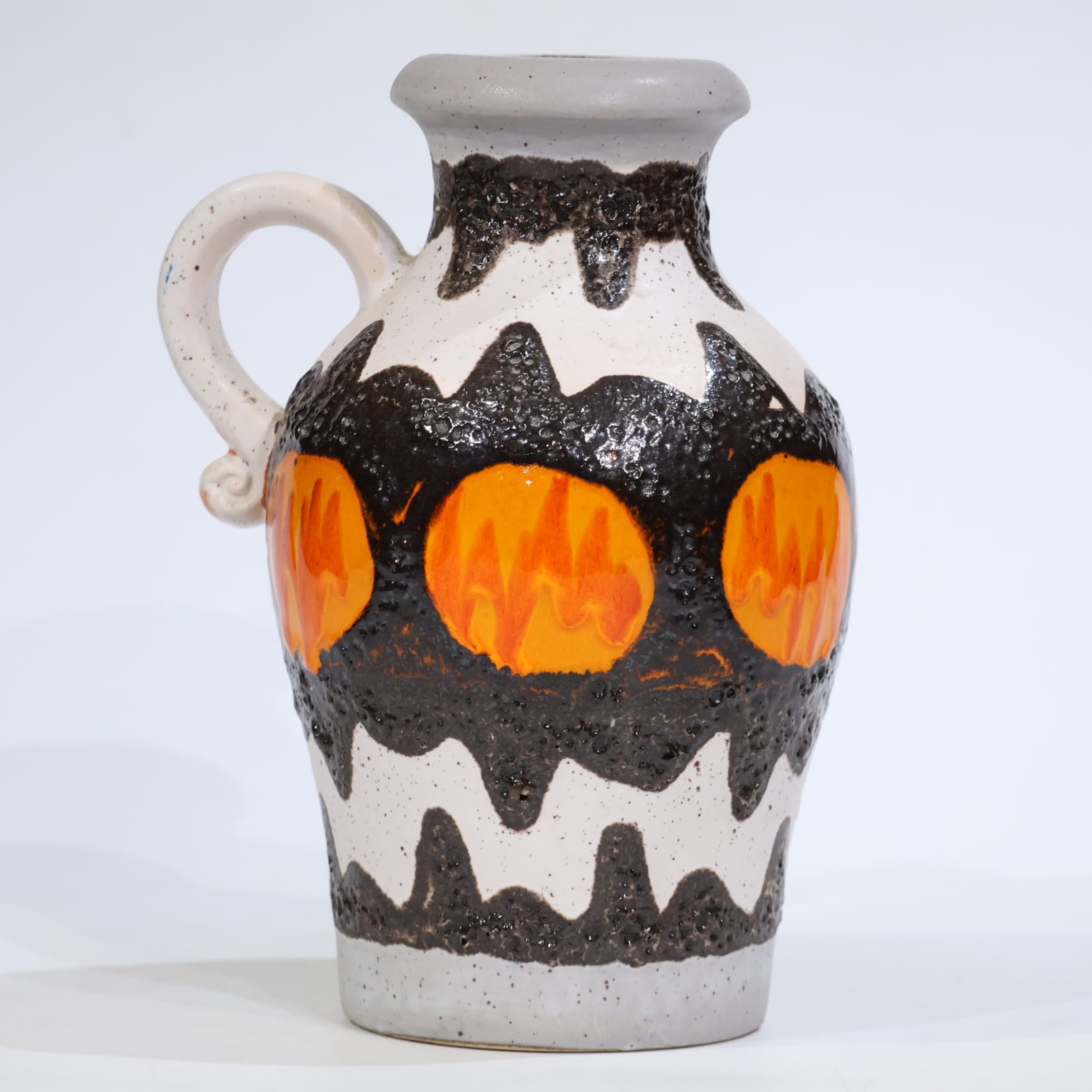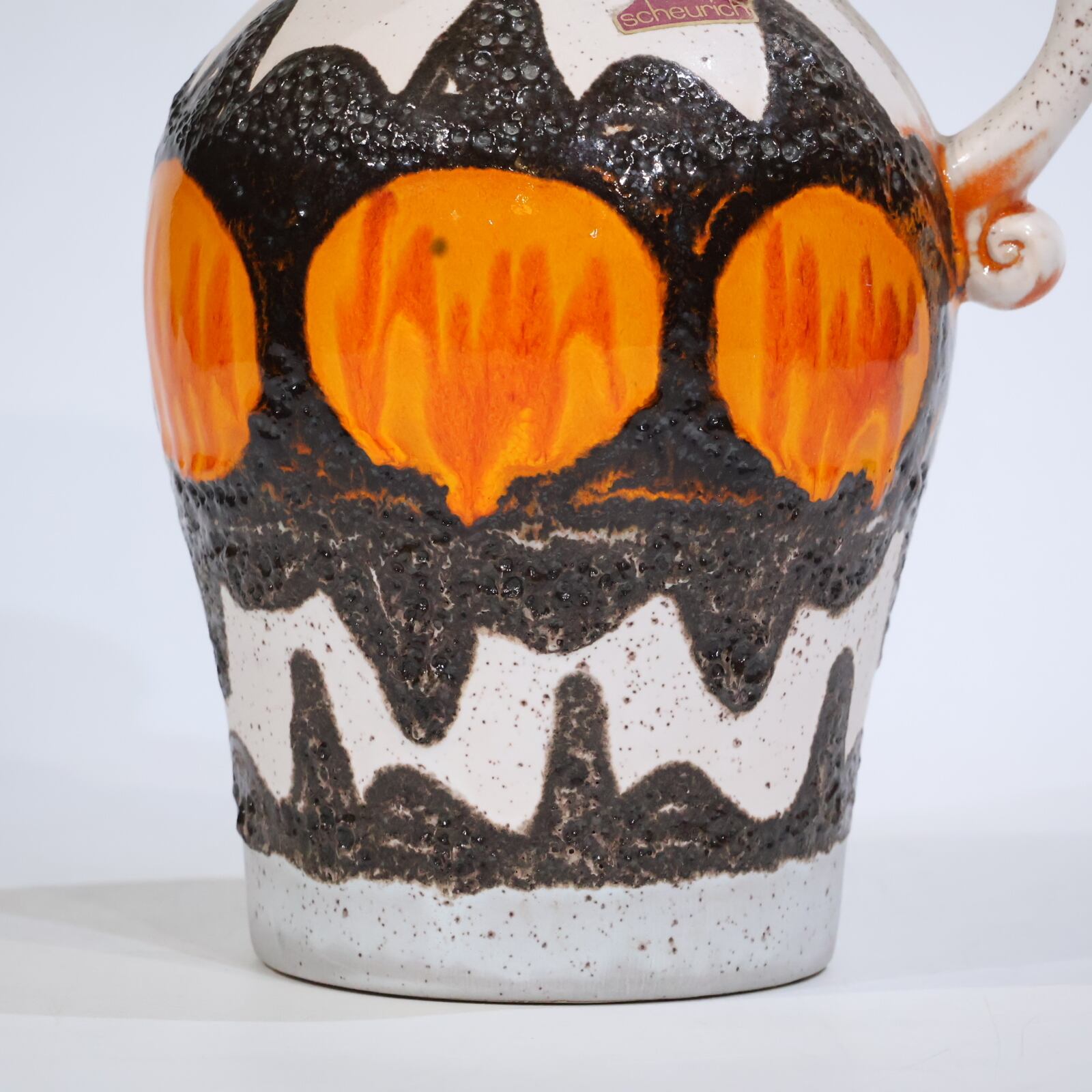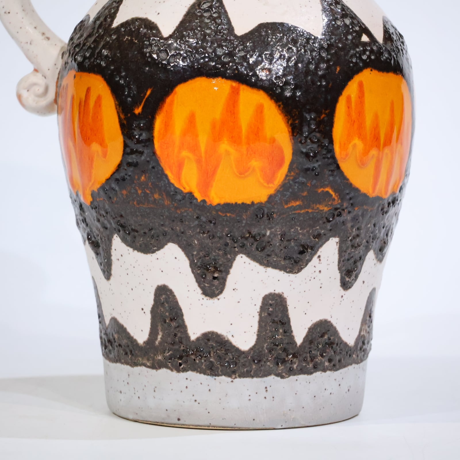 アイボリーの素地に、黒く火山のように盛り上がる溶岩釉と、オレンジのフレイムモチーフが連なる印象的な装飾が特徴です。特に胴部の丸く膨らんだシルエットと、持ち手先端のくるりと巻いた装飾が愛らしく、Scheurichらしい遊び心が感じられます。